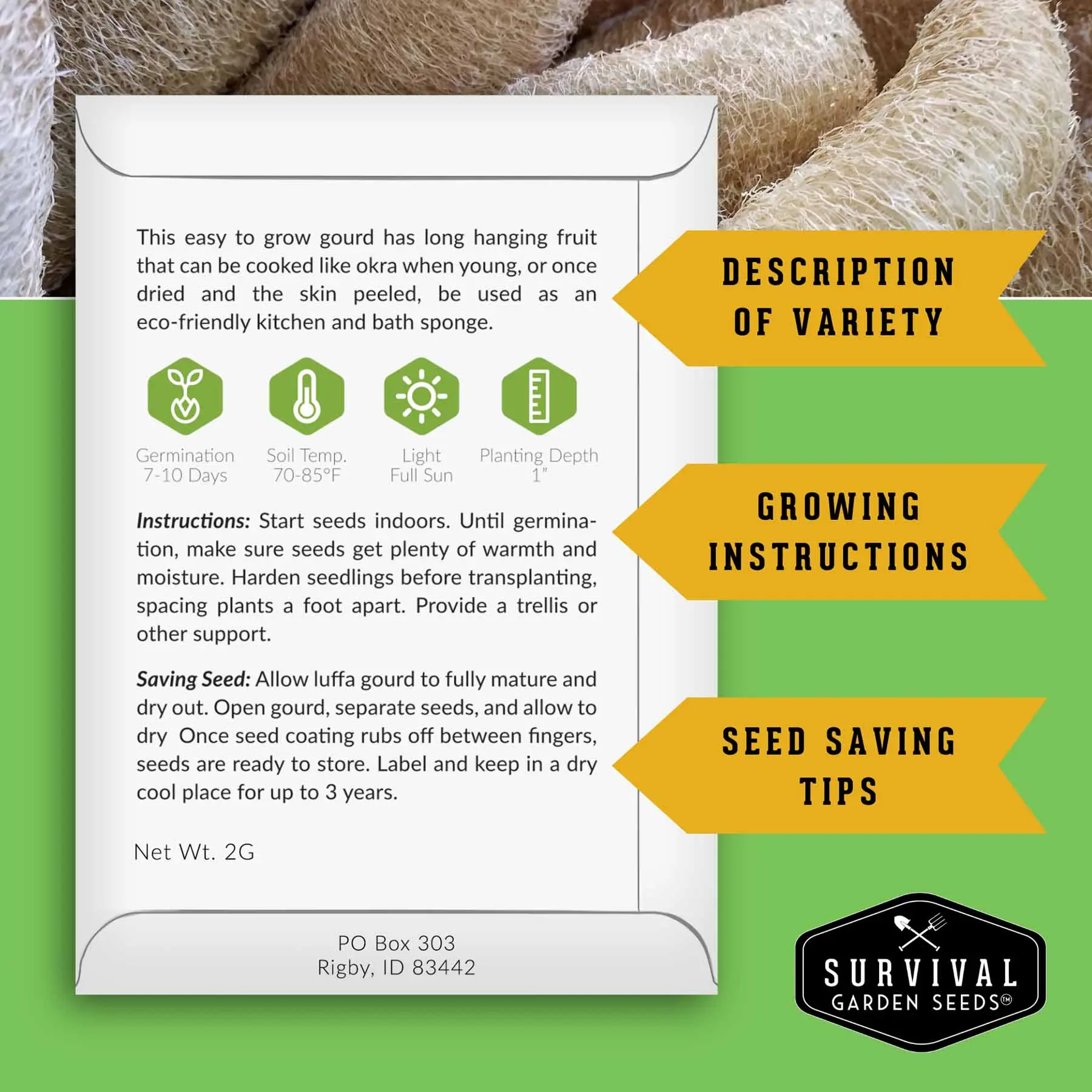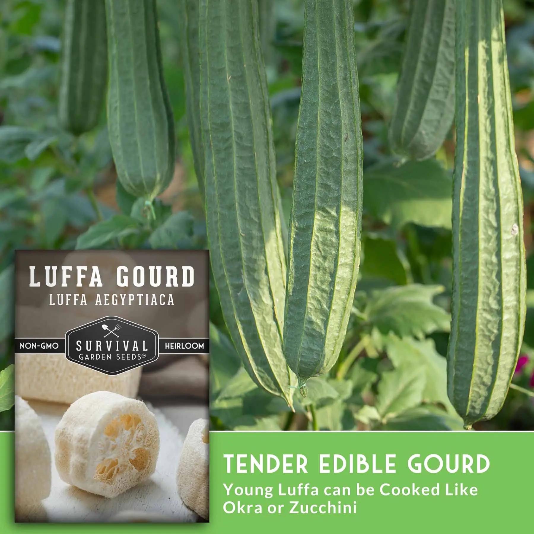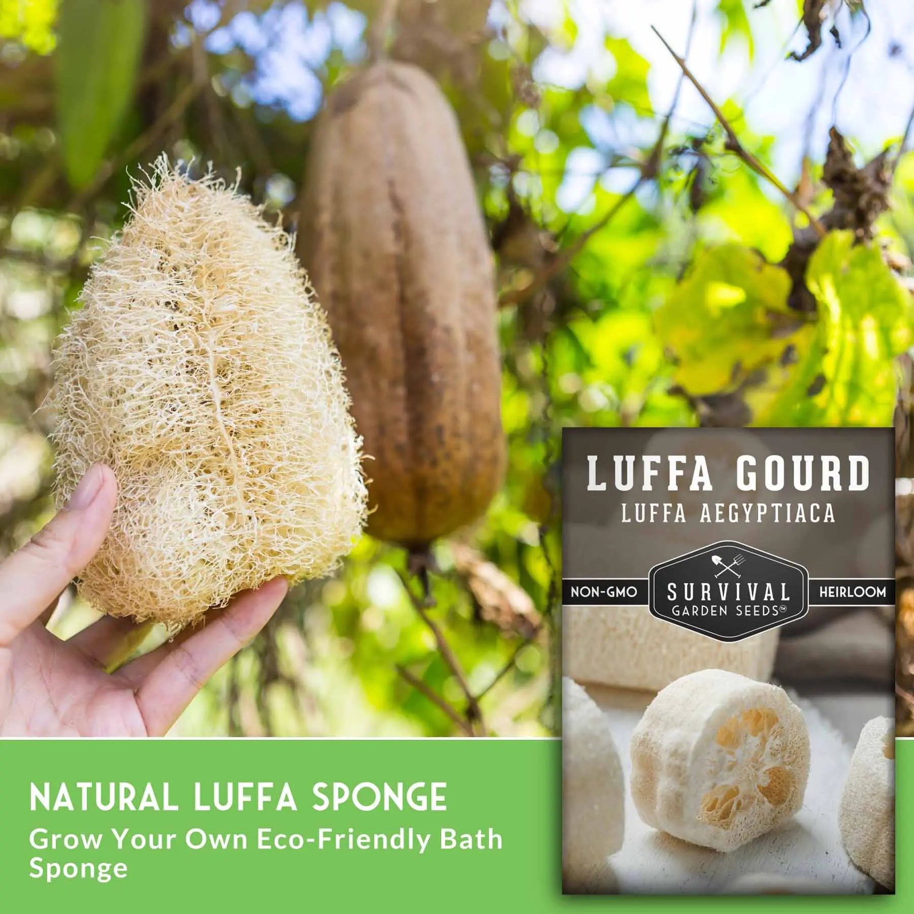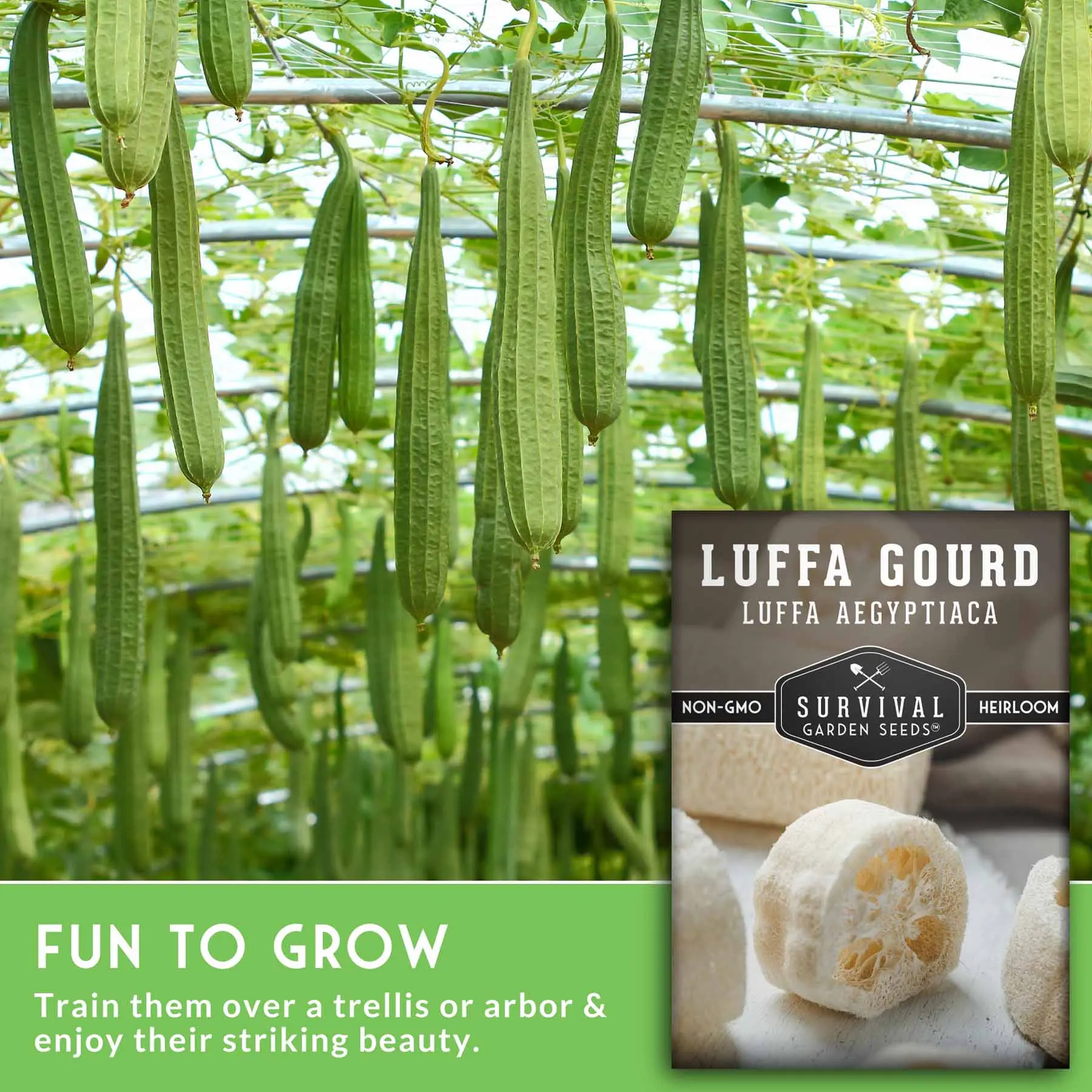 Survival Garden Seeds Luffa Seeds or Loofah Sponge Seeds are a fun way to save money. Grow your own loofah sponges and to replace plastic poofs and synthetic sponges. A fun plant for the whole family to enjoy. Gourds can be harvested and eaten like okra when immature.