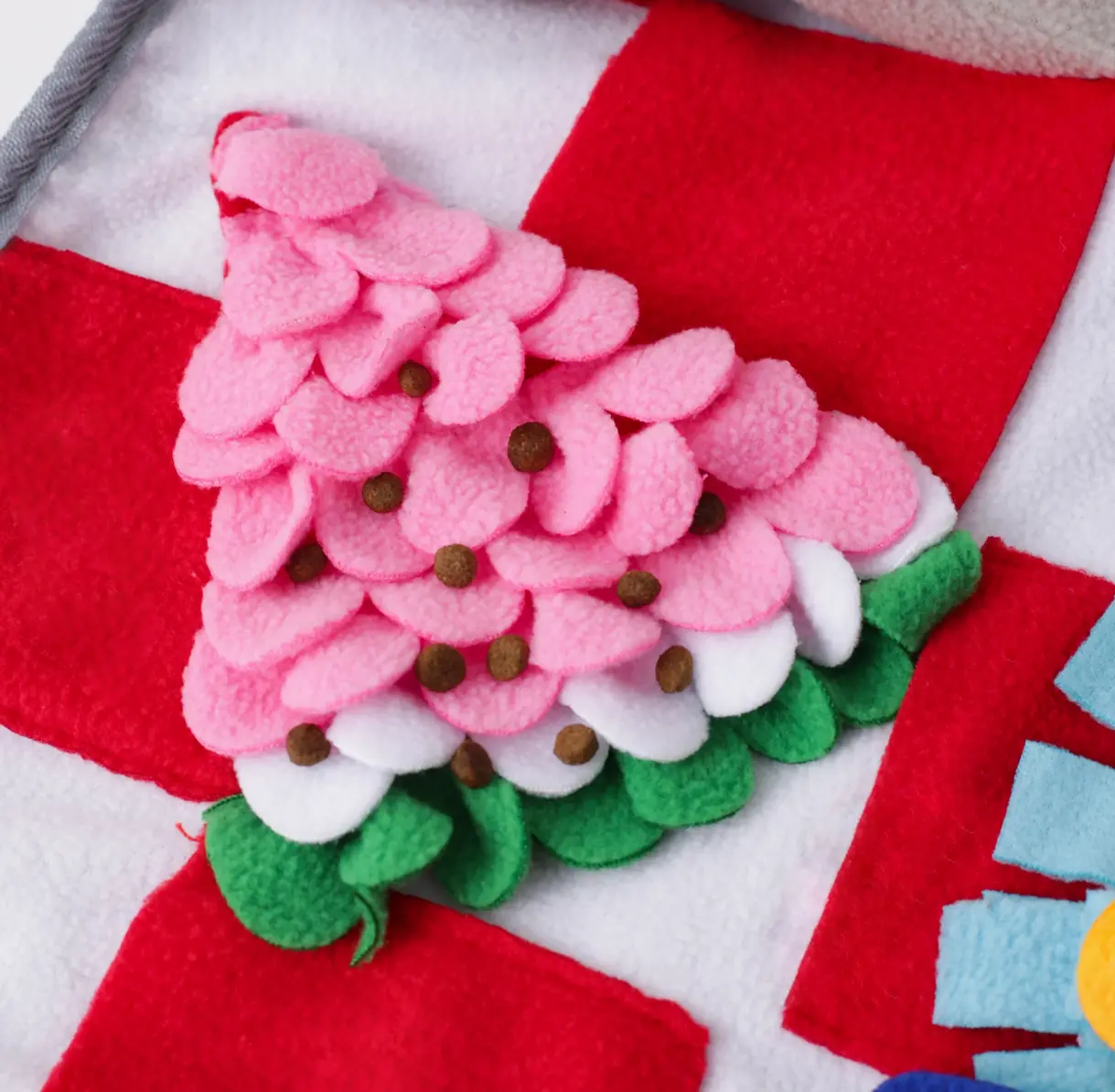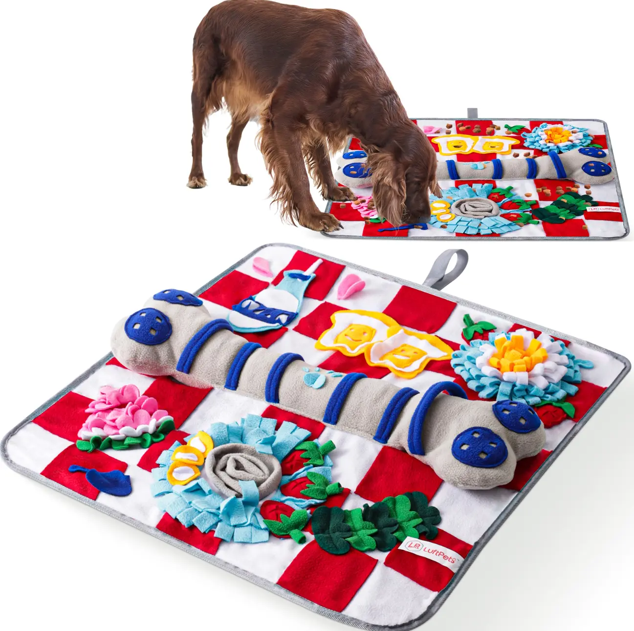 The snuffle mat measures 24" x 24" square and features a non-slip grip texture on the bottom to prevent movement. Machine washable, and easily rolls up or can be hung up with the hang tag for on the go usage!