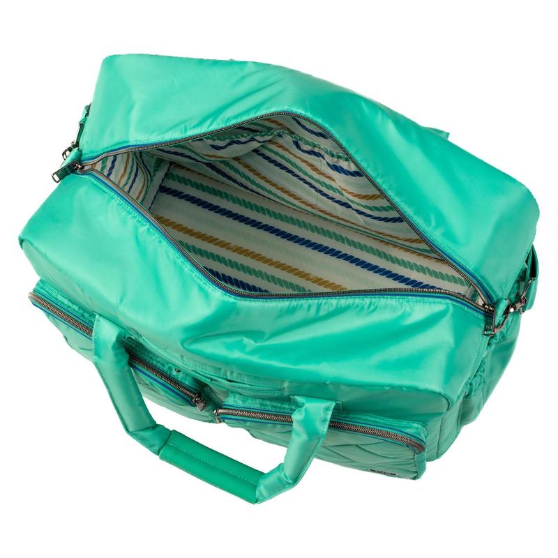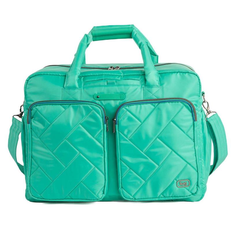 ·Main zipper compartment, two front zipper compartments, soft-lined slip pocket with magnetic closure, two side gusseted cargo pockets, back zipper compartment, two padded tote handles, removable crossbody strap, trolley sleeve, metal feet