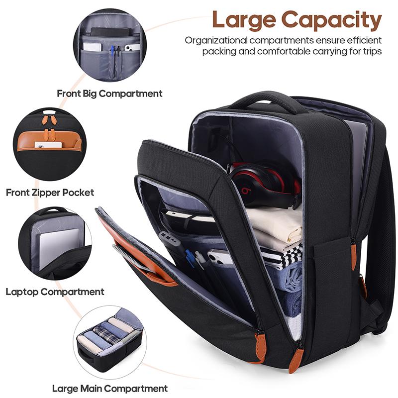 Two polyester-lined compartments with dividers/packing straps. Backpack includes a laptop sleeve + pockets.