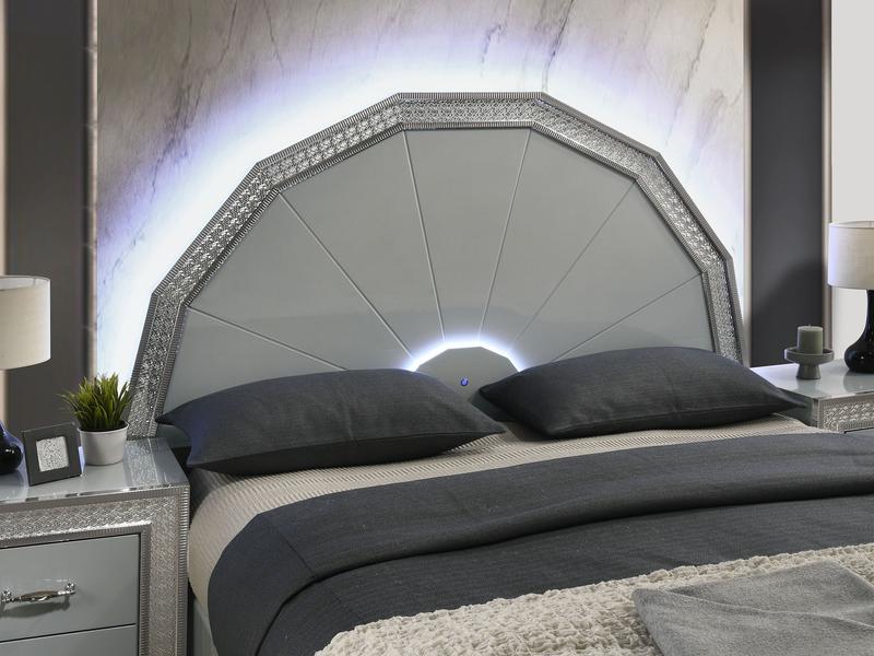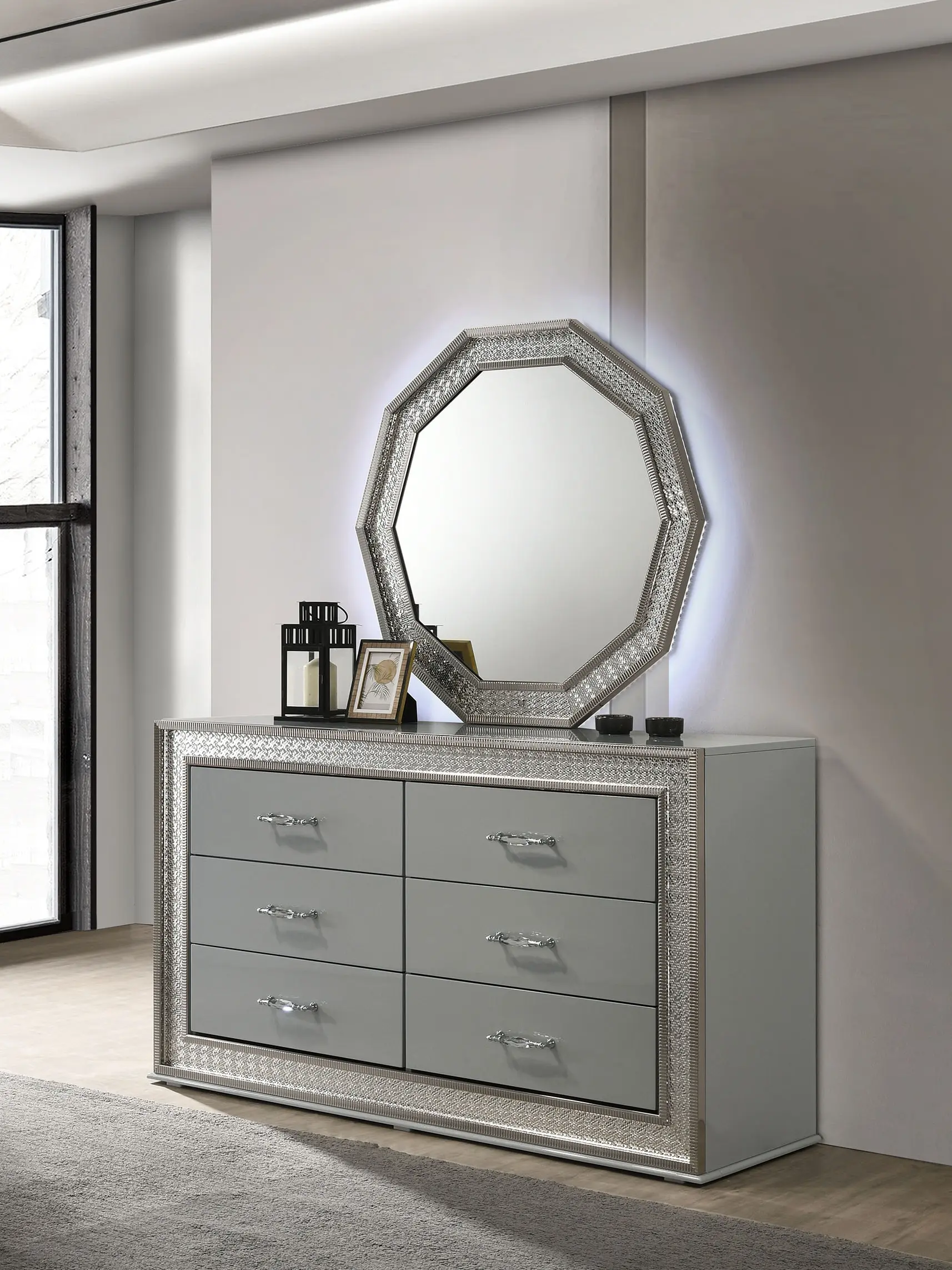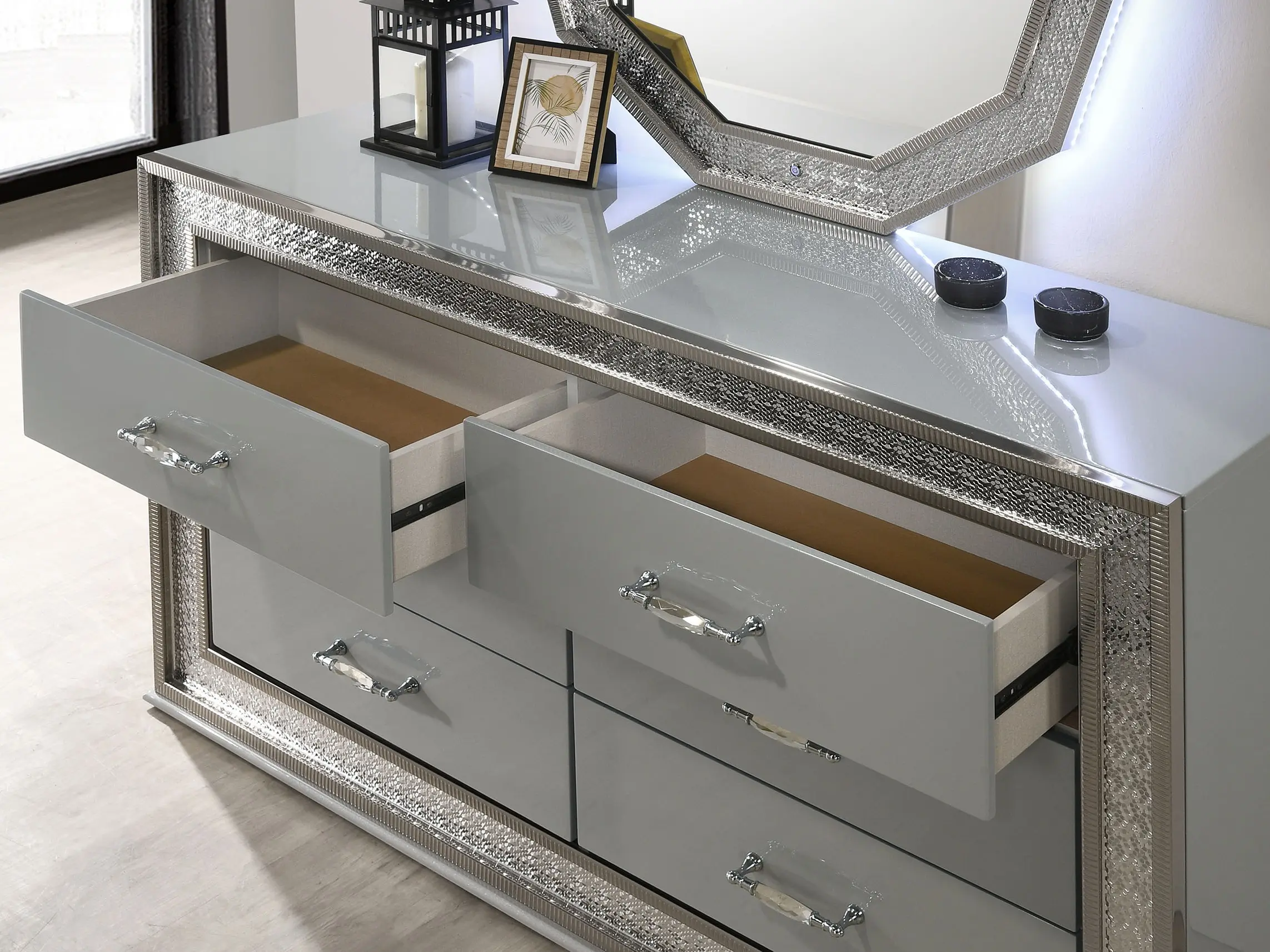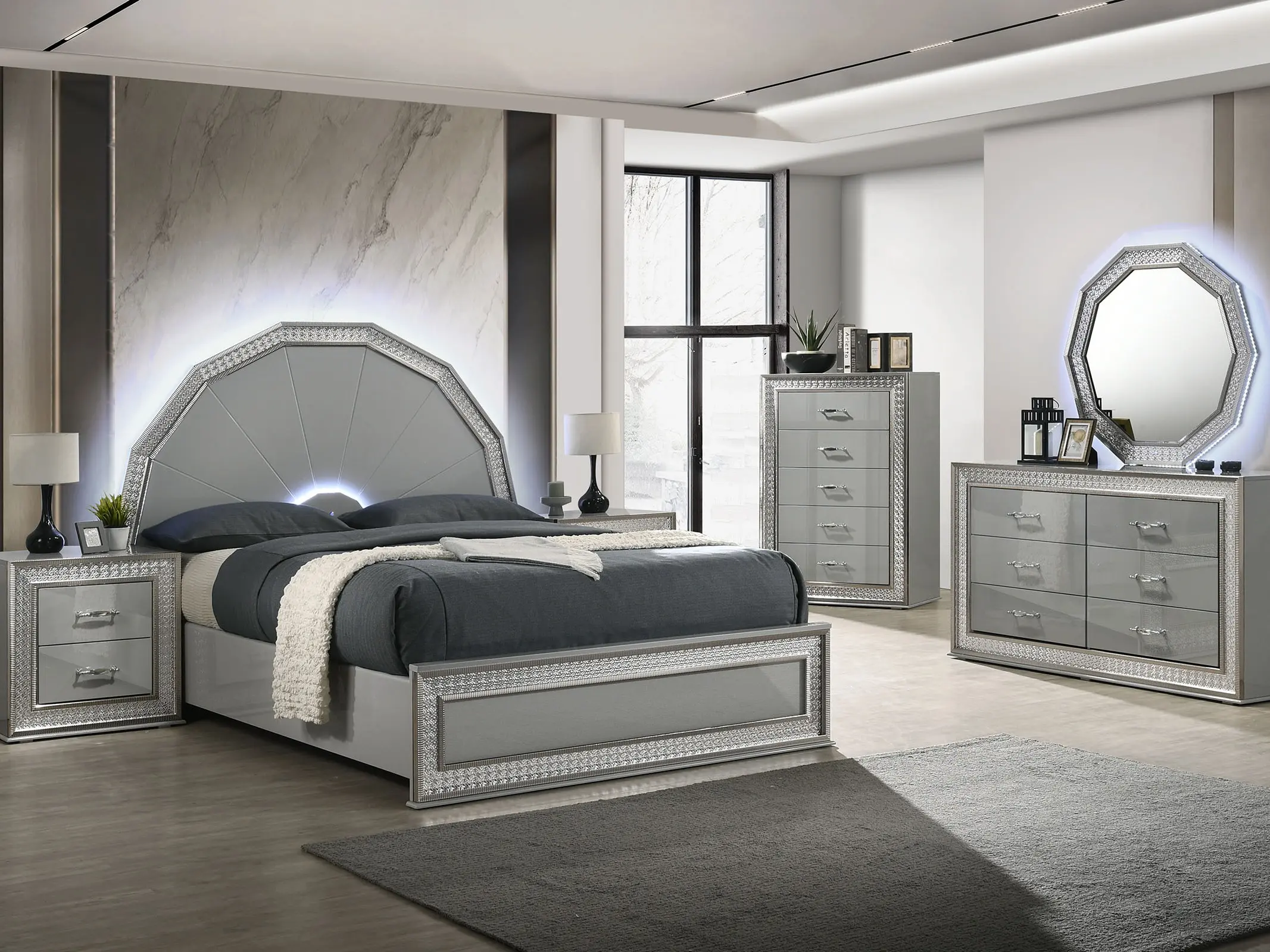 Elevate your bedroom with the Lumière LED Glam Bed or Bedroom Set, blending modern elegance with glamour. Featuring a radiant silver-gray finish, mirrored accents, and a geometric LED headboard, this sleek set offers both striking style and smart storage.