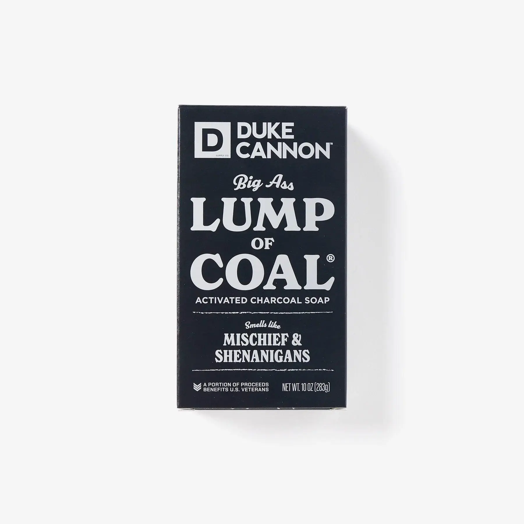 The image shows the Big Ass Lump of Coal Soap in its packaging and bar form. The packaging is black with white text, featuring the Duke Cannon logo and product name.