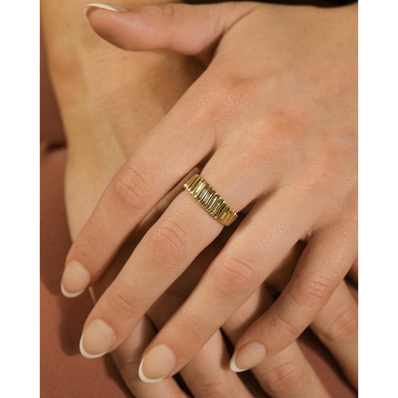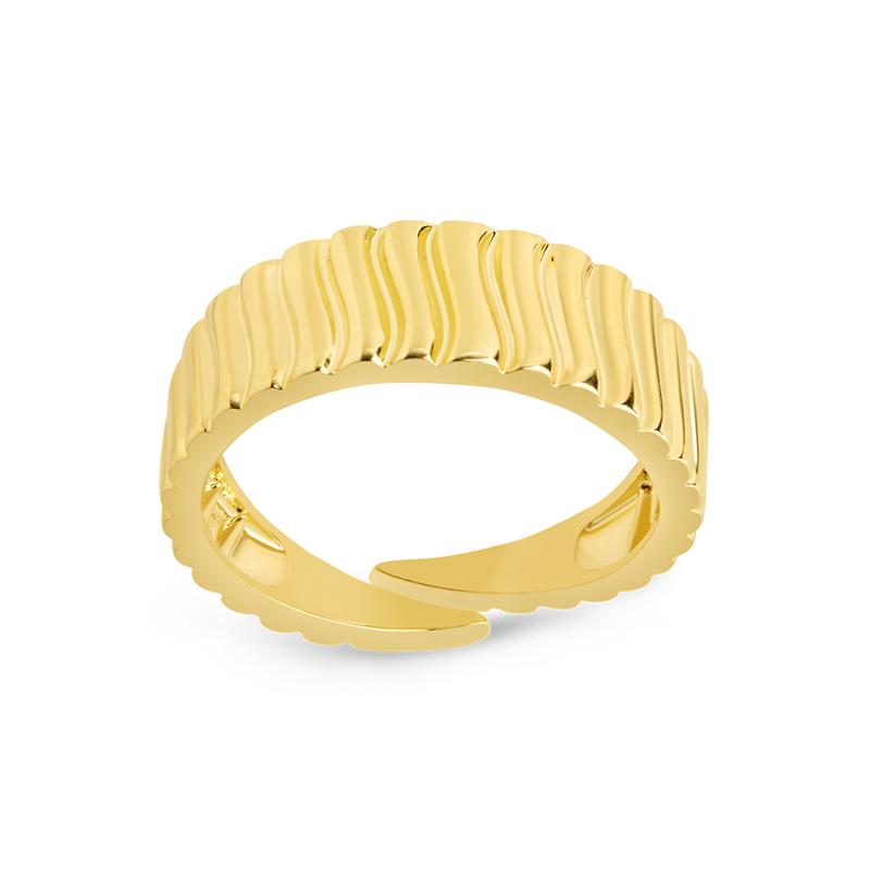Wave-textured and endlessly stackable. This fluid band features a rippled surface that catches the light just right, giving off subtle shimmer with every move. A sleek accent worn solo or layered with your everyday favorites.