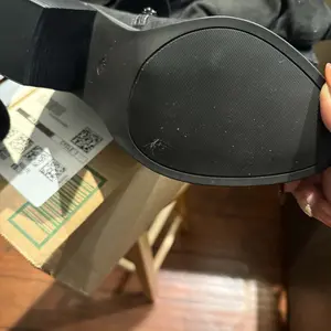 Arrived with marks on both boots. The sole is a nonslip rubber, but the heel pad is hard plastic which makes me afraid I’m going to slip while walking.