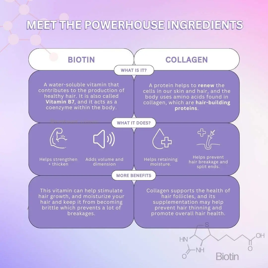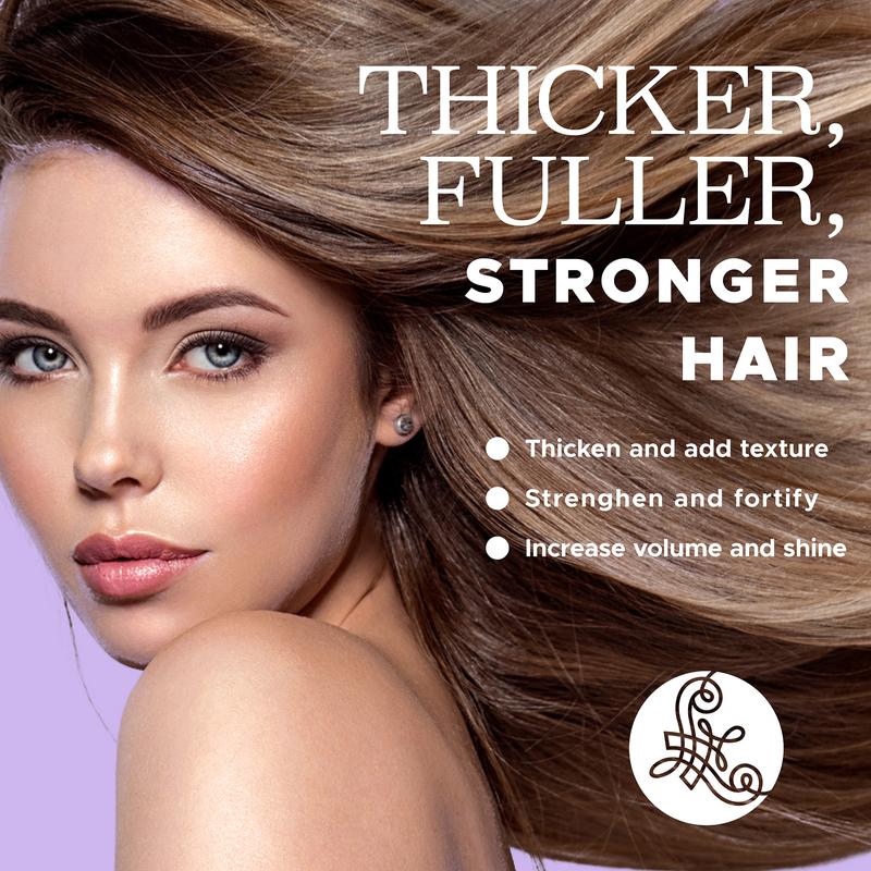 A luxury natural blend of powerful Vitamin B7 Biotin, Hydrolyzed Collagen, and Argan Oil, which helps to restore necessary nutrients into every strand, while plumping collagen adds volume and dimension, and make your hair look stronger, fuller, thicker, and healthier.