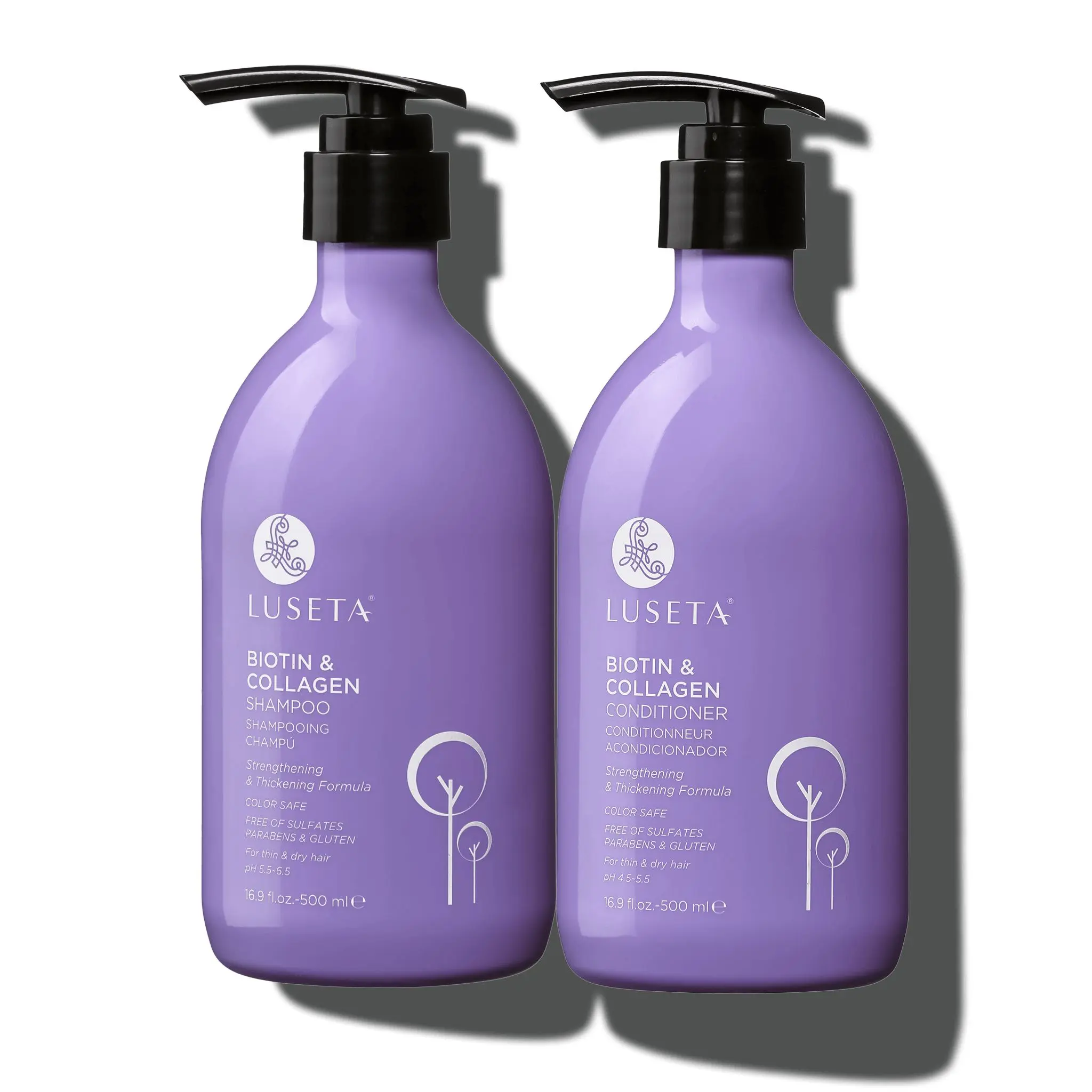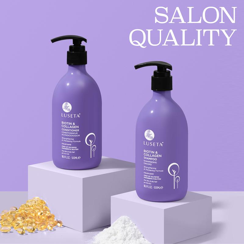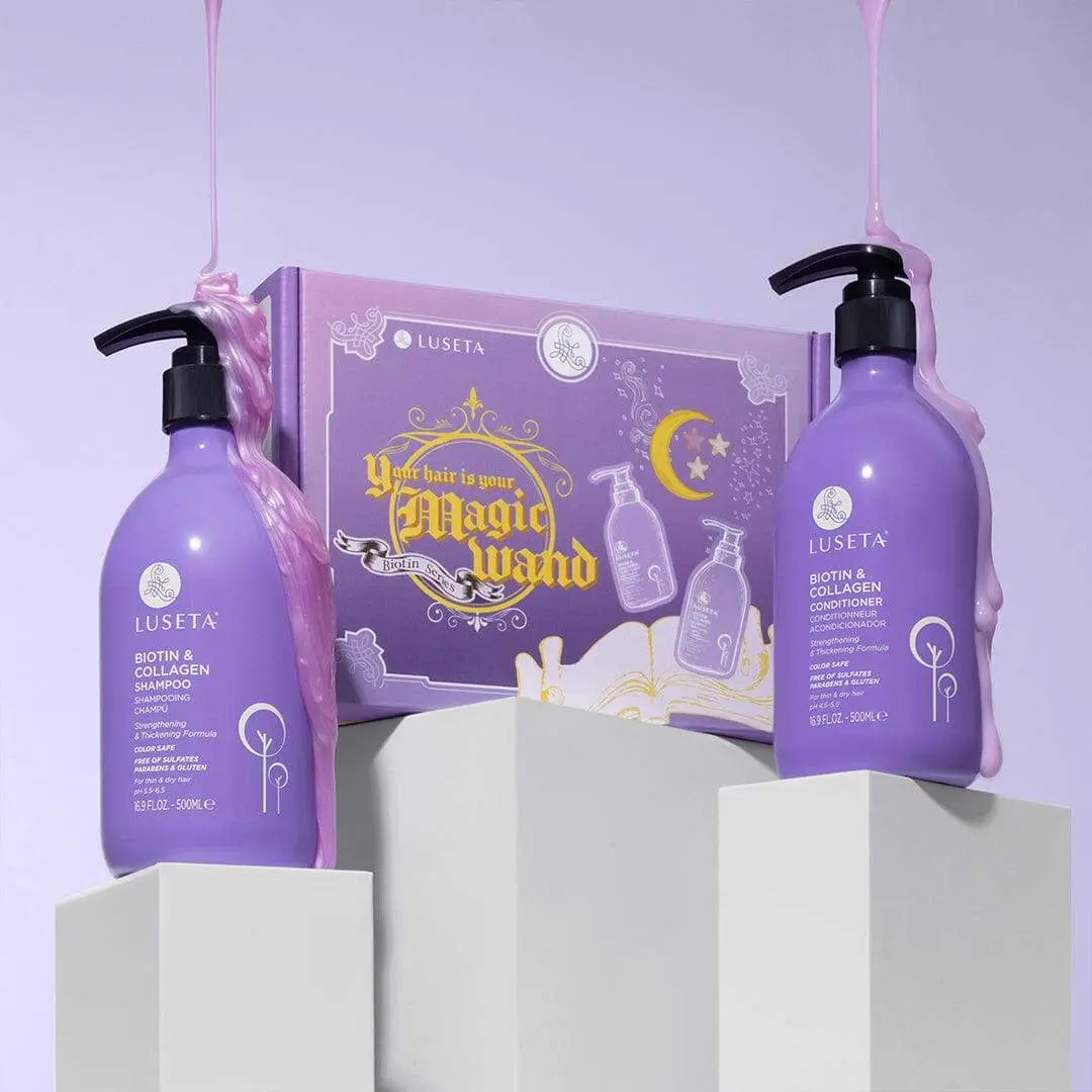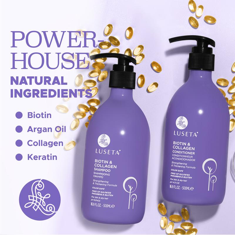 Shampoo: Wet hair, apply shampoo, and gently massage into hair and scalp. Rinse thoroughly. Follow with Biotin & Collagen Conditioner.
