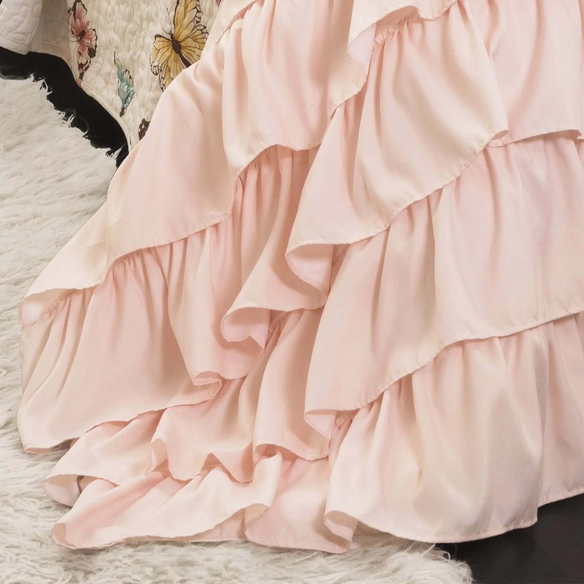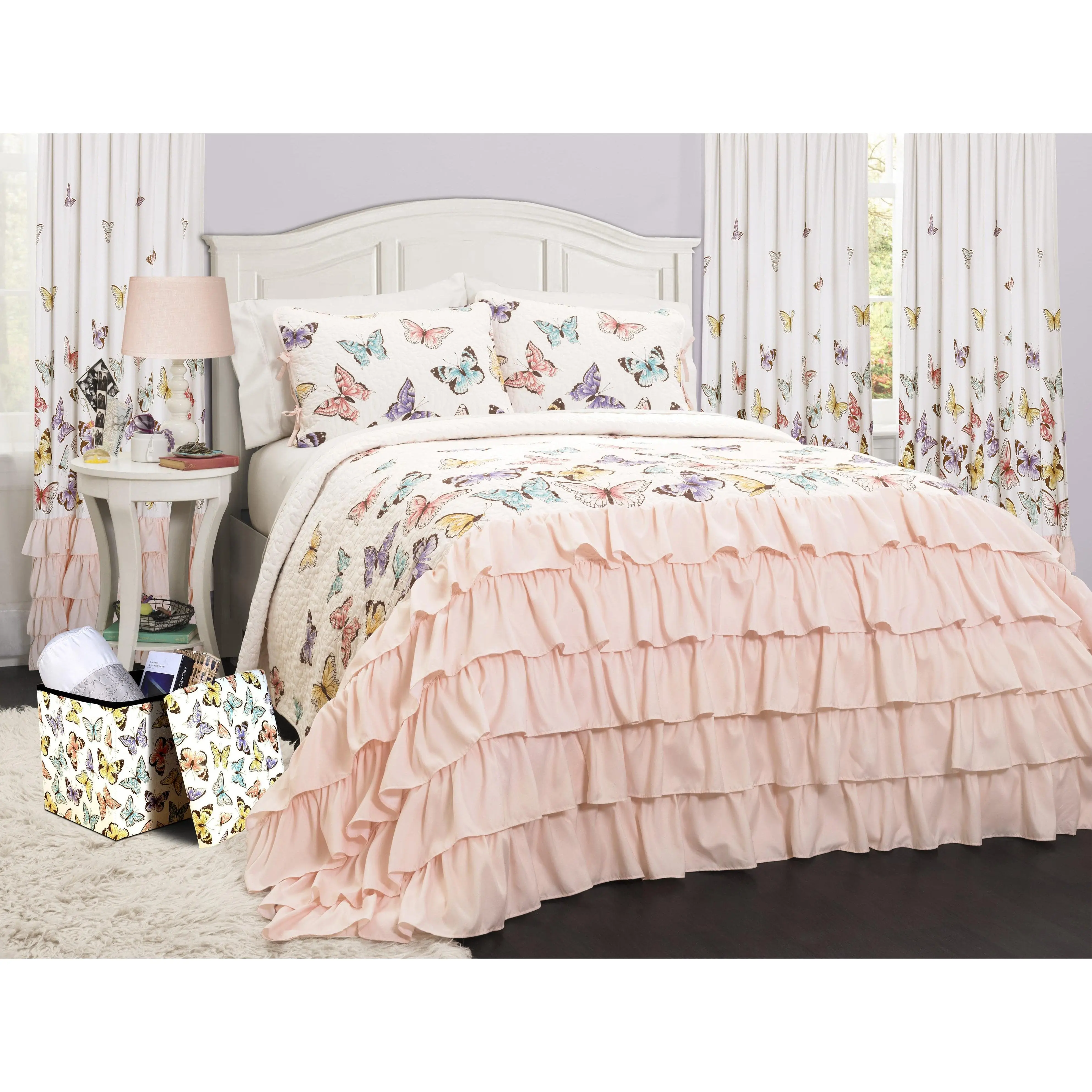 Elevate your space with the Lush Décor Flutter Butterfly Quilt Set. This set blends serene elegance with modern style. The quilt features a delightful butterfly print on the top, complemented by soft ruffles on the bottom. Perfect for any room, it offers a charming aesthetic. The set is machine washable and tumble dryable, with dry cleaning recommended for ruffles. Part of the Flutter Butterfly Collection.