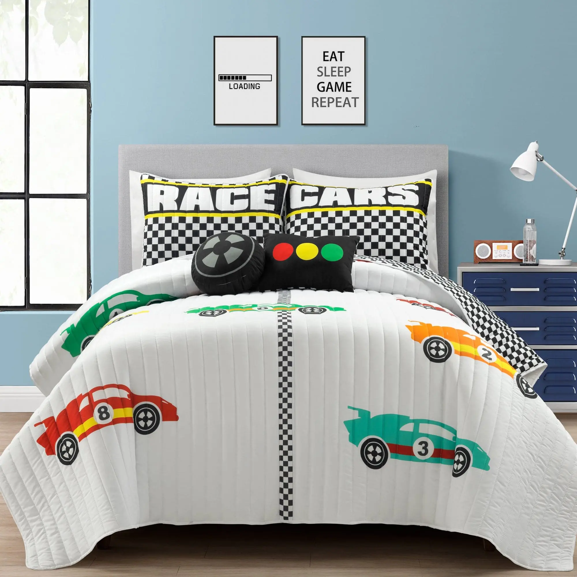 If your child loves fast cars and vintage racing games, this Racing Cars Quilt Set is ideal. The front features colorful cars crossing the finish line, while the reverse is the checkered flag print. The shams are reversible, with "Race" and "Cars" designs depending on the size.