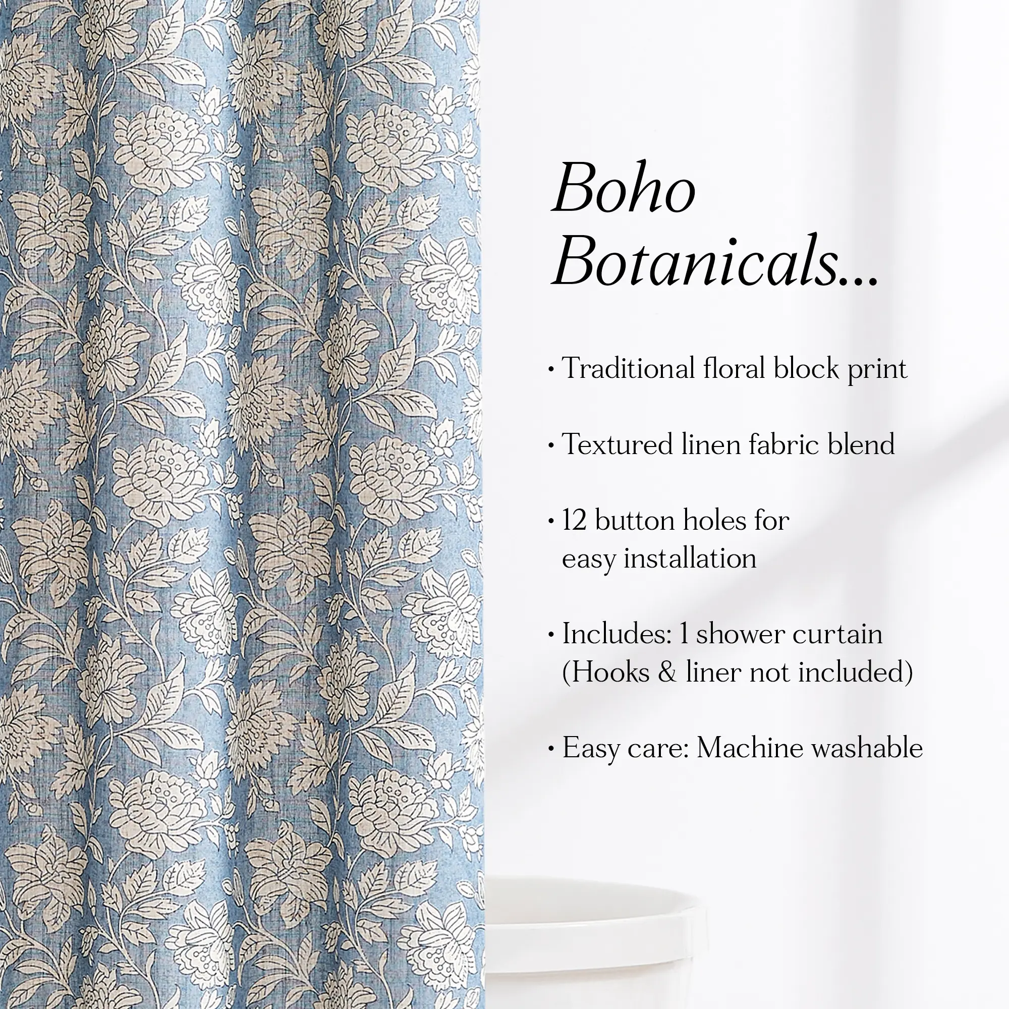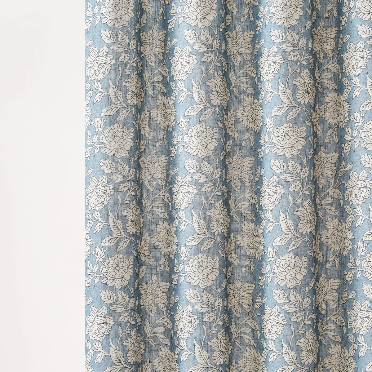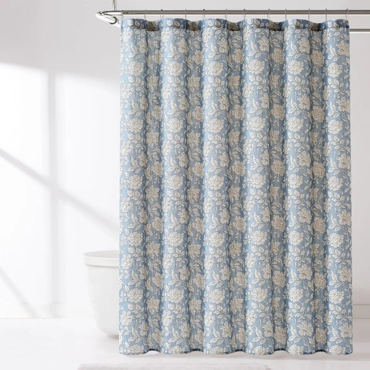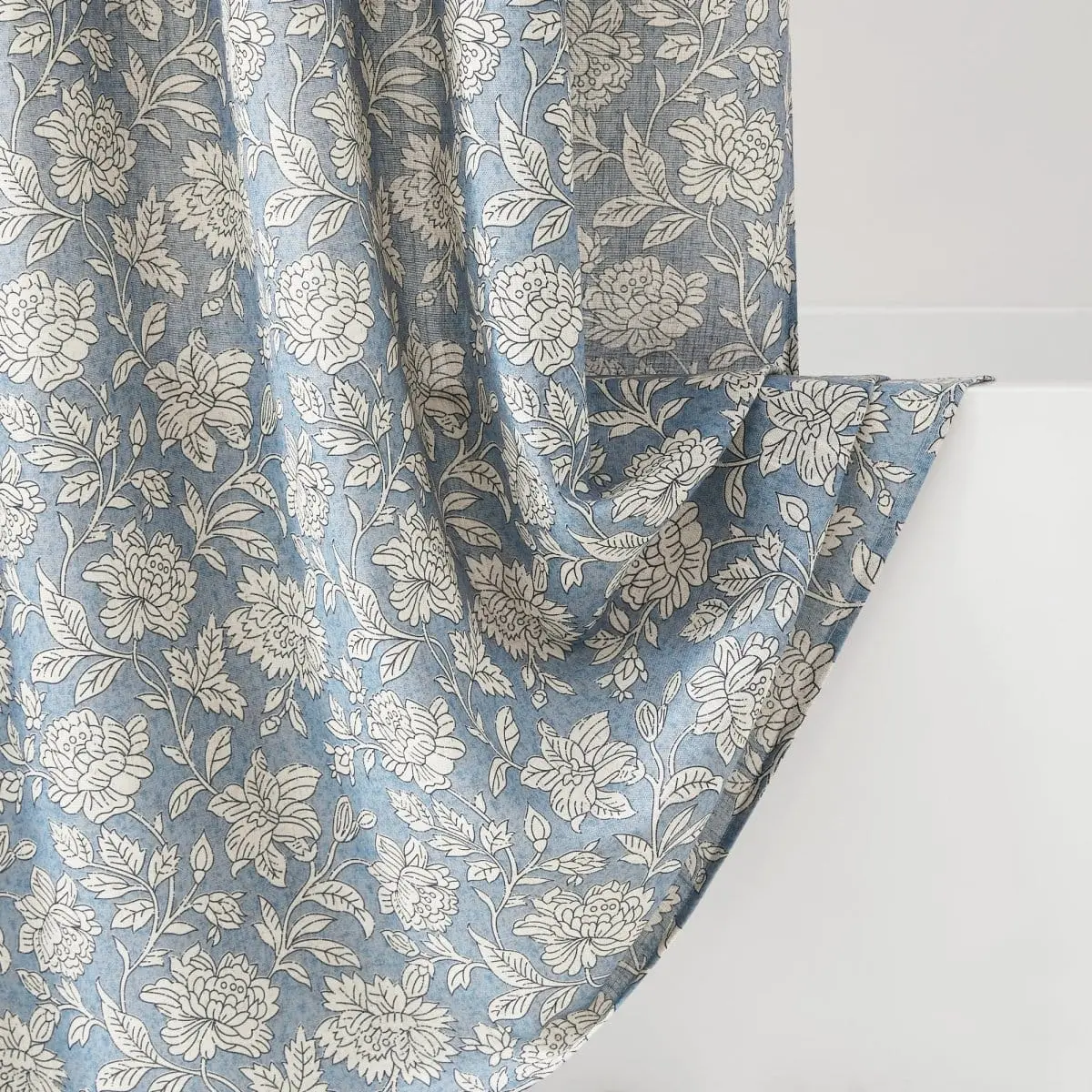 Add charming florals to your bathroom with this block print shower curtain. It features a classic floral print of blooming flowers, complementing vintage or coquette style homes. Crafted from a linen blend fabric, it is easy to install and machine washable for easy care.