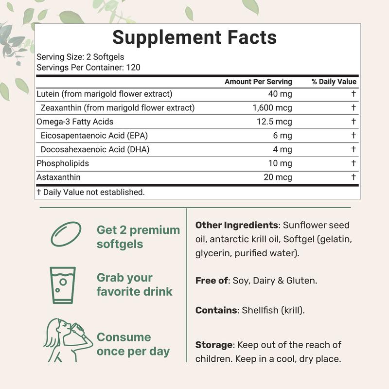 ·For 40mg 240 Count package: 240 total softgels that provide easily absorbed ingredients with a virgin sunflower seed oil base. 2 softgel serving size that contains 40mg lutein, 1,600mcg zeaxanthin, 20mcg astaxanthin, 12.5mg omega-3 fatty acids, and 10mg phospholipids.