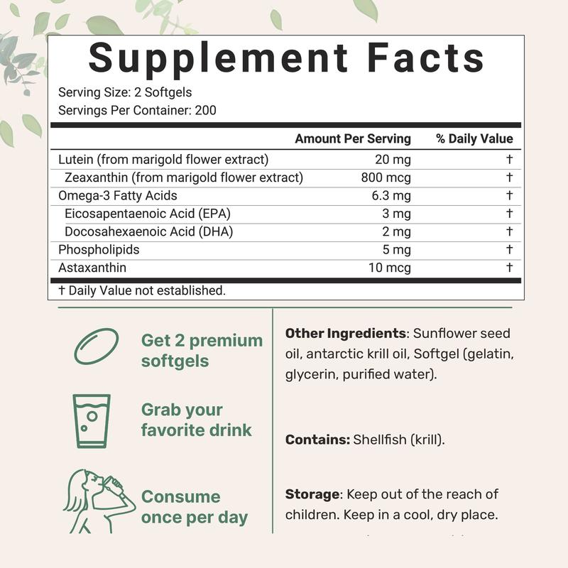 ·For 20mg 400 Count package: 400 total softgels that provide easily absorbed ingredients with a virgin sunflower seed oil base. 2 softgel serving size that contains 20mg lutein, 800mcg zeaxanthin, 10mcg astaxanthin, 6.3mg omega-3 fatty acids, and 5mg phospholipids.