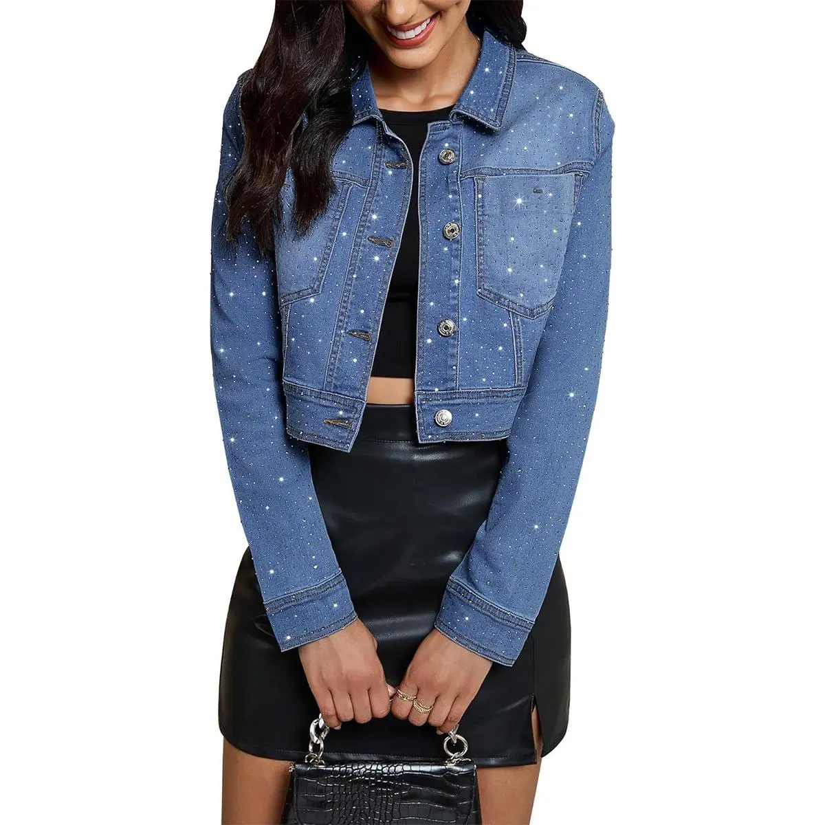 The Luvamia Cropped Jean Jacket is a trendy, rhinestone-embellished short stretchy trucker denim jacket. It features a crop fit design for a stylish look. The basic turn-down collar adds a classic touch. Long sleeves ensure comfort, while the button-down closure is easy to wear. It includes 2 pockets for your essentials. The comfortable fabric, with no stretch, ensures a perfect fit. Rhinestones add elegance.