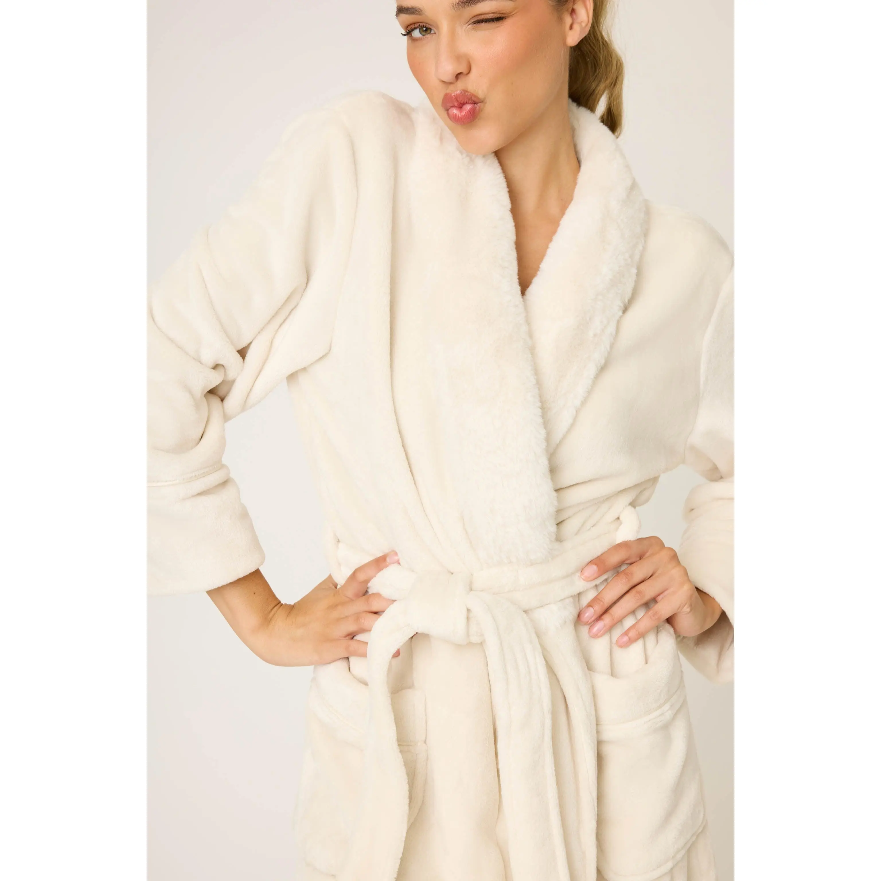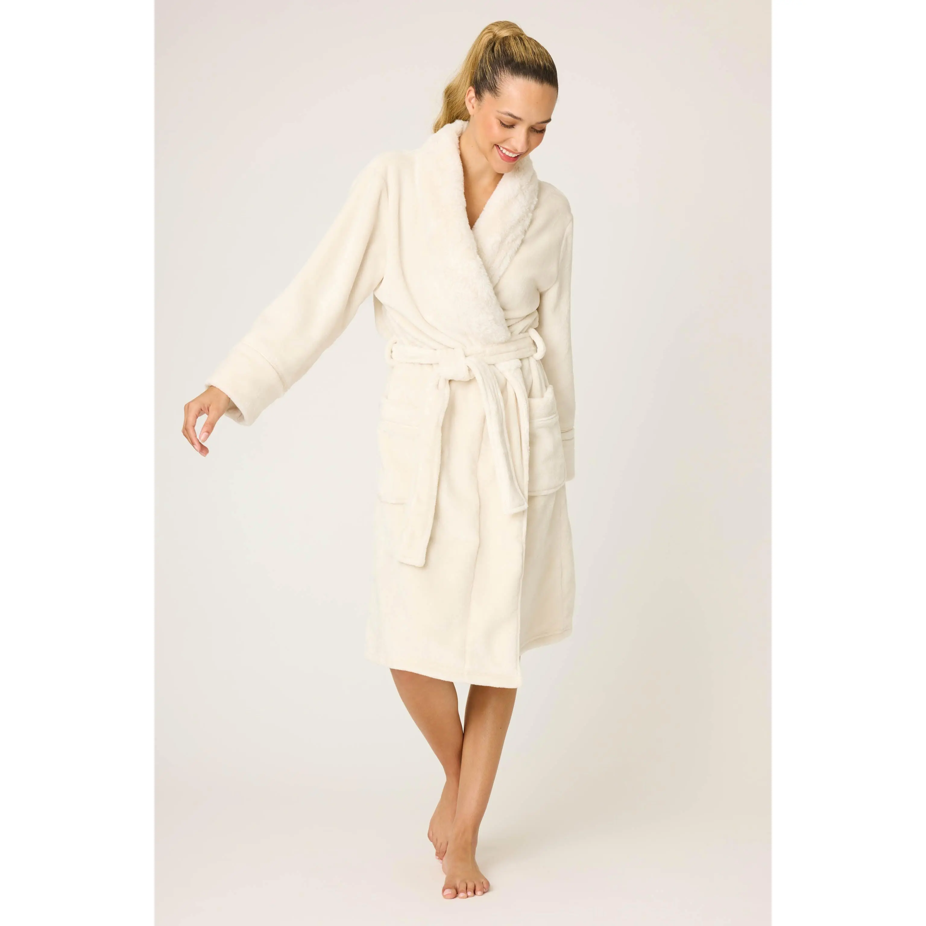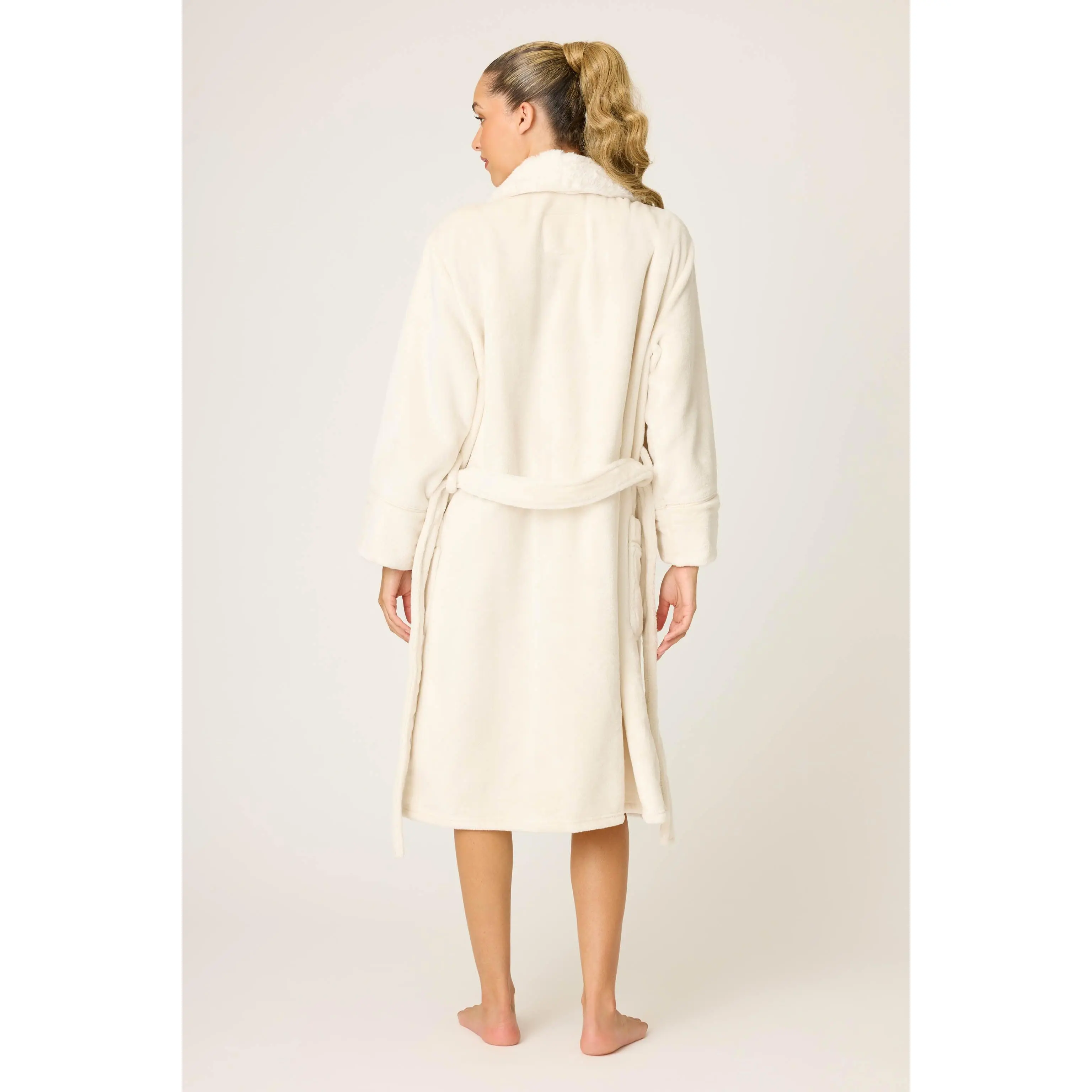 Wrap yourself in plush comfort. This mid-length robe is made from silky-soft fleece with a shawl collar, a self-tie belt, and roomy patch pockets. The creamy off-white shade keeps it timeless and endlessly cozy.