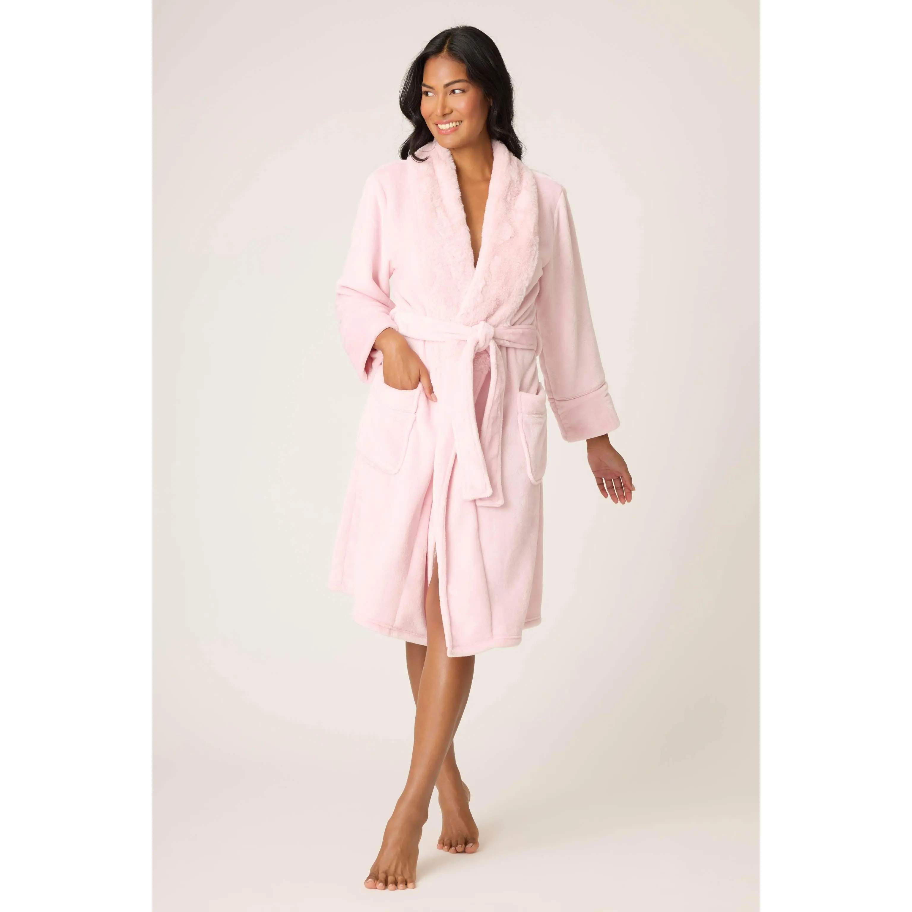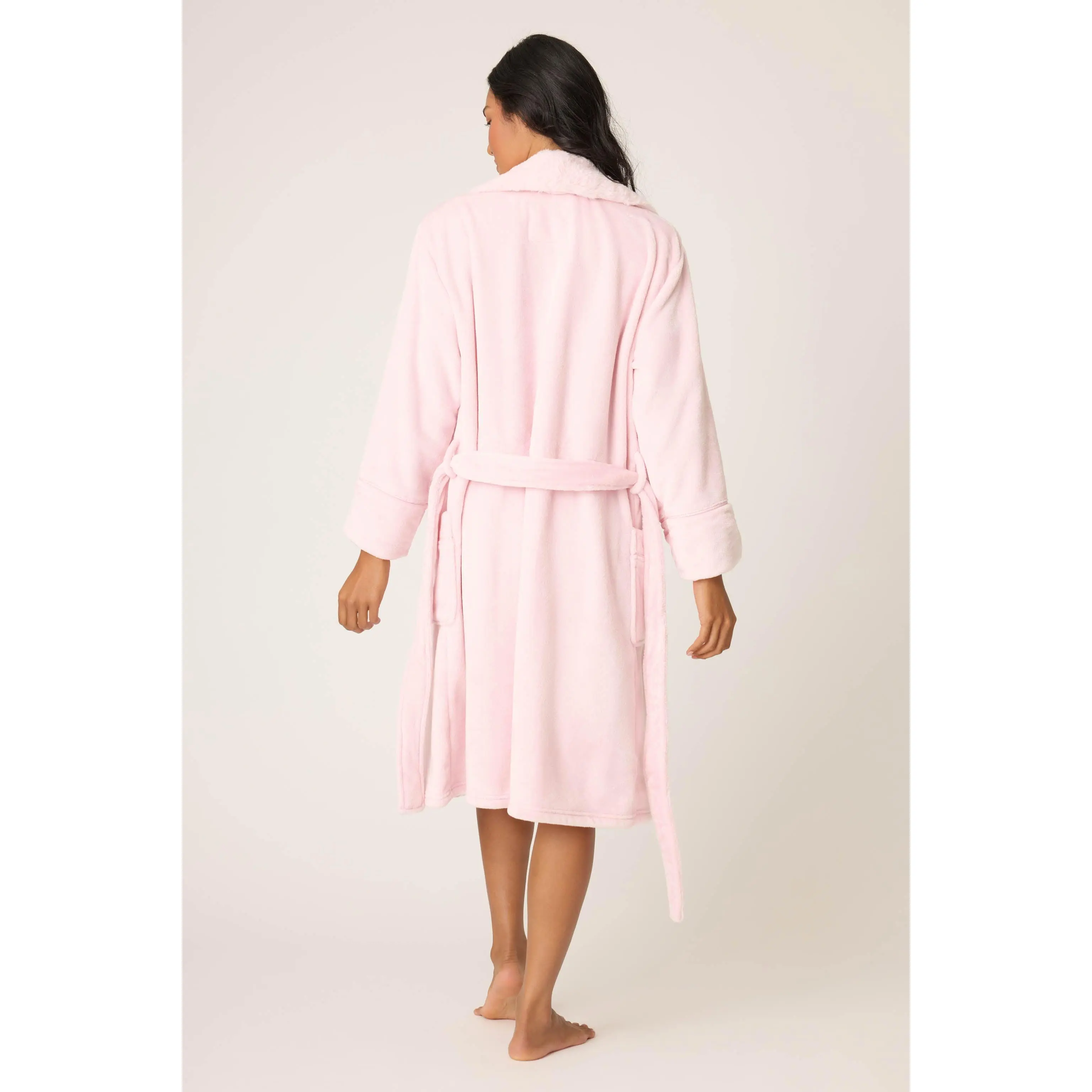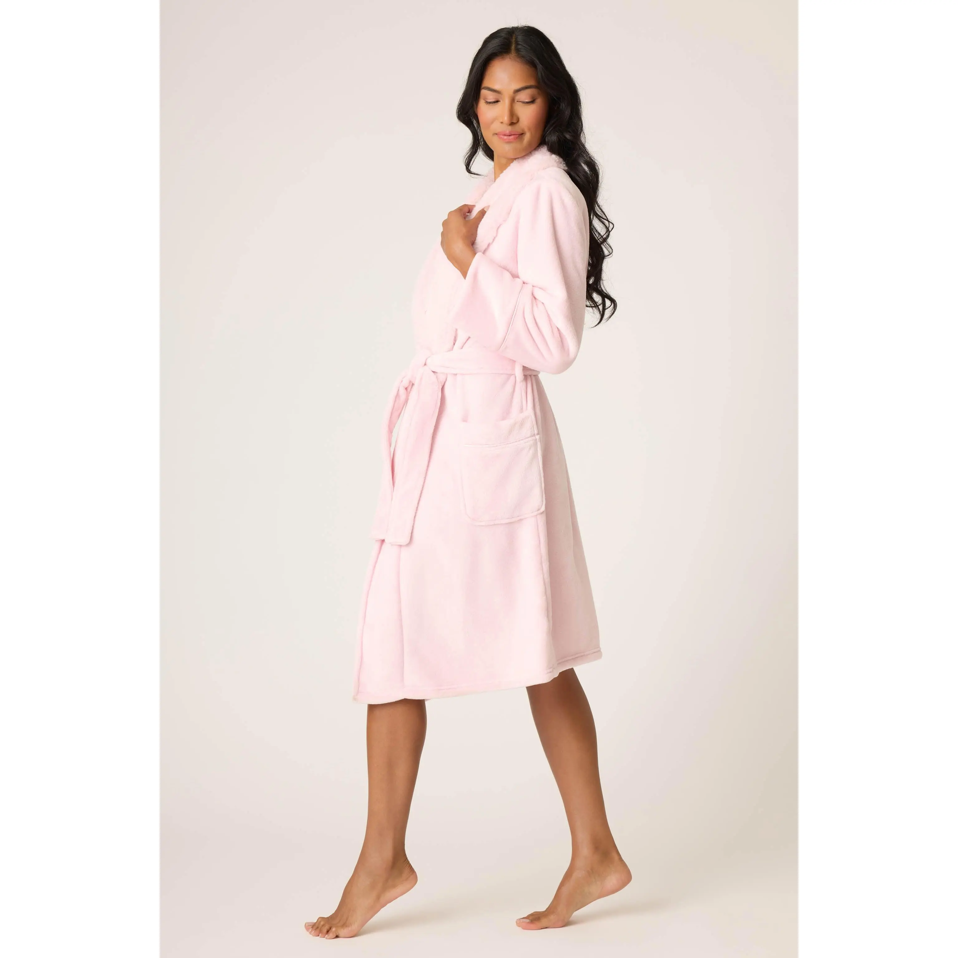 Wrap yourself in cozy, plush comfort. This mid-length robe is made from silky-soft fleece with a shawl collar, a self-tie belt, and roomy patch pockets. The pale, petal-pink hue adds a sweet, soothing touch to your lounge routine.