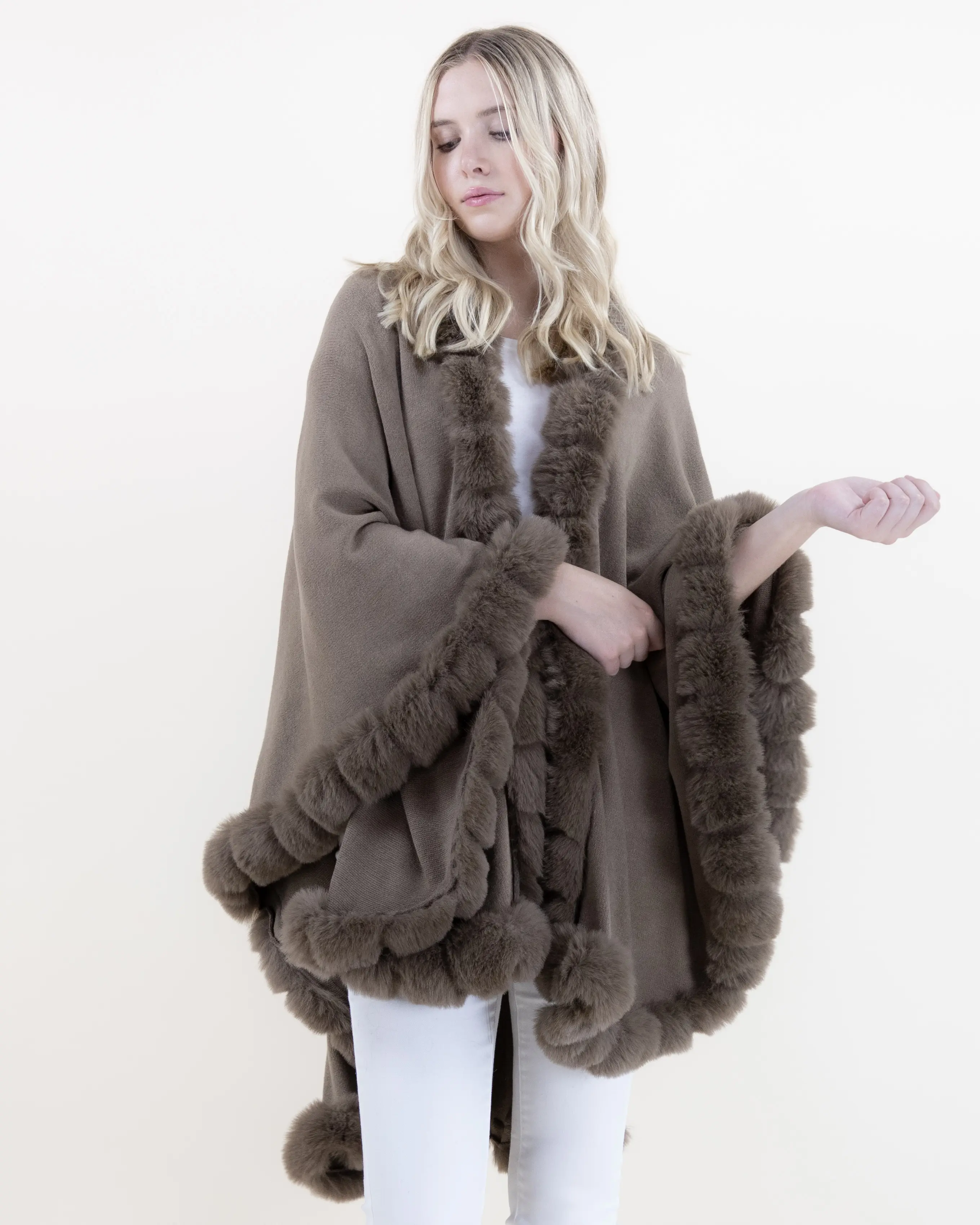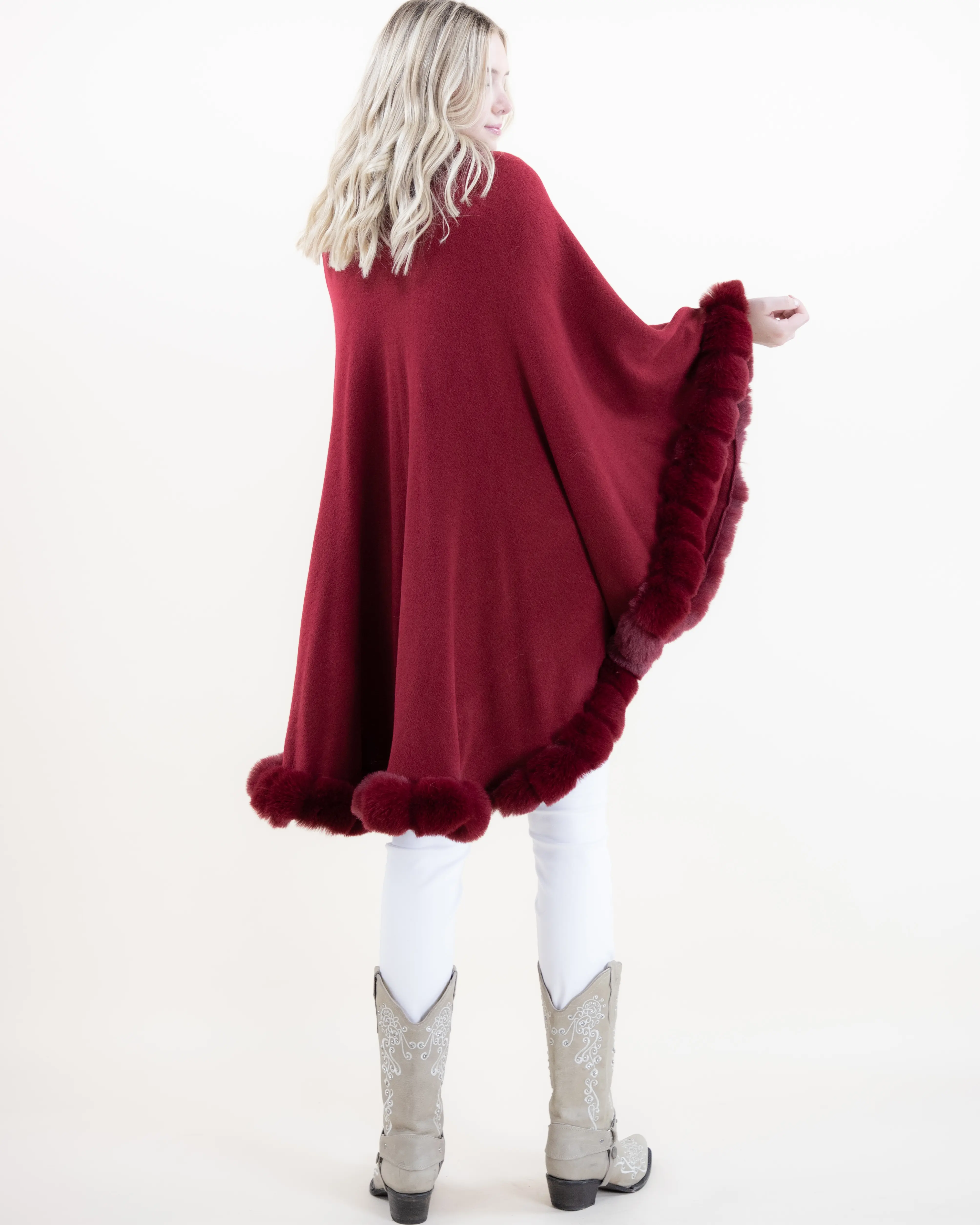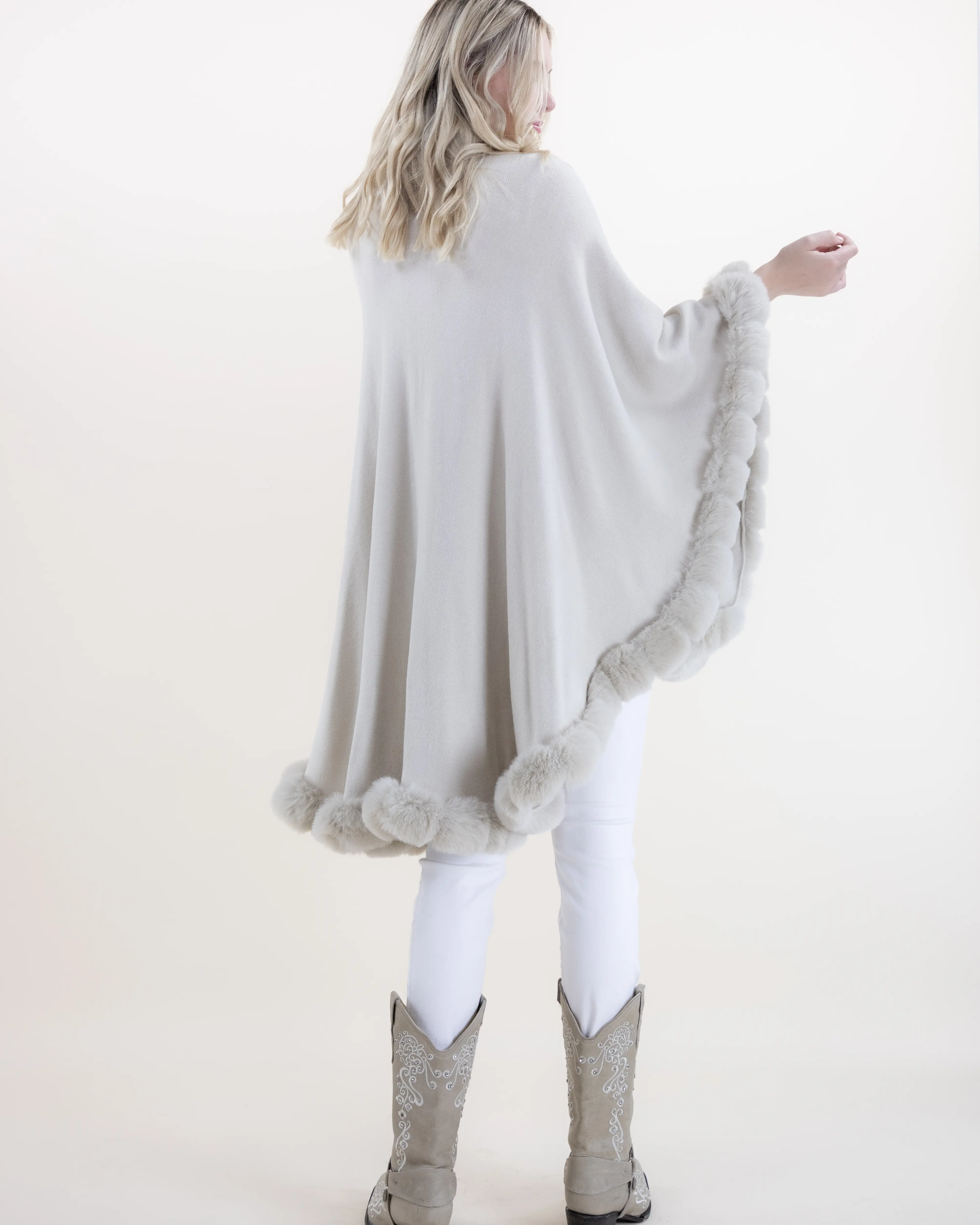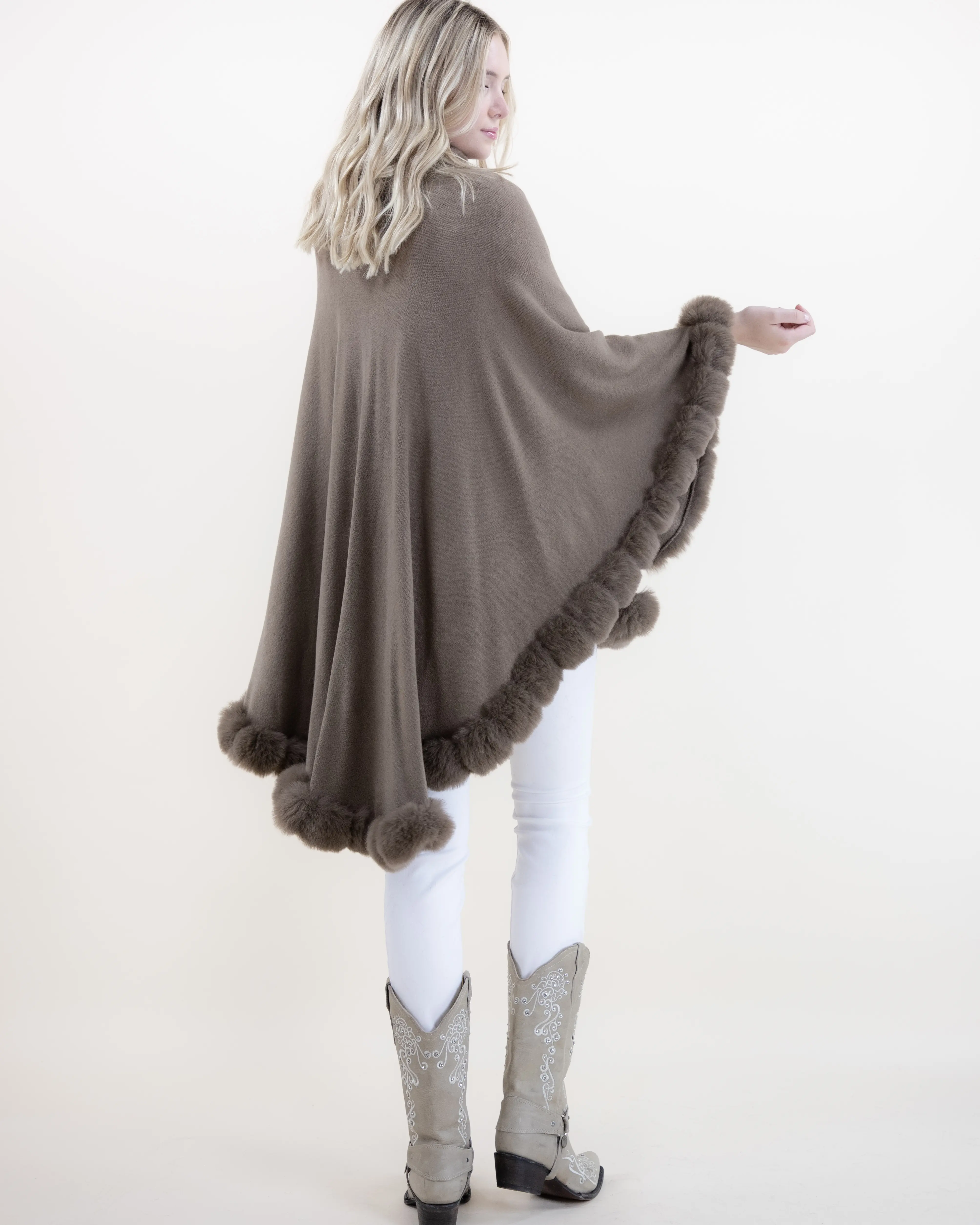 This beautifully crafted cape combines refined softness with timeless elegance. Featuring a ribbed body that drapes effortlessly over the frame, it is enriched with plush faux fur trim that adds depth, texture, and a touch of luxury. The flowing silhouette creates graceful movement, offering full coverage while maintaining a lightweight, comfortable feel. Easy to style and endlessly versatile, this piece elevates both casual and dressy outfits with its sophisticated finish.