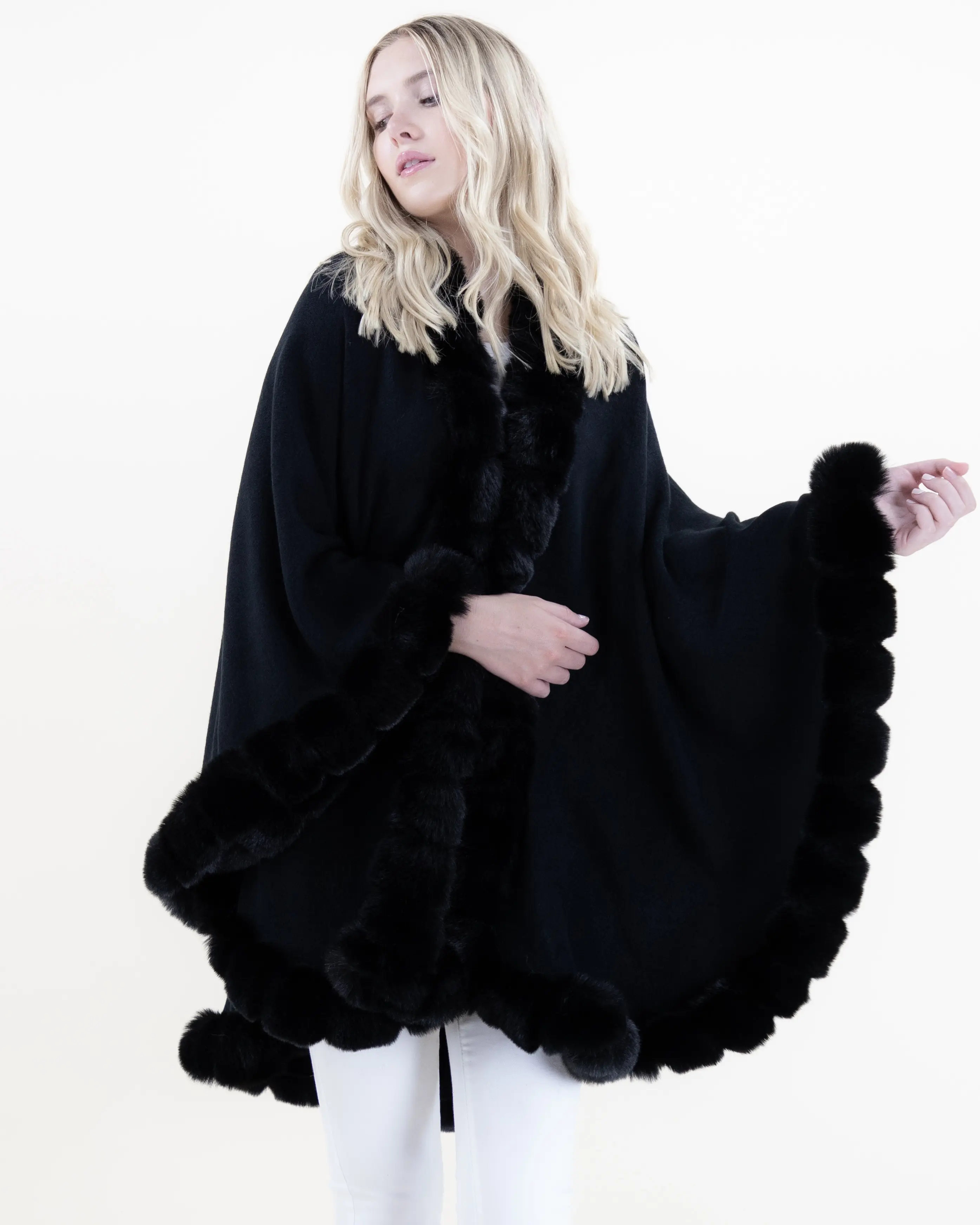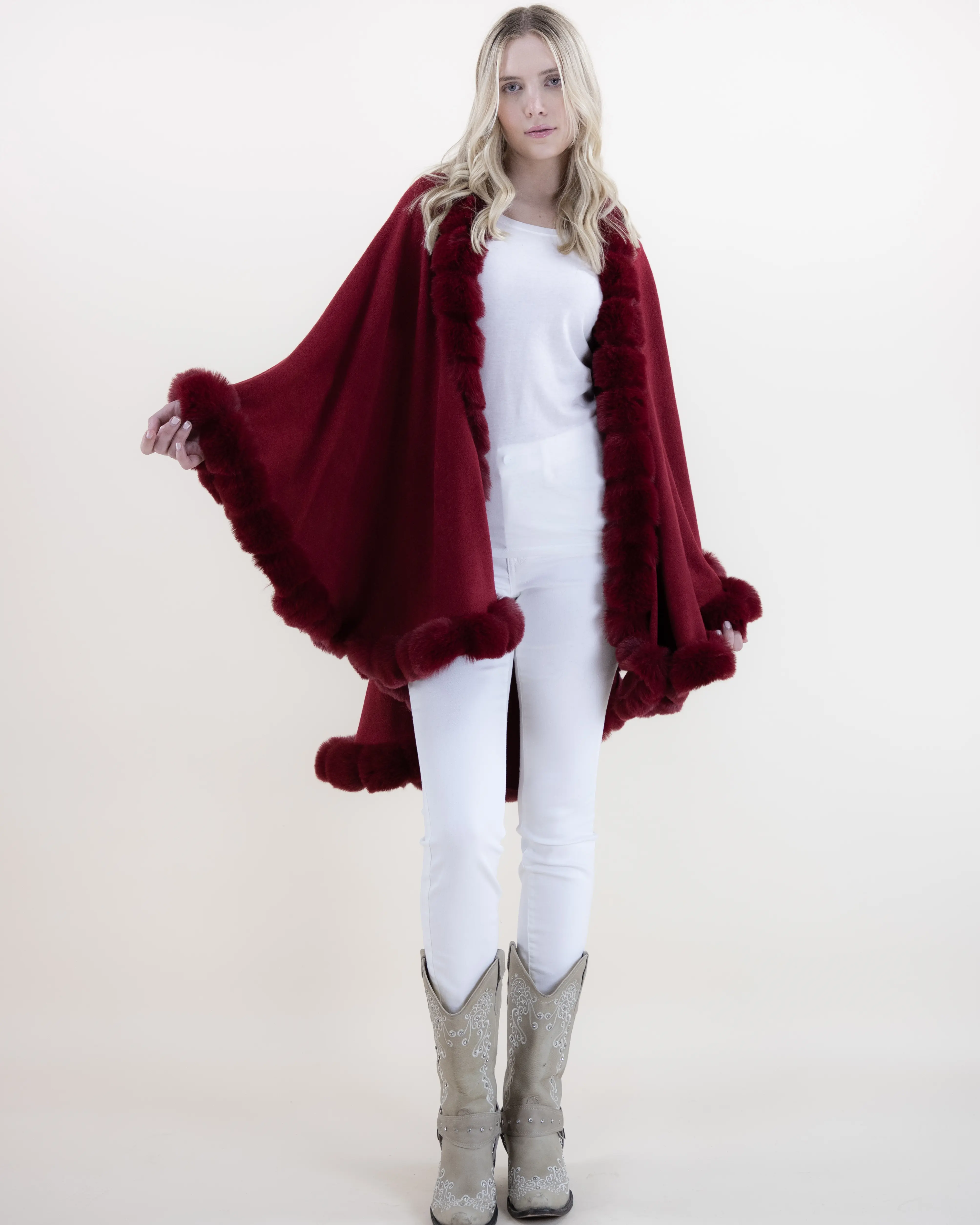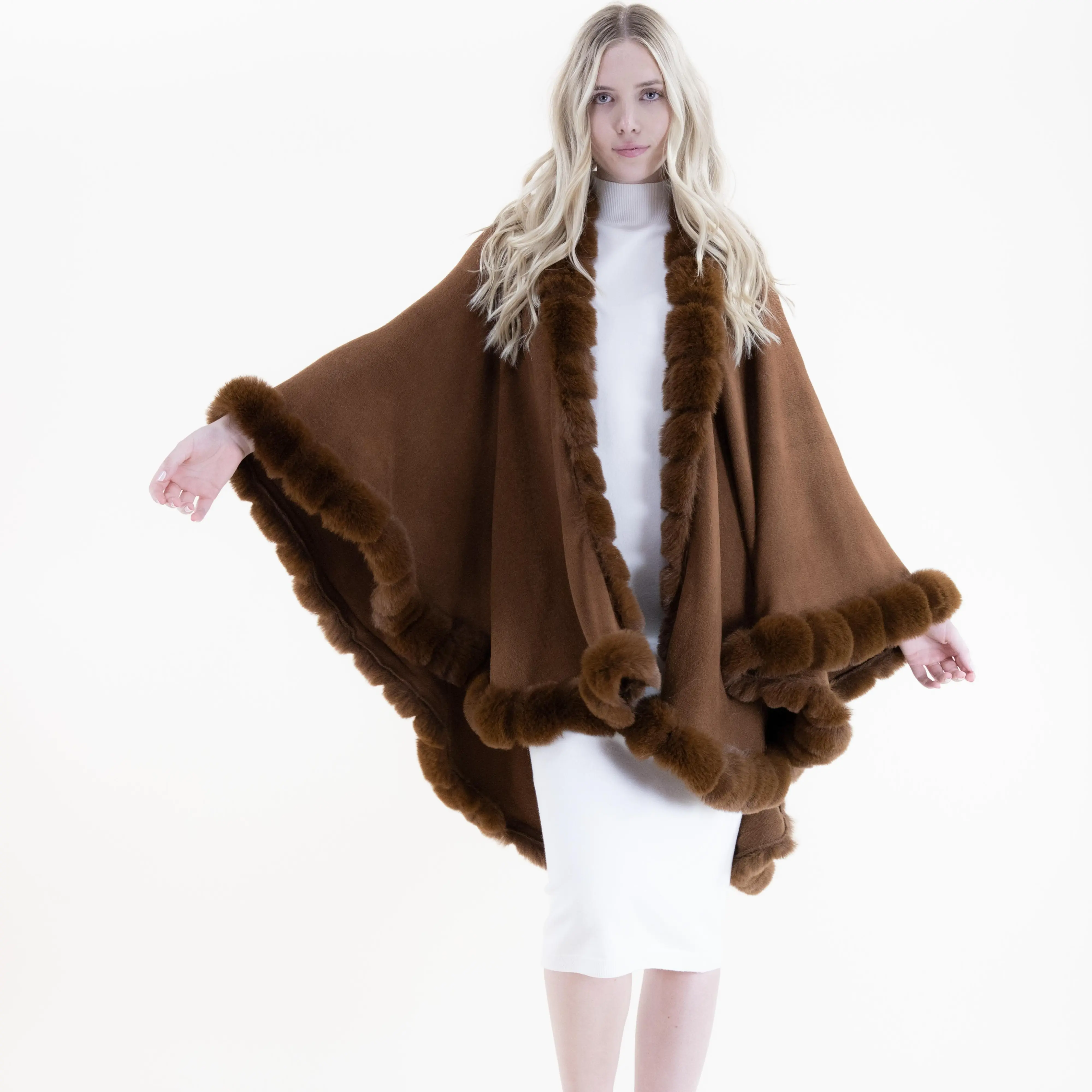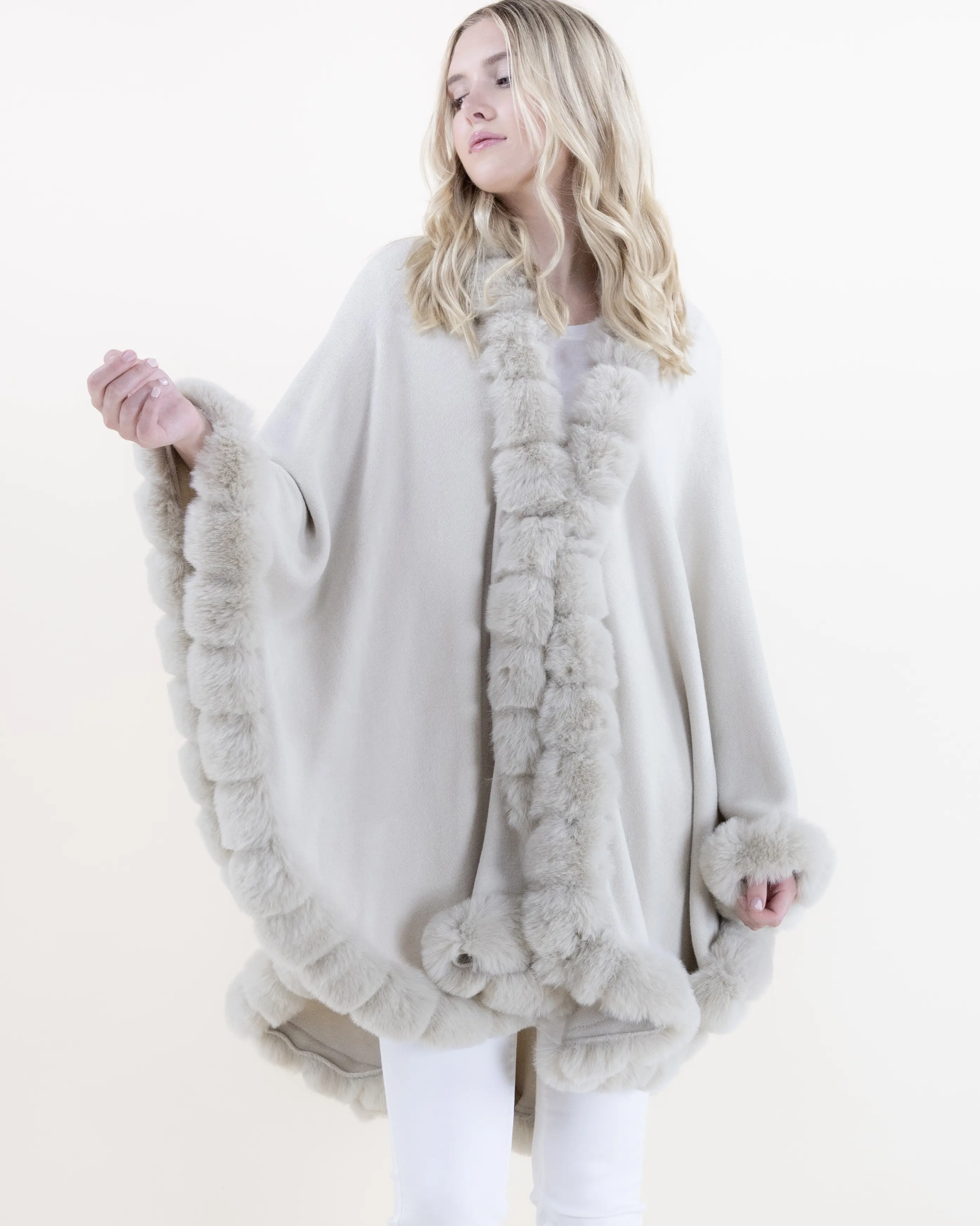This beautifully crafted cape combines refined softness with timeless elegance. Featuring a ribbed body that drapes effortlessly over the frame, it is enriched with plush faux fur trim that adds depth, texture, and a touch of luxury. The flowing silhouette creates graceful movement, offering full coverage while maintaining a lightweight, comfortable feel. Easy to style and endlessly versatile, this piece elevates both casual and dressy outfits with its sophisticated finish.