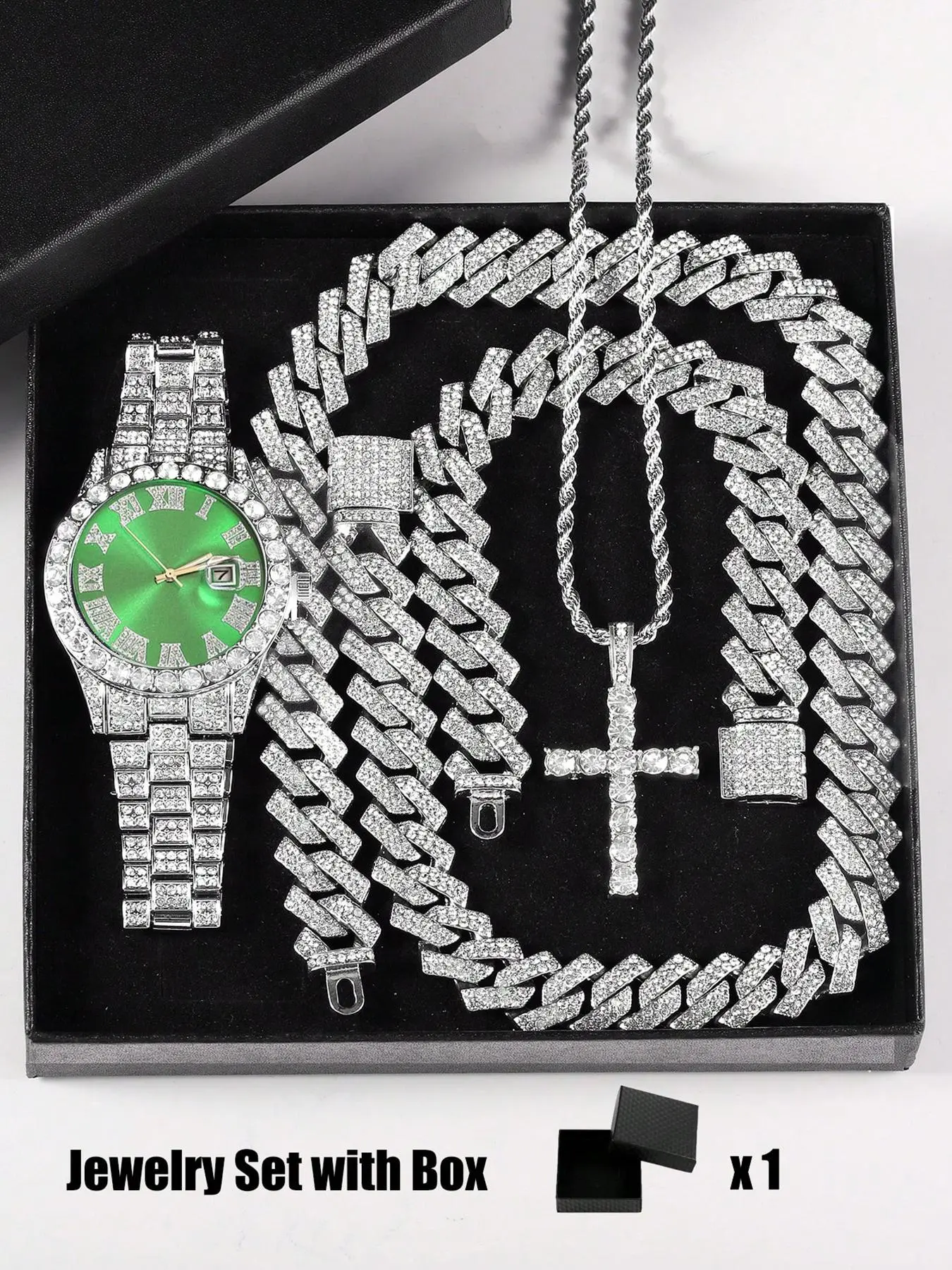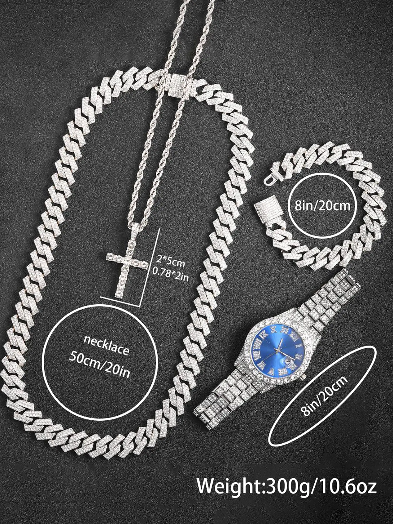 Luxury Punk Watch Set with Necklace Bracelet Cross Pendant, Analog Quartz Movement, Adjustable Strap, Unisex Gift Box for All Seasons, Fashionable Jewelry Set