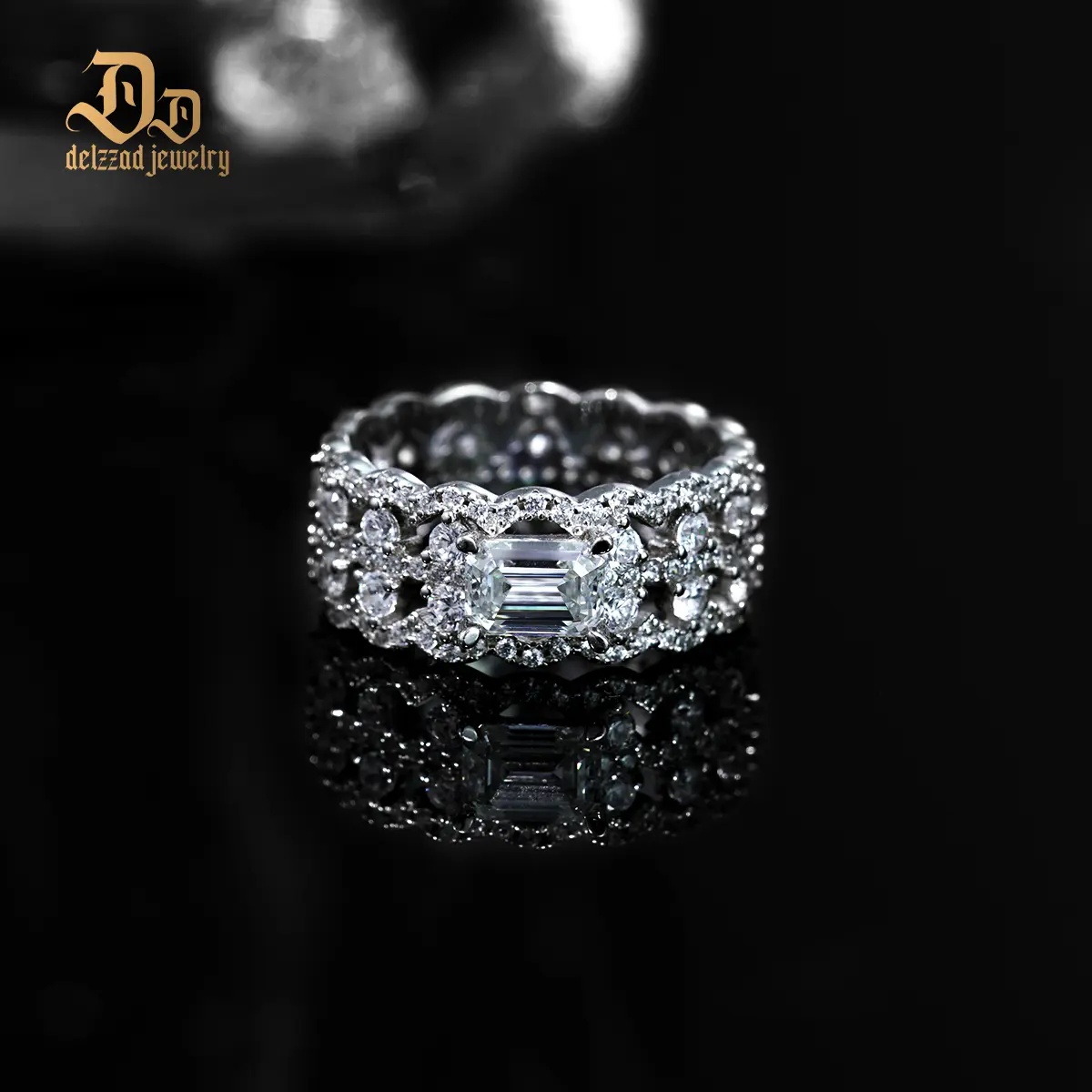 The luxury ring dazzles with its intricate setting, capturing and reflecting light with every synthetic moissanite stone, reminiscent of stars in the night sky. The polished S925 Sterling Silver band highlights the beauty of detail to perfection. This ring not only embodies a masterful design, also perfectly interprets the essence of modern fashion.