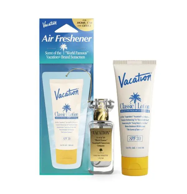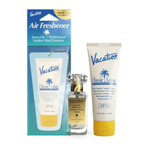 The Vacation Luxury Scent Set immerses the wearer in the inimitable "sunscreen experience." An $80 value for only $72. 1 x "VACATION" by Vacation Eau de Toilette, 1 x Classic Lotion SPF 50, and 1 x Classic Lotion-inspired Air Freshener, each featuring the Signature Scent of the Vacation Sunscreen Brand. Sprayable, spreadable, and hangable on demand.