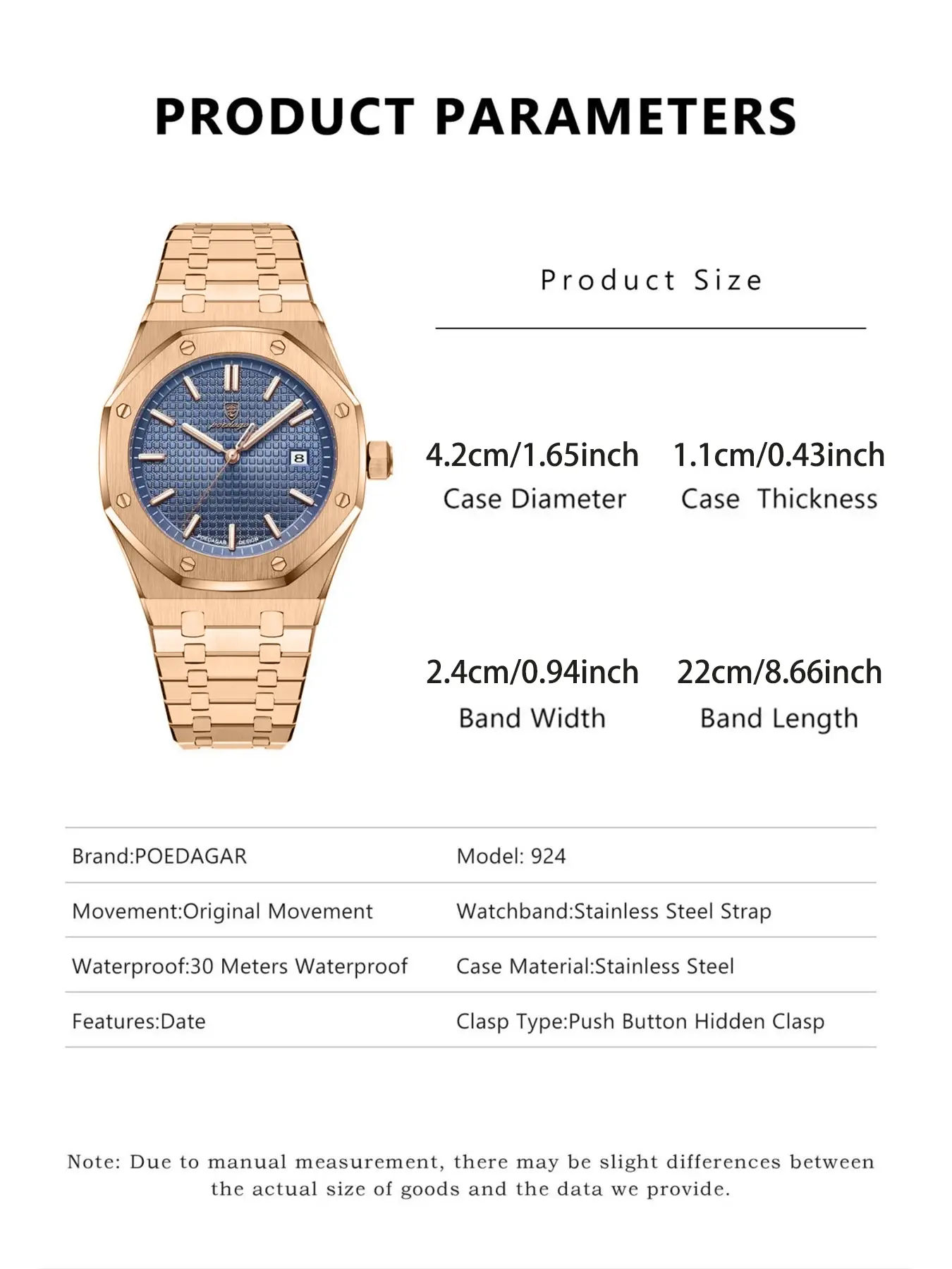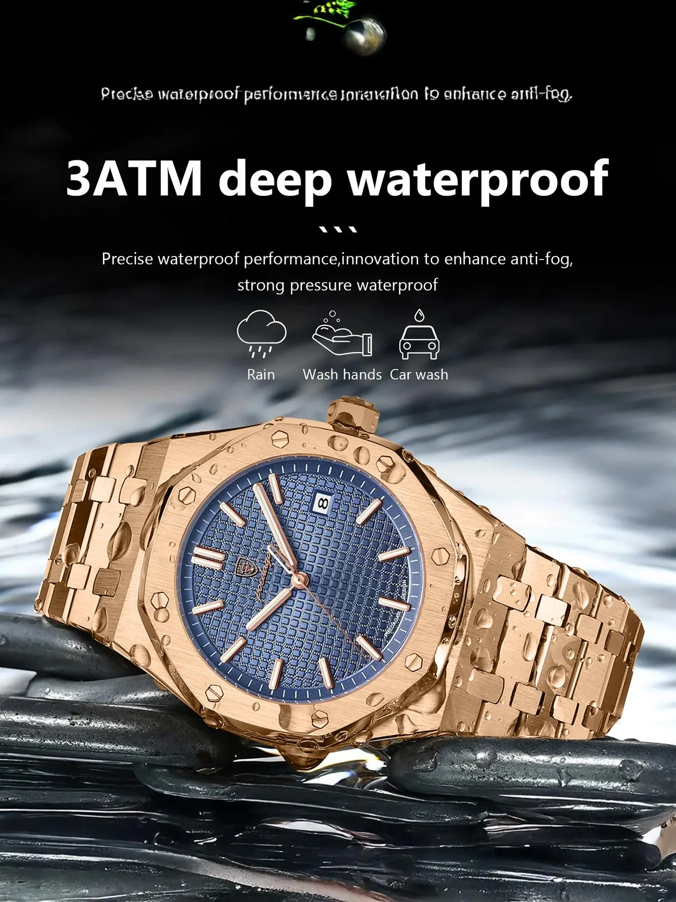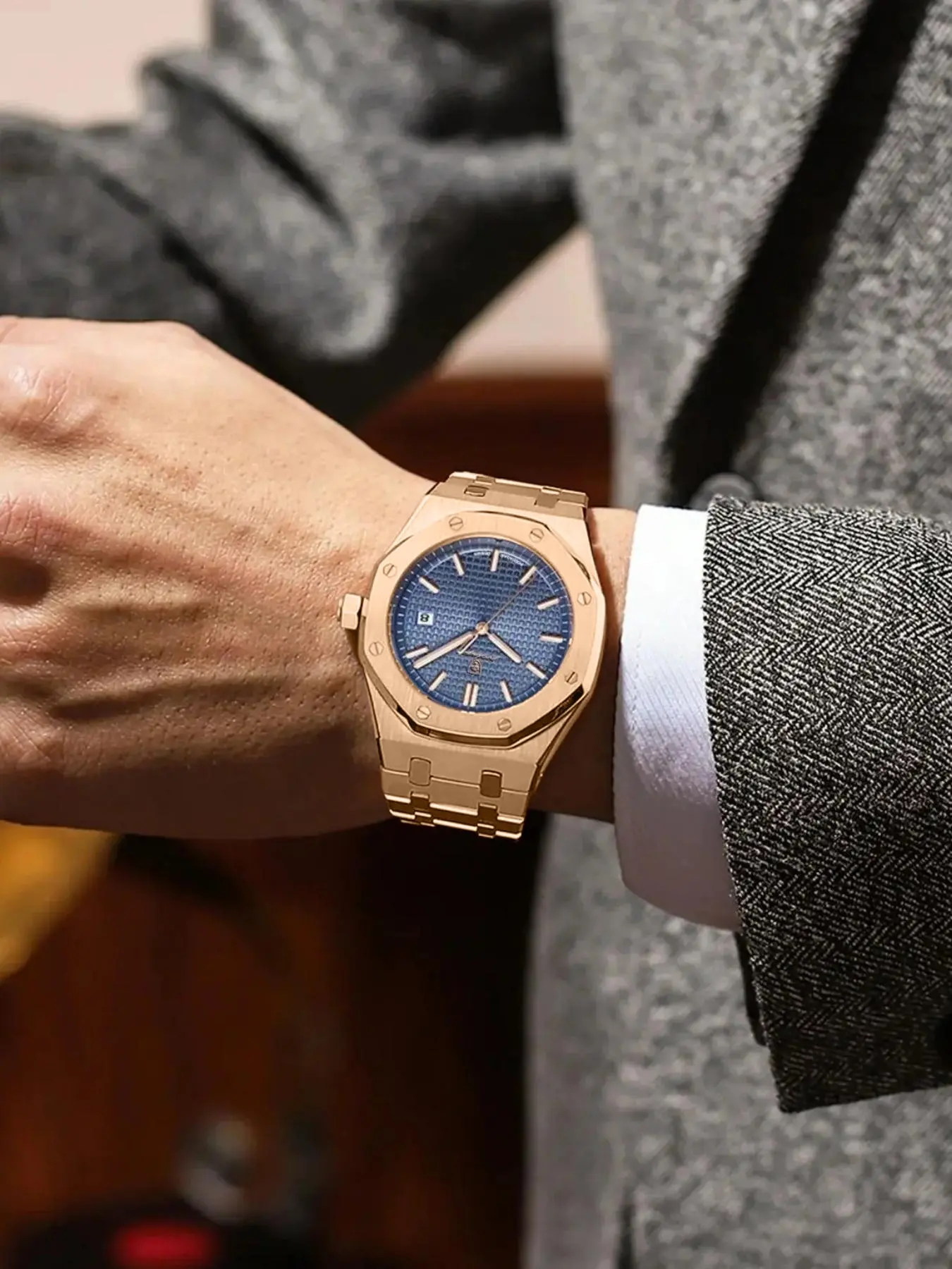 Love this watch! The rose gold looks clean and classy, and the blue face really pops. Feels solid and has a nice weight to it. Great for both casual and dressy fits. I’ve already gotten compliments. Way more quality than I expected for the price!