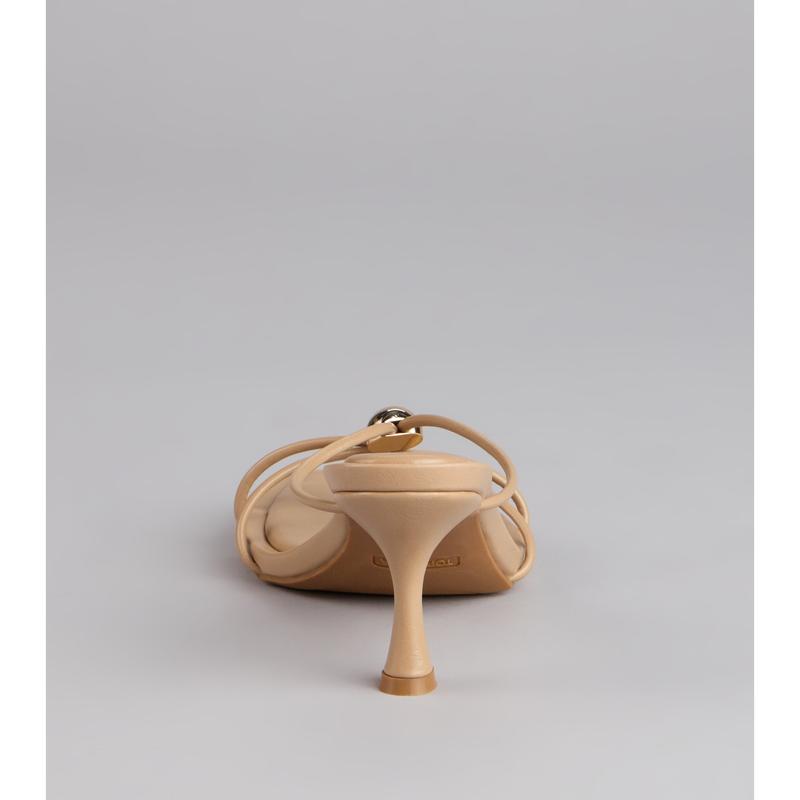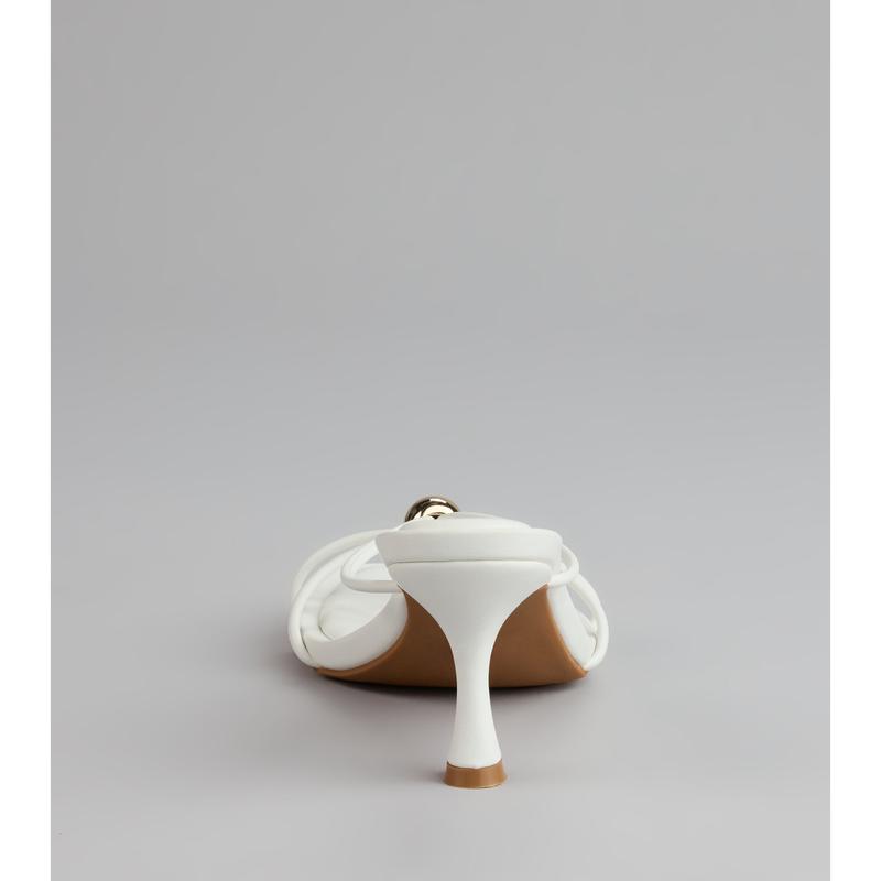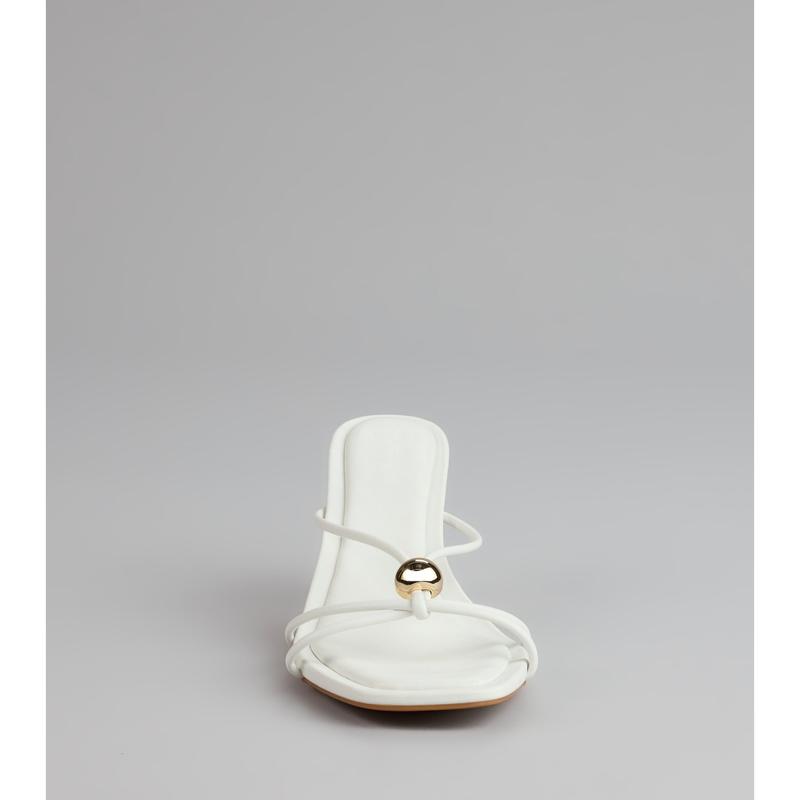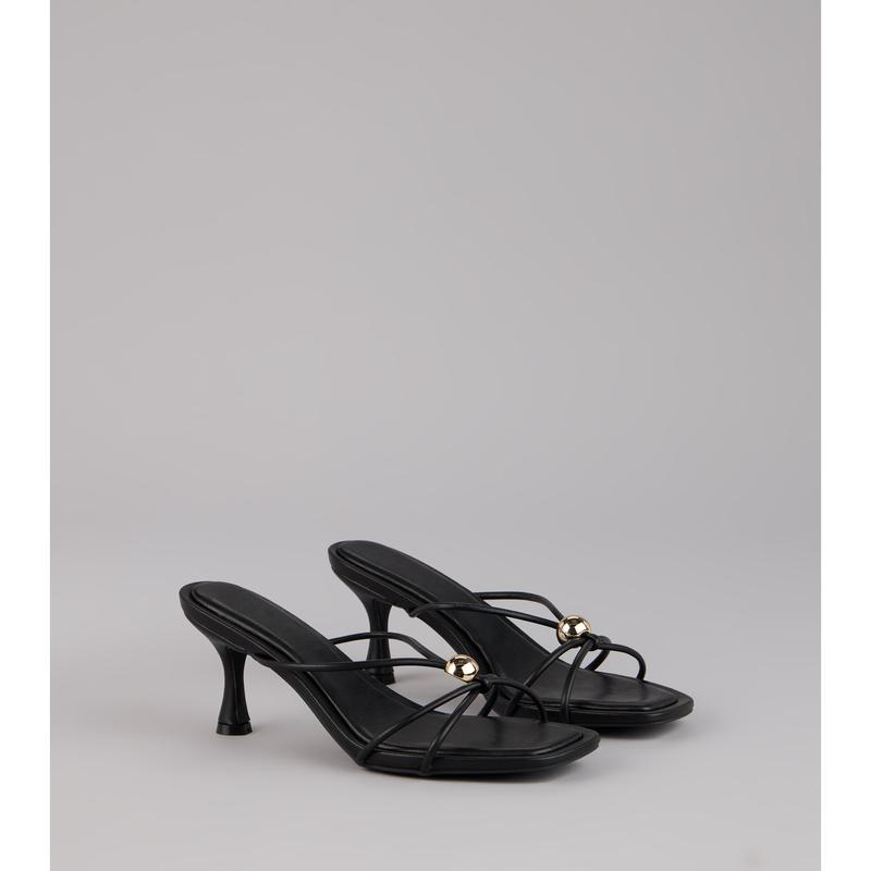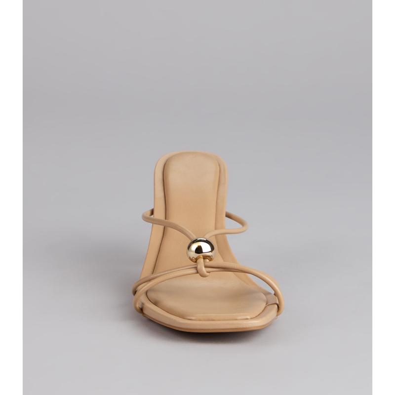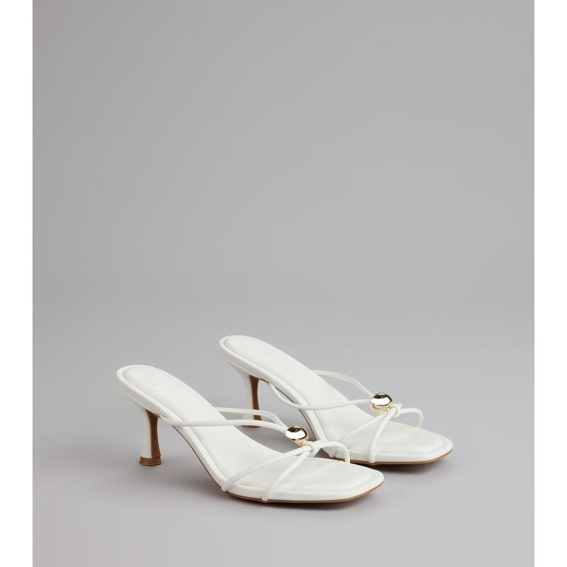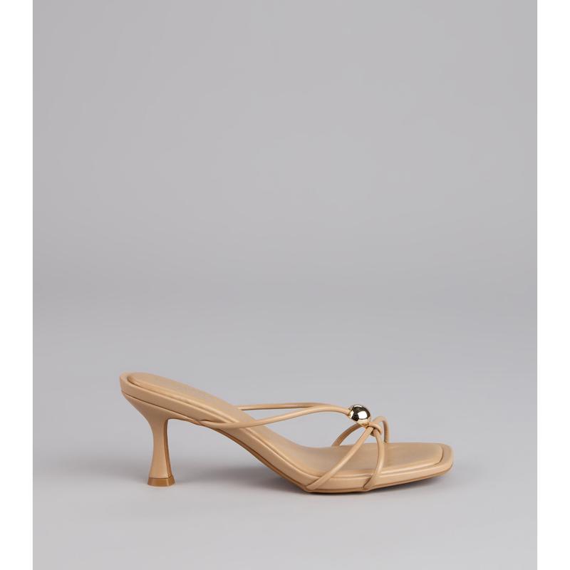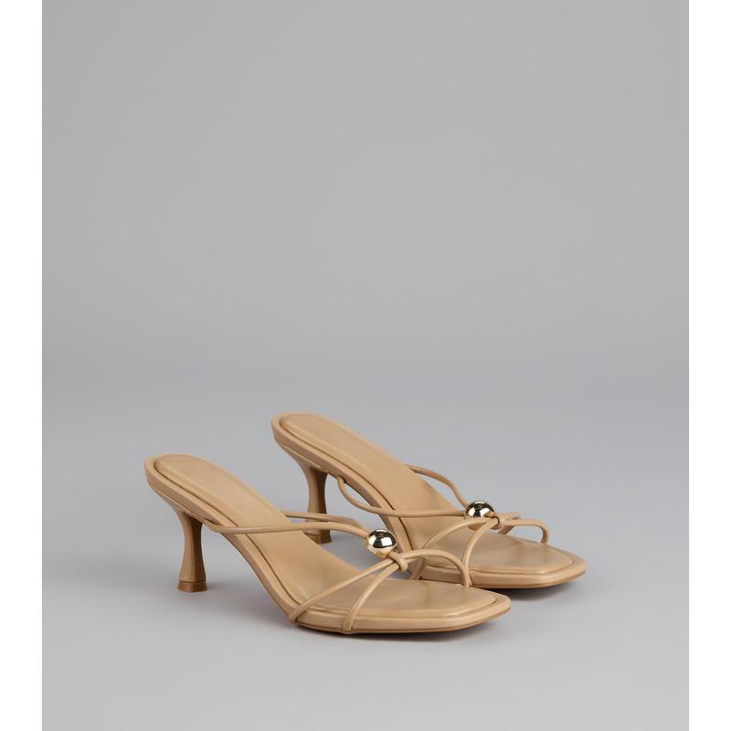These strappy square toe stilettos feature a sleek mule silhouette topped with a chic gold ball accent that turns every step into a statement.