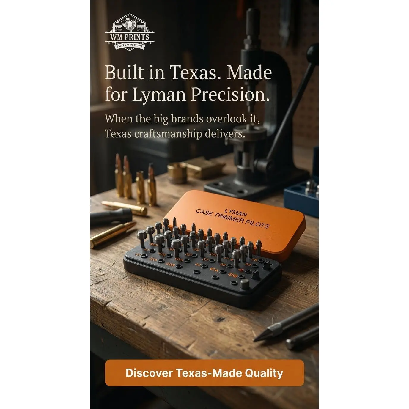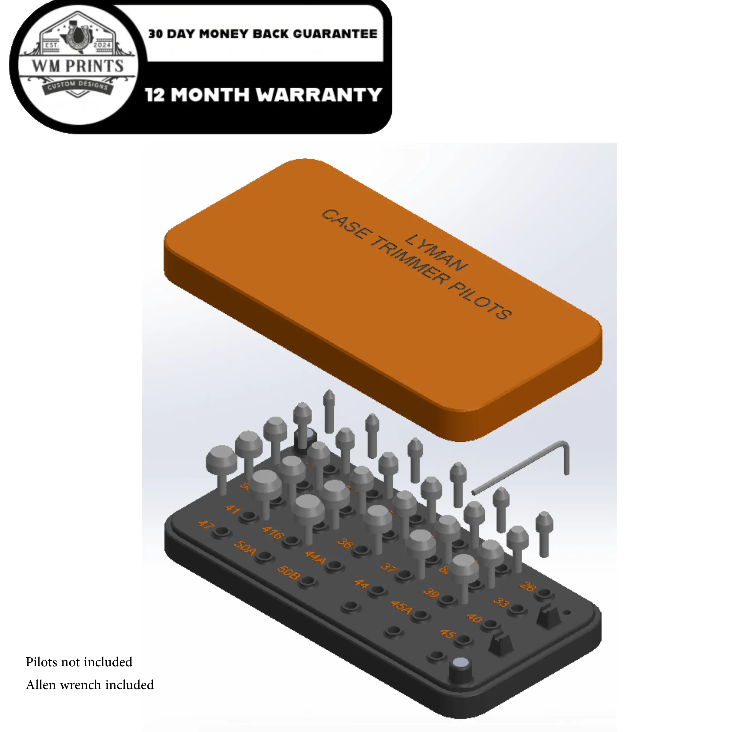 The LYMAN Case Trimmer Pilots Holder (Lyman pilots only) is a 3D-printed, durable storage solution with an included Allen wrench, made in Texas.