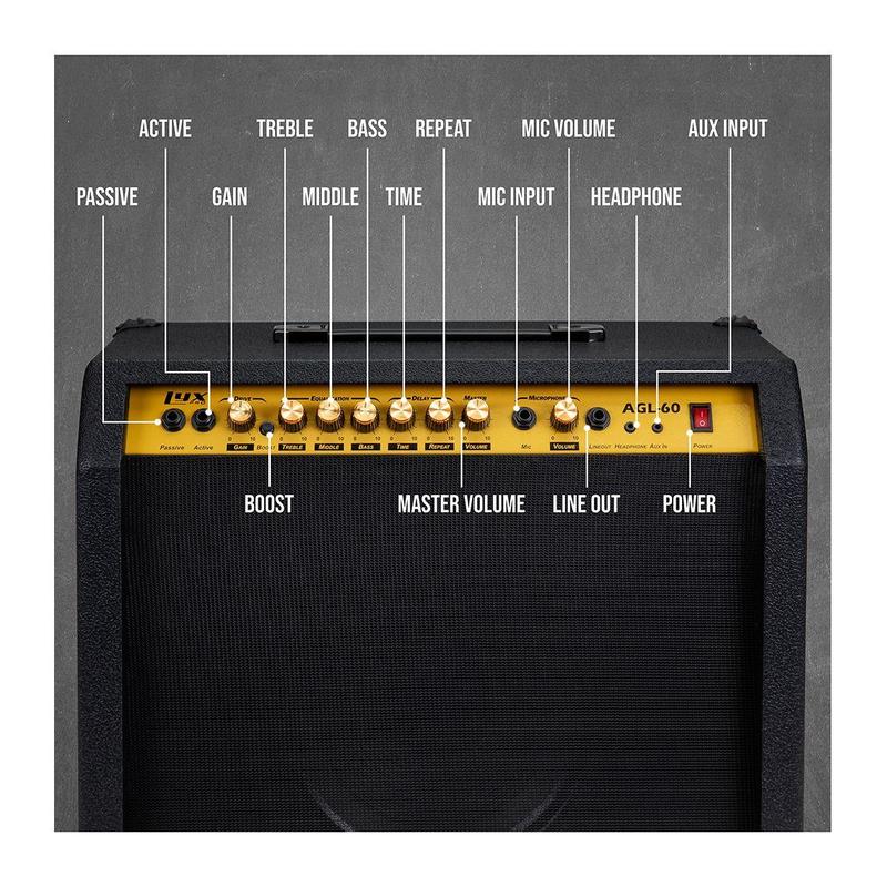 ·Six EQ controls: boost, gain, bass, mid, treble, and delay