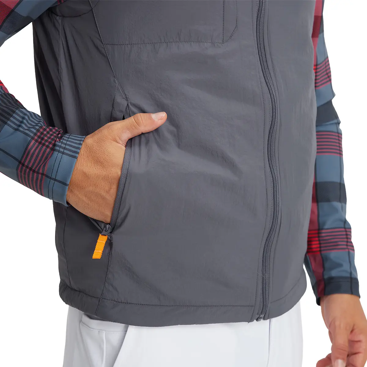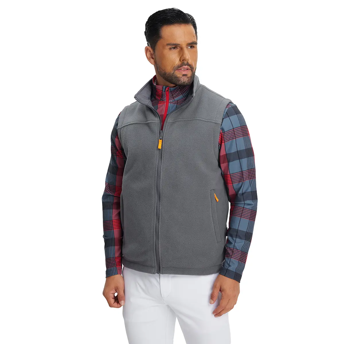 The M MAELREG Men's Golf Vest is a versatile outerwear piece. It features a reversible fleece design, perfect for adaptable weather. This sleeveless jacket is windproof and lightweight, ensuring comfort. The softshell material adds warmth without bulk. Ideal for men seeking a functional and stylish golf vest.