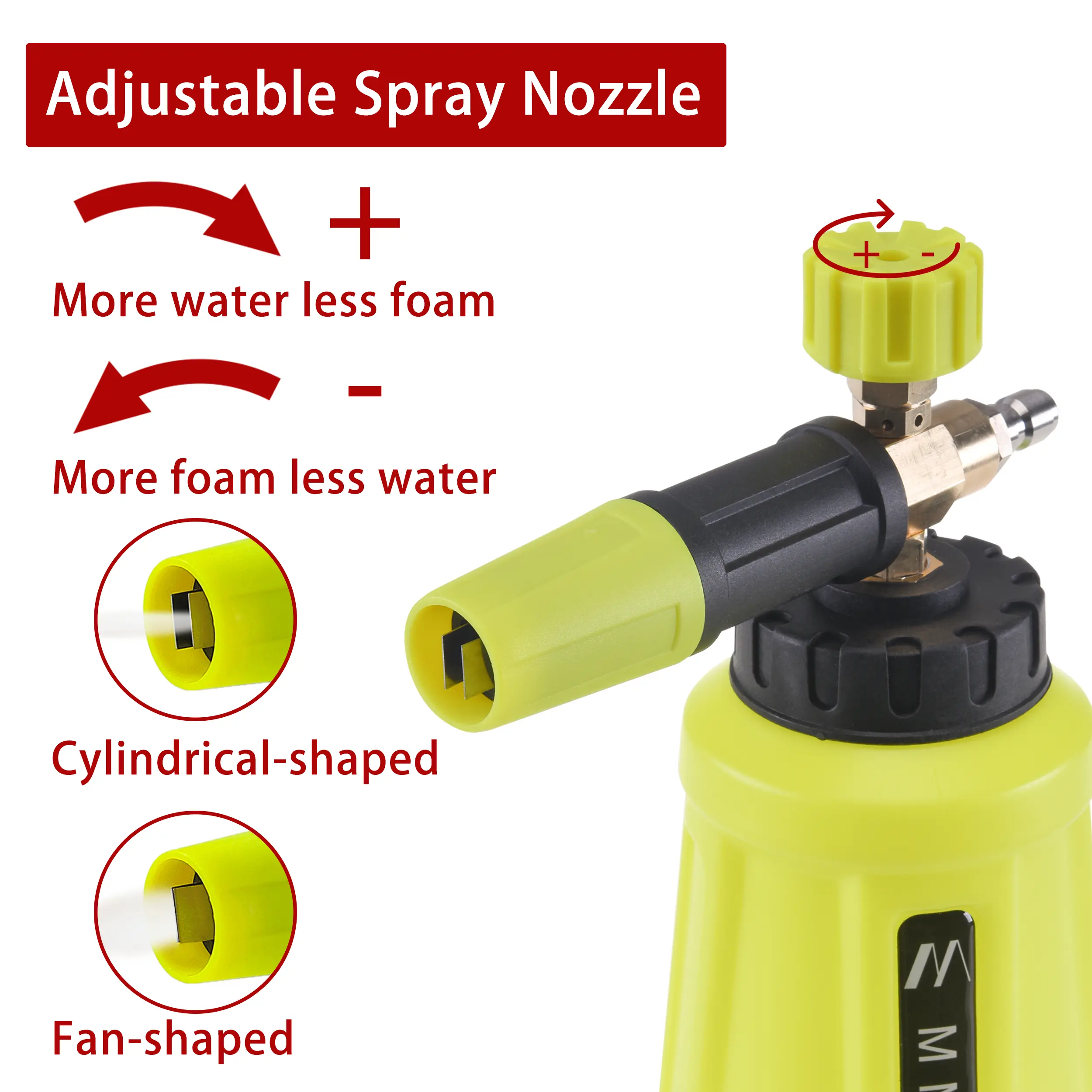 ·Adjustable Foam Blaster for Pressure Washer: Adjust the spray nozzle to get a proper sprinkle pattern. Water regulator knob to control water and foam. Adjust the knob on the top to control water mix in. Turn the top knob right, minus (-) sign indicates less water (more foam), the (+) indicates more water (less foam). Front rotating adjustable nozzle to change jet pattern: water column and fan.
