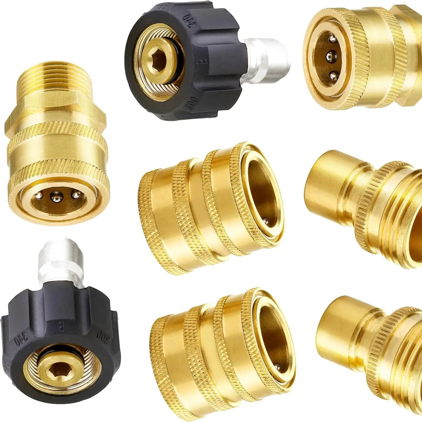 This 8-pack set includes 4 types of couplers: Metric M22-14 female + 3/8'' plug, 3/8'' socket + M22 male, 3/4'' female + 1/2'' socket, and 1/2'' plug + 3/4'' male. Ideal for various pressure washer needs.