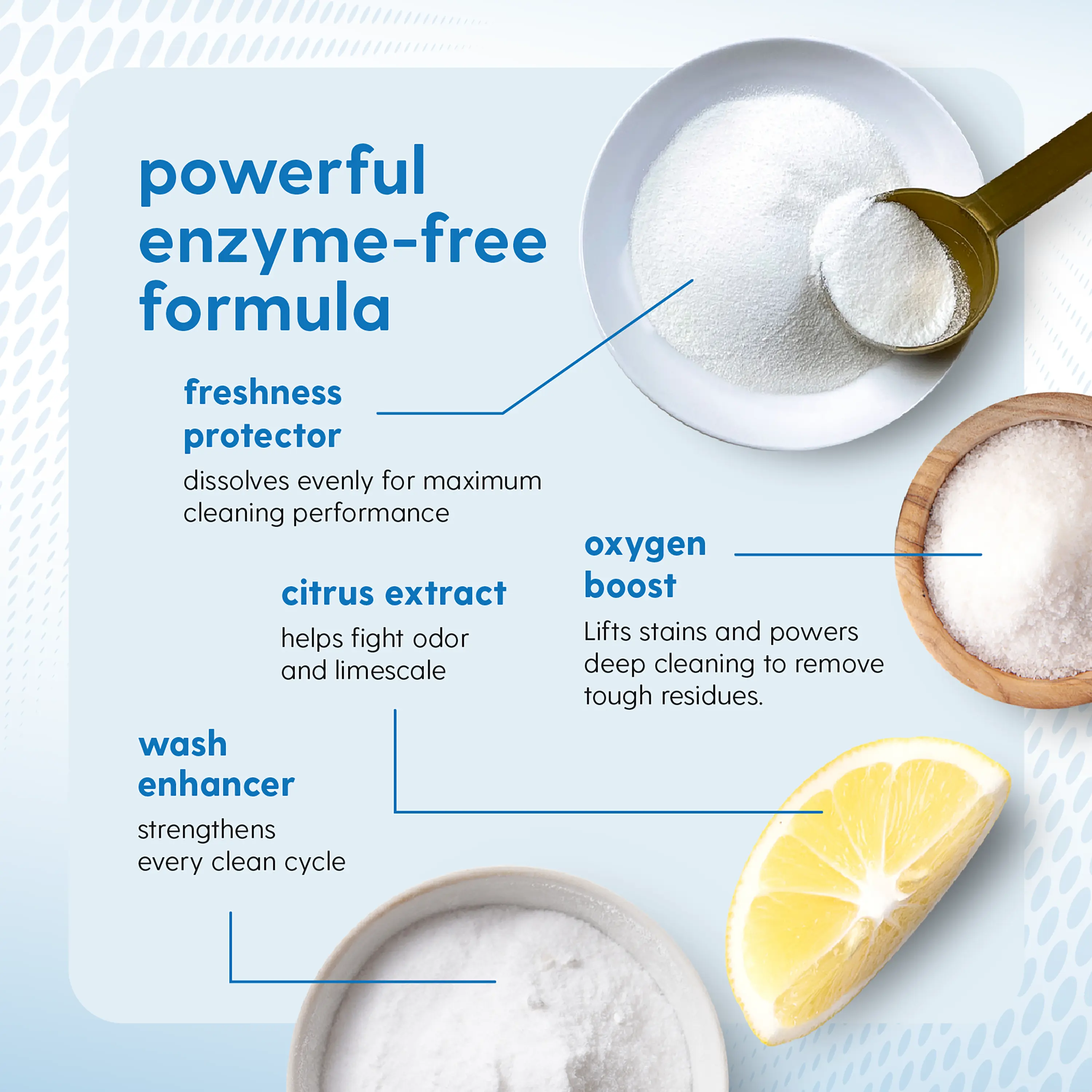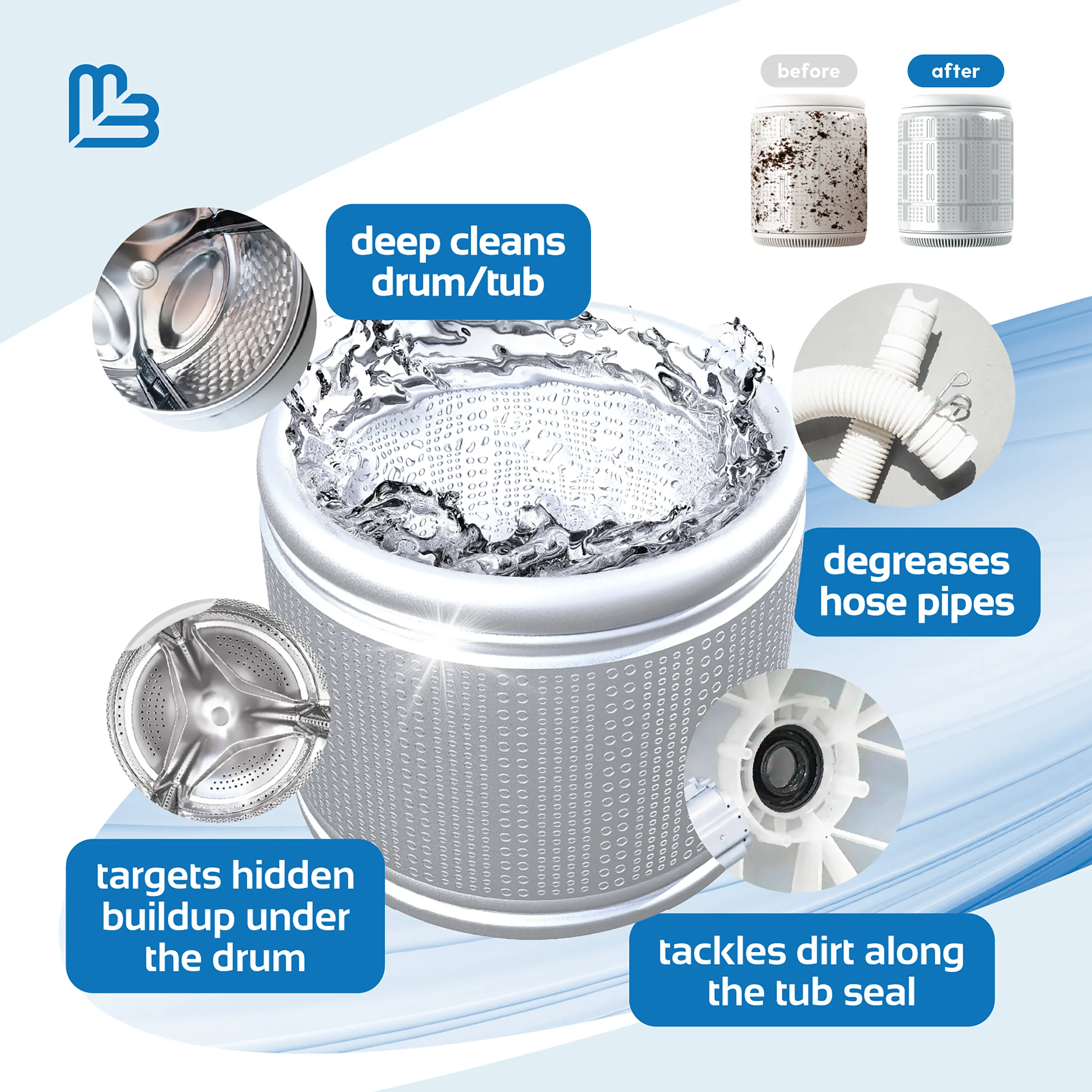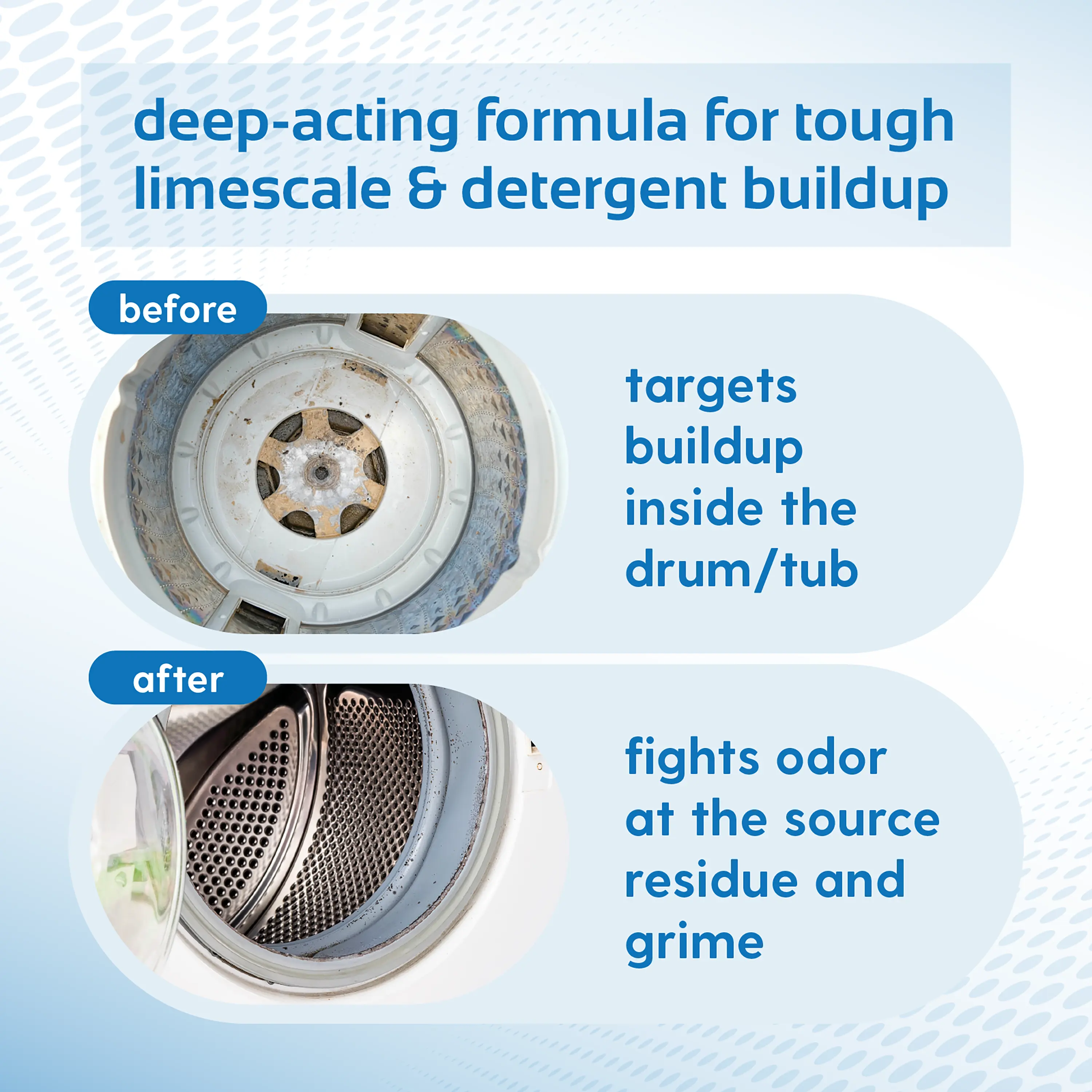 Our tough grime fighting formula breaks down detergent residue, limescale, and buildup. It restores your washing machine's performance, ensuring your clothes come out cleaner. Say goodbye to stubborn stains and hello to fresh, clean laundry.