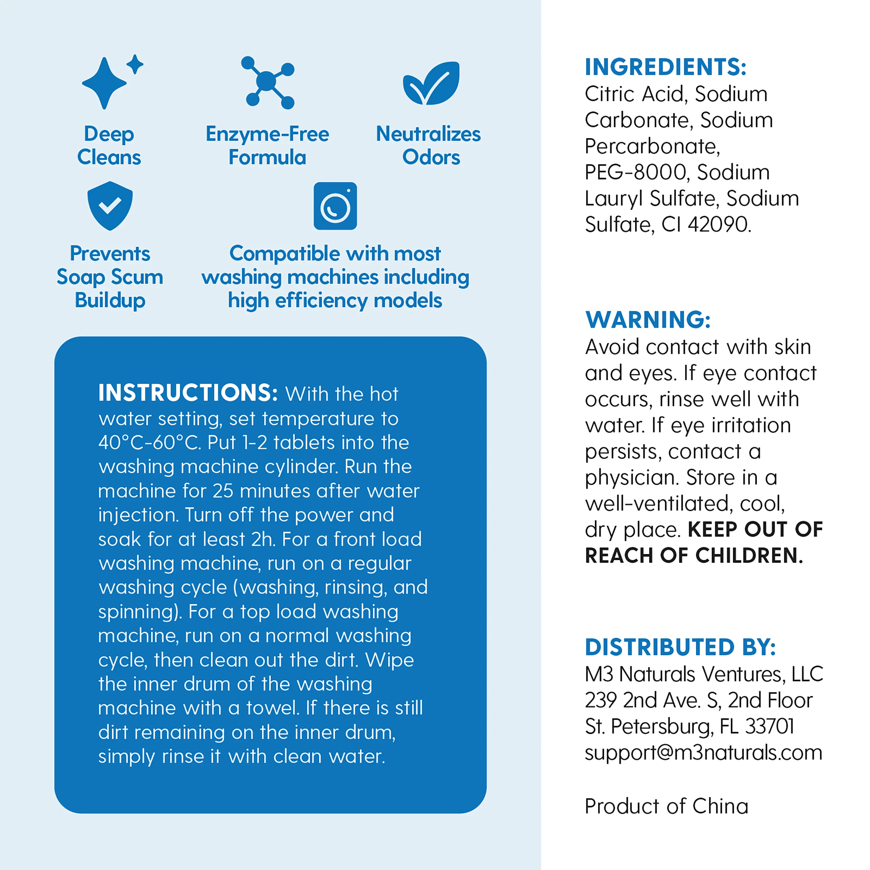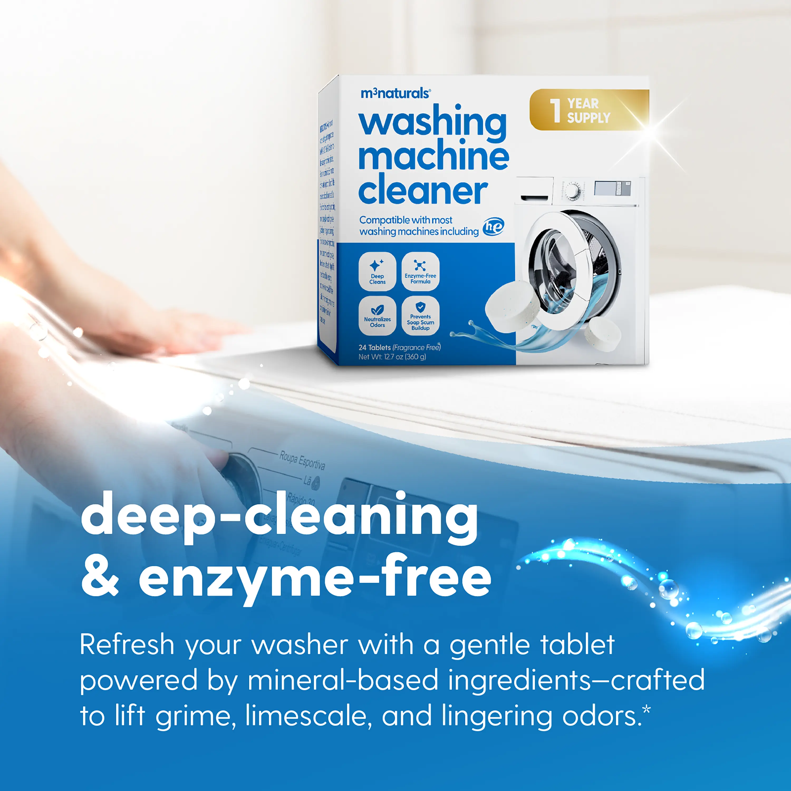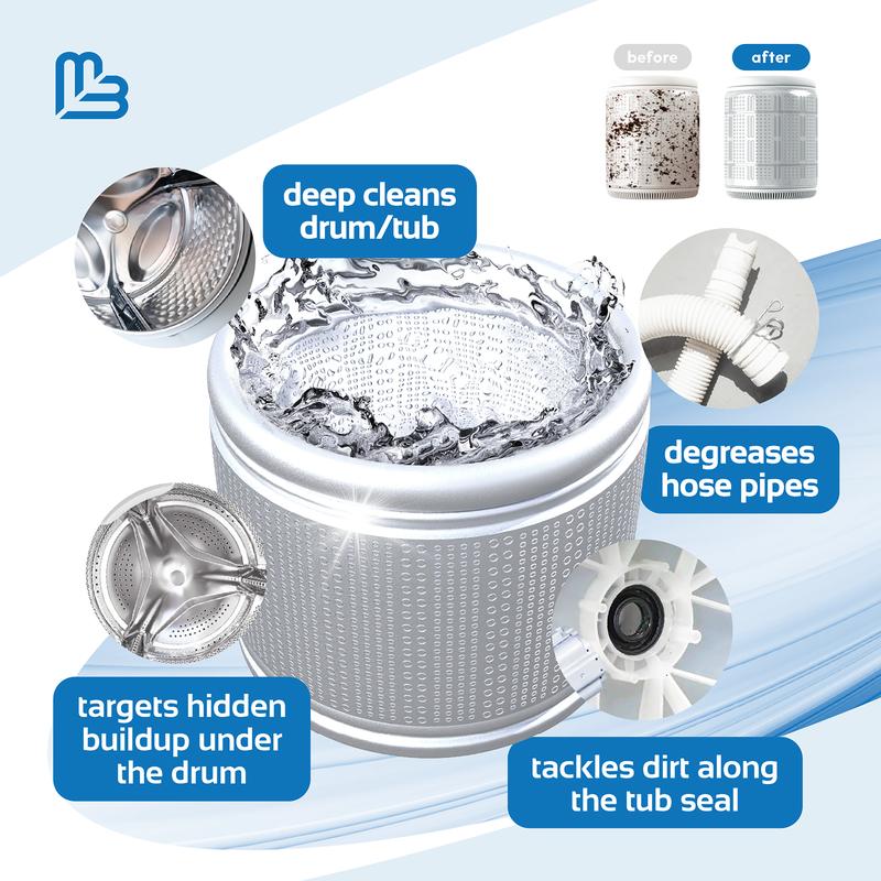 Drop and Go Tablets: Pop M3's washer machine cleaner tablet into an empty drum—no measuring, no mess. Works with front and top load washers to dissolve grime and keep your machine fresh. Enjoy a hassle-free cleaning experience every time.