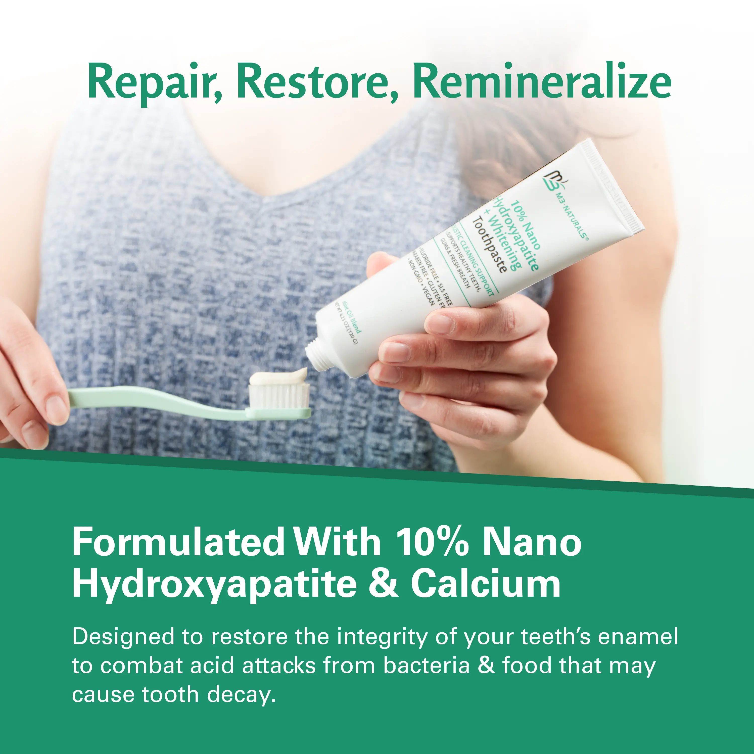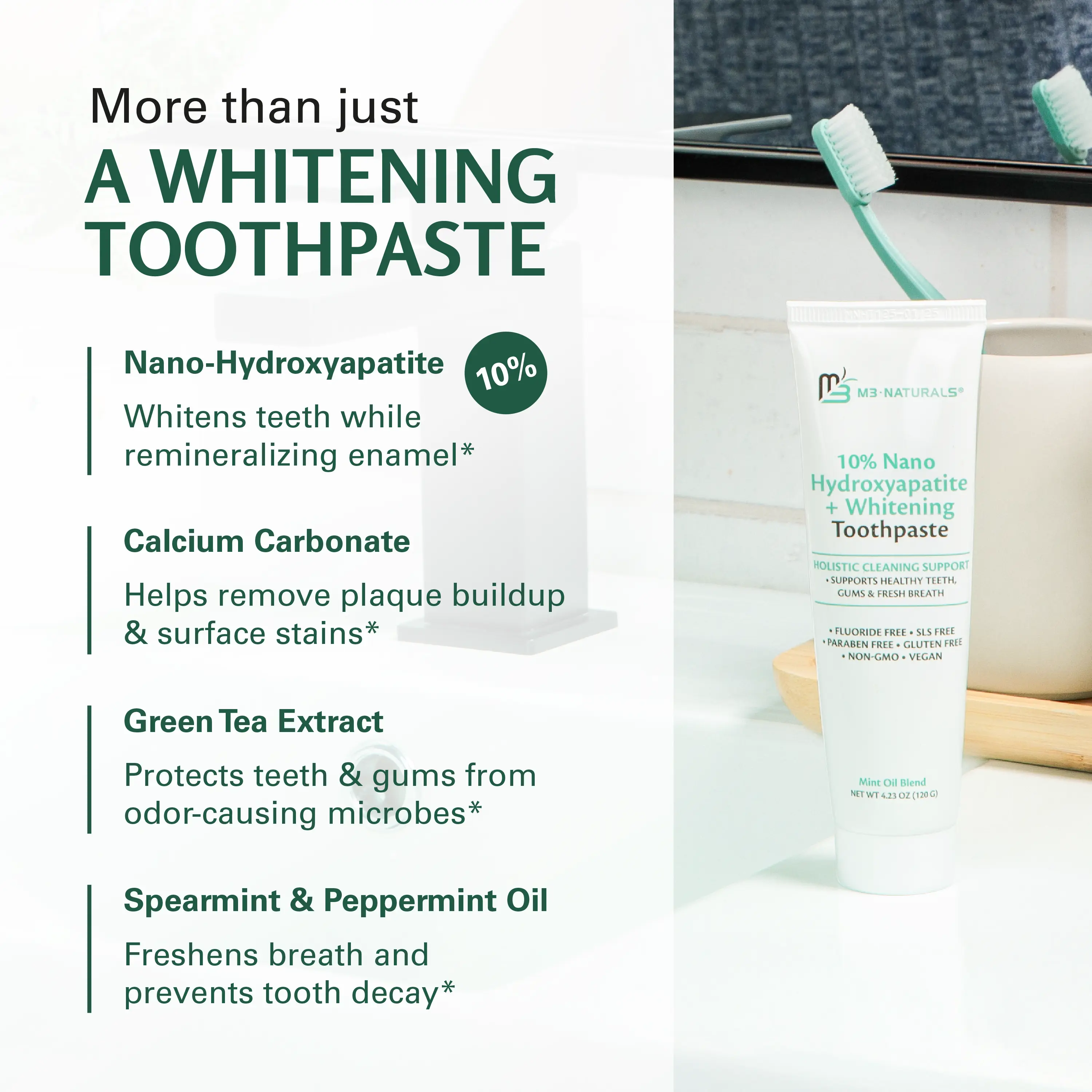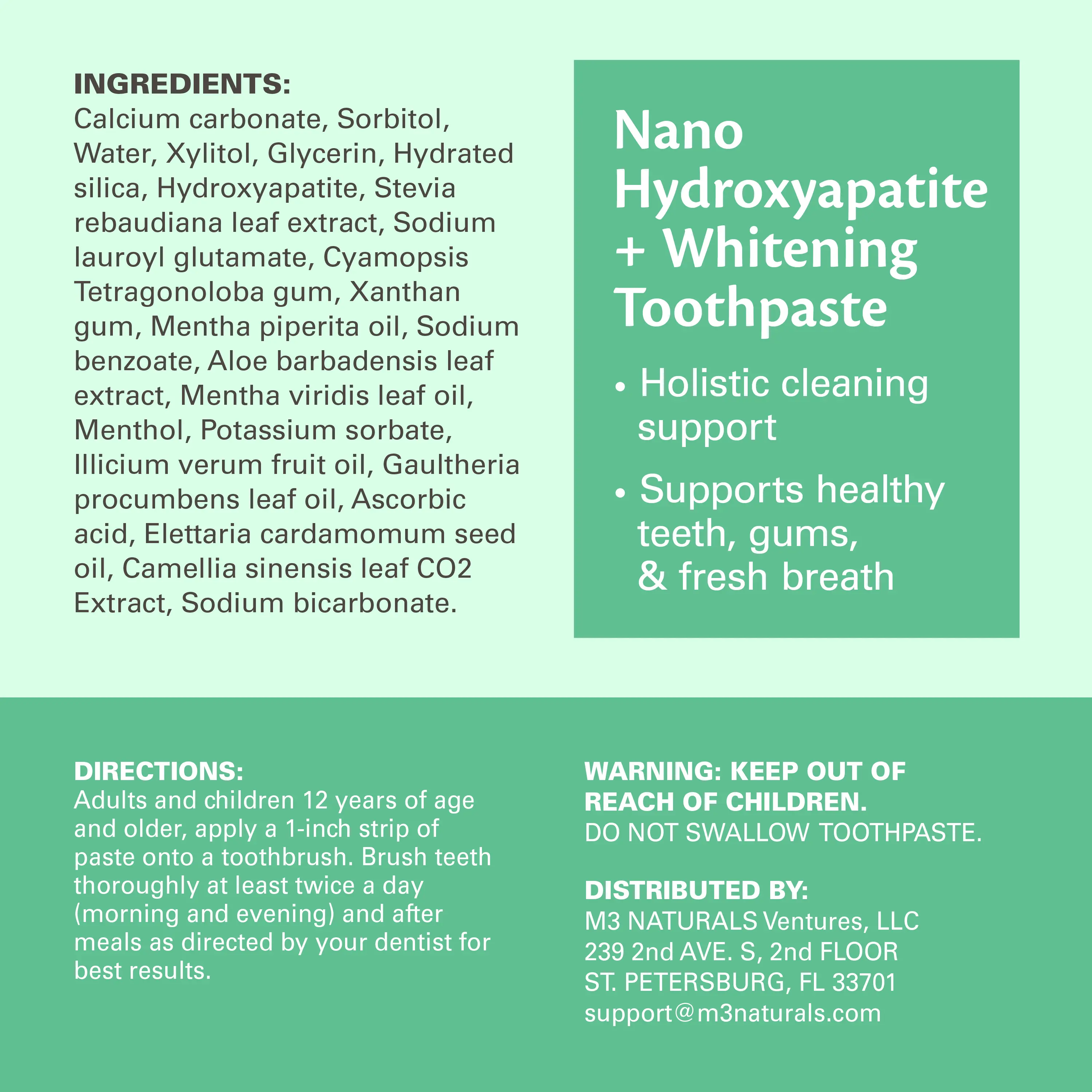 ·Eating & drinking are part of life, so it's normal to gain surface stains over time. You can rebuild gum strength, whiter teeth & fresher breath with our flouride-free hydroxyapatite toothpaste cavity & tartar solution with ZERO artificial flavors—we have infused our toothpaste with spearmint & peppermint oil. M3 Naturals is a brand that contains products that contain natural ingredients and other ingredients.