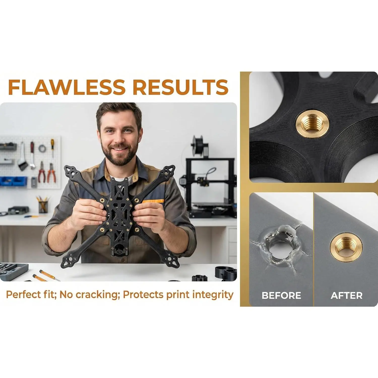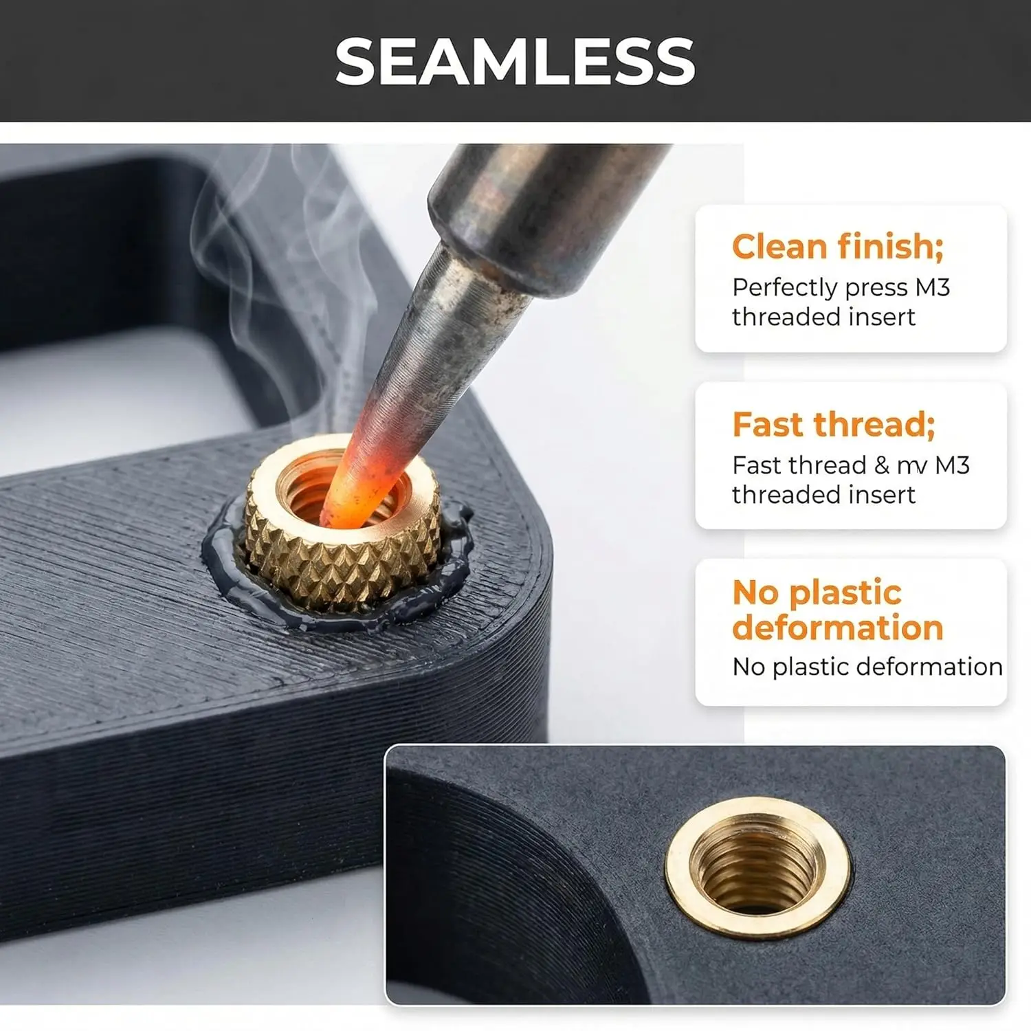 Comprehensive -in- Kit:Includes a 60W digital soldering iron, 2 M3 heat-set insert tips, 2 connecting rods, 120 count threaded inserts, 200 count , 100 count nuts, and 2 allen wrenches—everything needed for professional insert installation