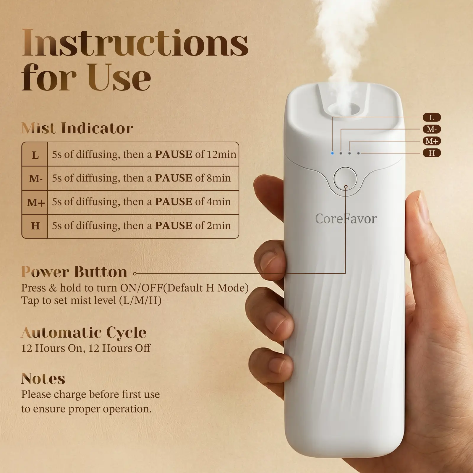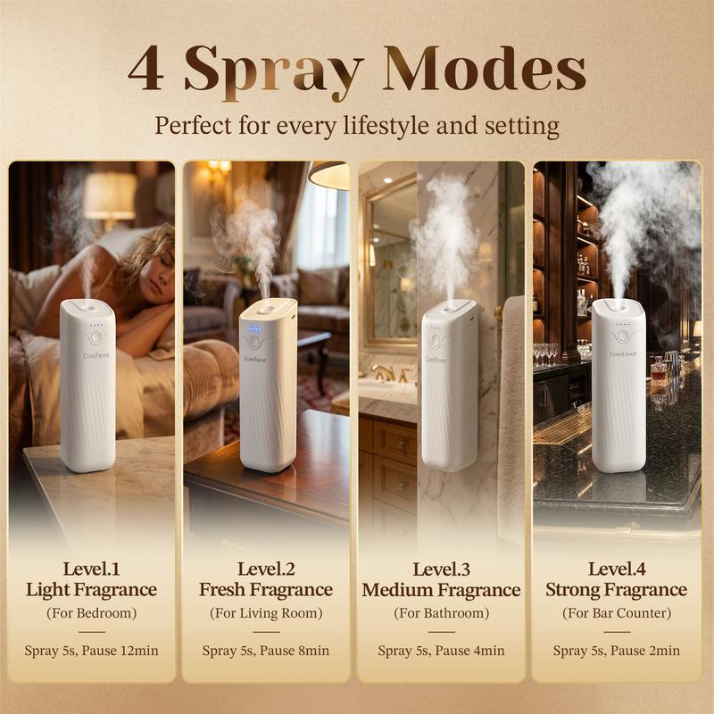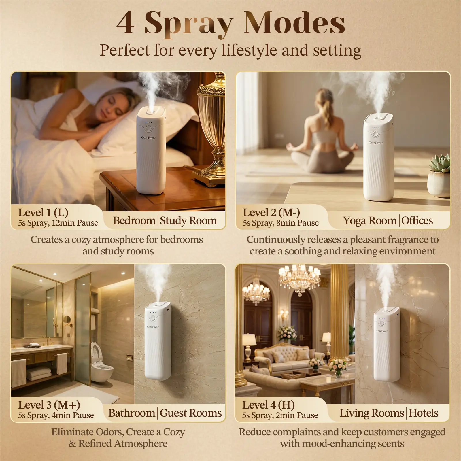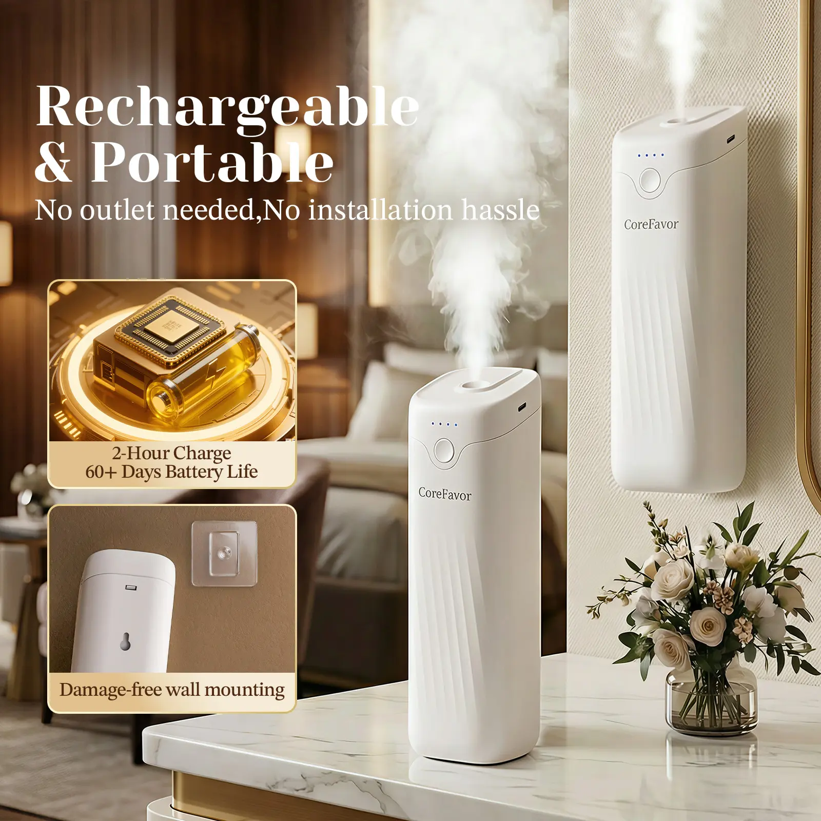The CoreFavor Automatic Home Fragrance Diffuser is designed to deliver a simple and flexible fragrance experience for modern living spaces. With a one-button automatic spray system, it releases fragrance evenly without the need for constant adjustment.Featuring ultrasonic atomization technology, the diffuser disperses scented oil into fine mist for balanced fragrance distribution. Four adjustable scent levels and a smart working cycle allow users to customize fragrance intensity based on room size and personal preference.The rechargeable, cordless design supports both tabletop and wall-mounted use, making it suitable for bedrooms, bathrooms, living rooms, offices,car,and commercial spaces. Quiet operation ensures it blends seamlessly into daily routines, providing a comfortable and refined fragrance atmosphere.