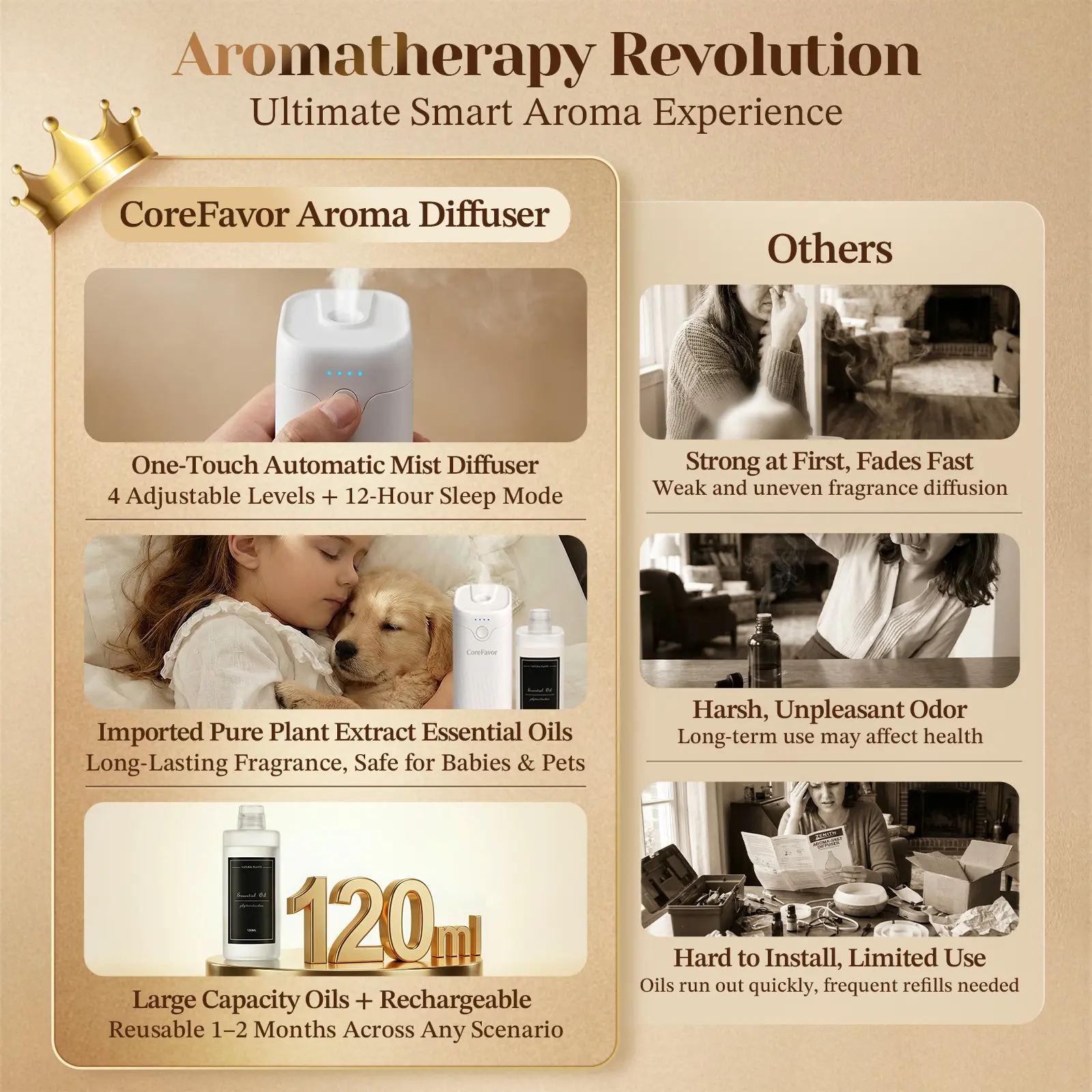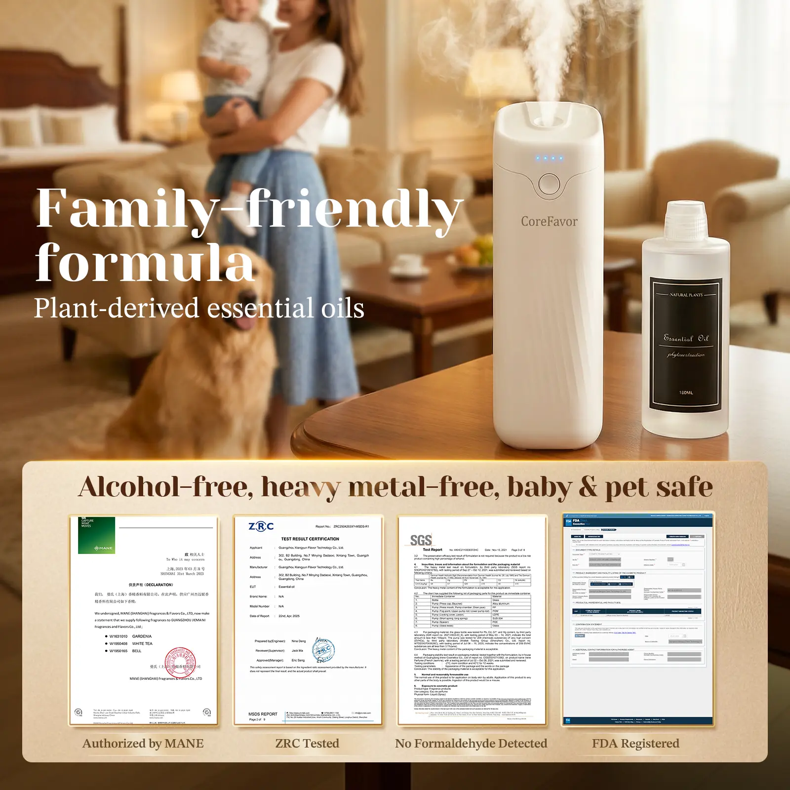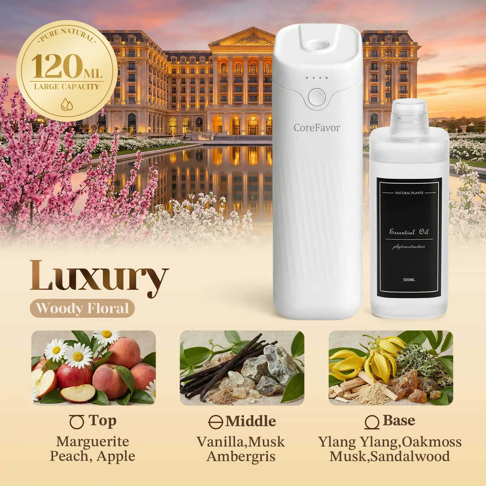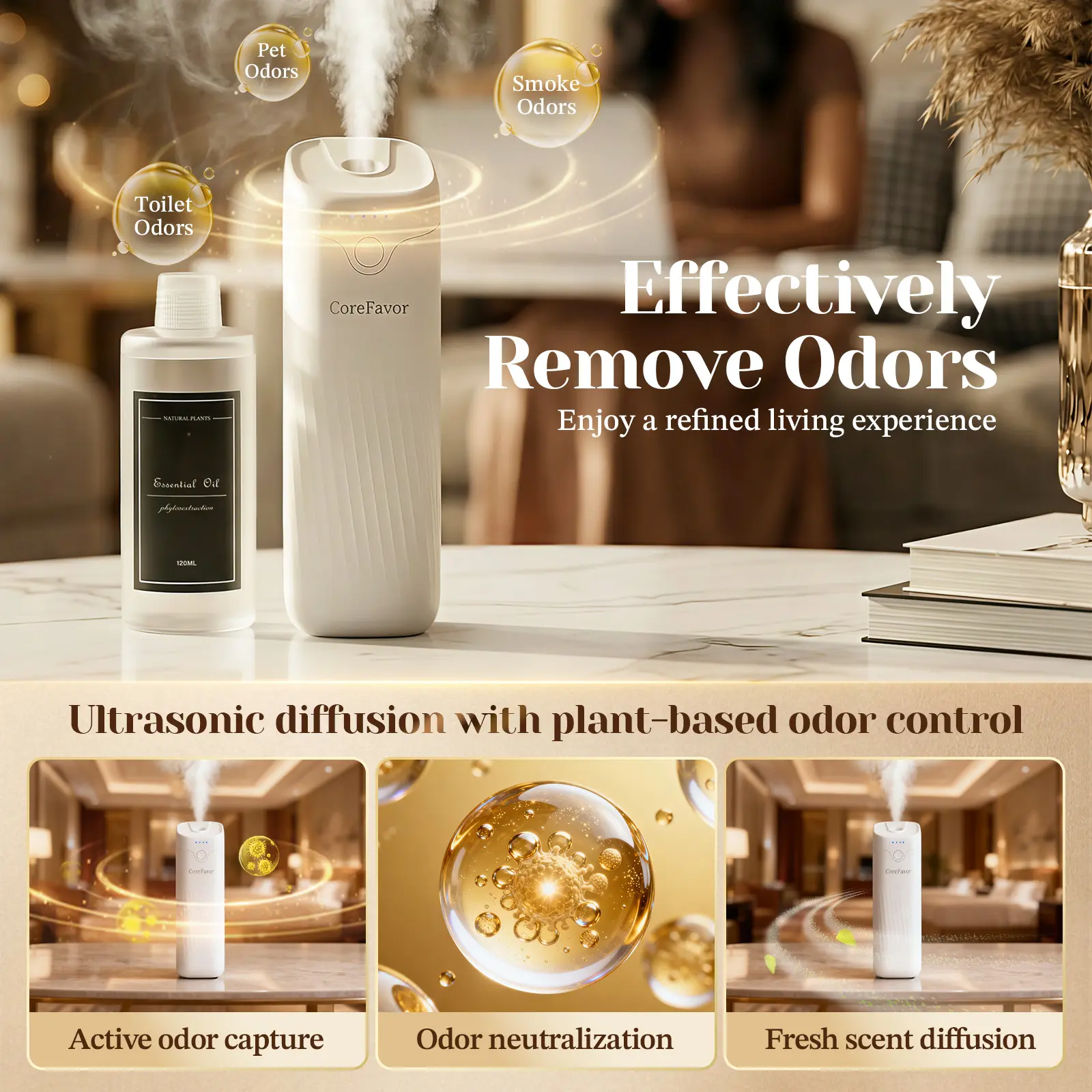 The CoreFavor Automatic Home Fragrance Diffuser is designed to deliver a simple and flexible fragrance experience for modern living spaces. With a one-button automatic spray system, it releases fragrance evenly without the need for constant adjustment.Featuring ultrasonic atomization technology, the diffuser disperses scented oil into fine mist for balanced fragrance distribution. Four adjustable scent levels and a smart working cycle allow users to customize fragrance intensity based on room size and personal preference.The rechargeable, cordless design supports both tabletop and wall-mounted use, making it suitable for bedrooms, bathrooms, living rooms, offices,car,and commercial spaces. Quiet operation ensures it blends seamlessly into daily routines, providing a comfortable and refined fragrance atmosphere.