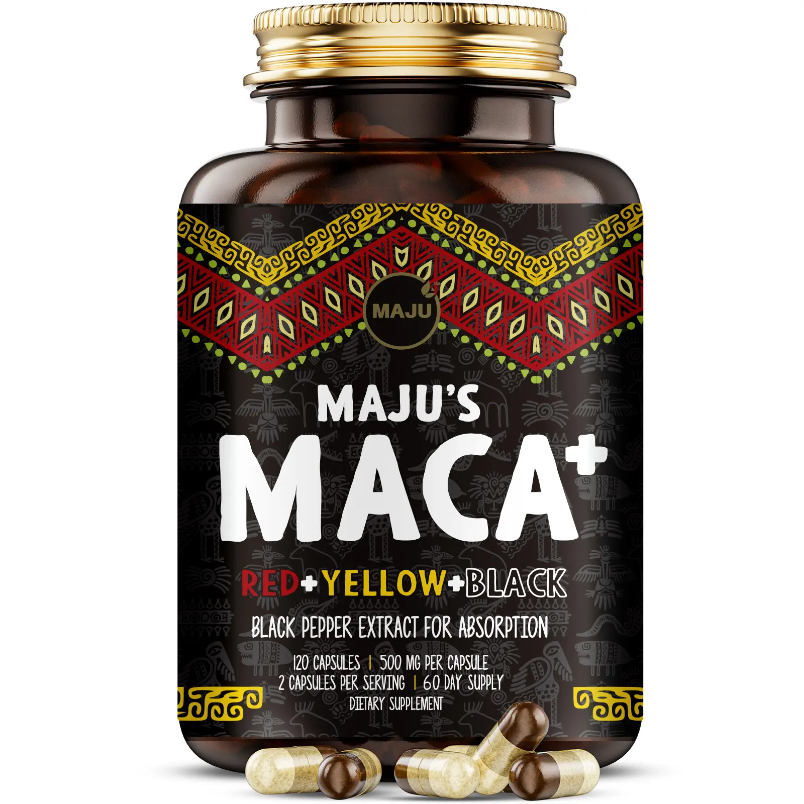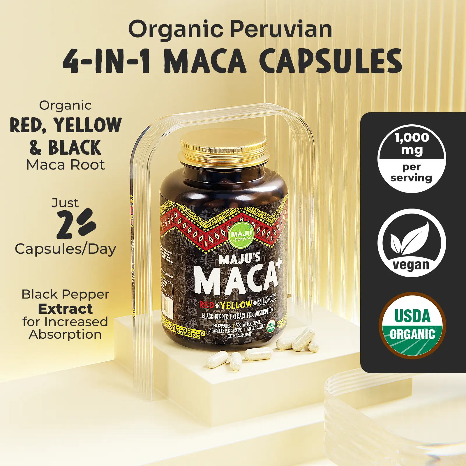·Prremium 4-in-1 Peruvian Maca Blend: Our potent, extra strength pure maca root is harvested from the High Andes. Packed with 500mg per capsule and 1,000mg per serving, these pills mix rare Organic red, yellow and black maca roots with black pepper extract for increased bioavailability and absorption, so you get the most out of this plant-based supplement.