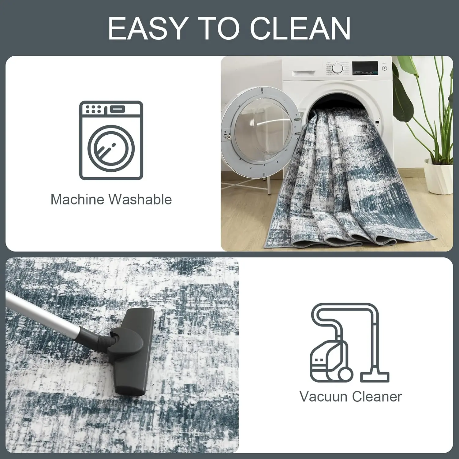 Machine Washable: Machine washable carpets make cleaning easier! Low pile design keeps most dirt on the surface. The surface of the carpet is water repellent, so if there is an accidental spill, just wipe it up with a towel.