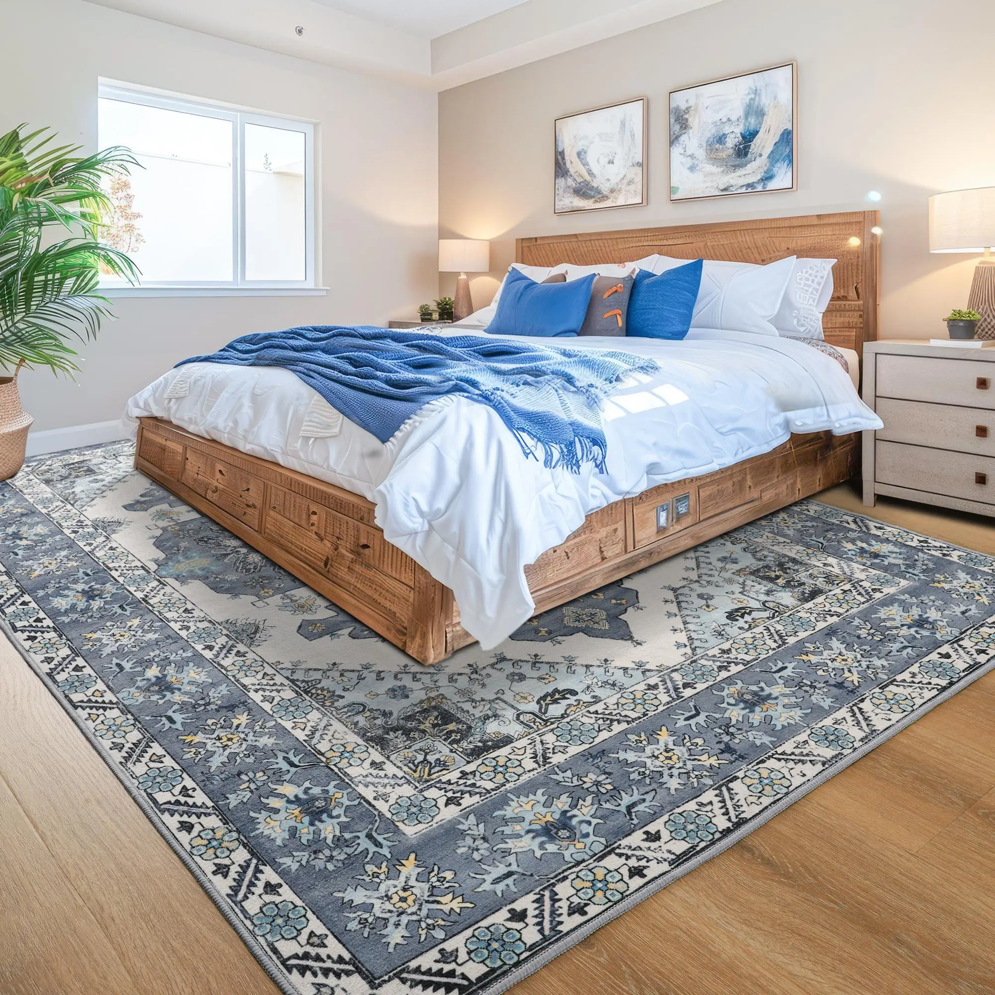 KEEP WARM & REDUCE NOISE:Our low-pile rugs are made of durable fibers.It uses dense weaving technology to withstand high-traffic areas and pet scratches.Our living room rug is nice and warm.You can lie down on the carpet or walk barefoot to avoid putting your feet on the cold ground.At the same time, the bedroom rug has a good sound absorption effect, allowing you and your family to immerse in a quiet and comfortable atmosphere.