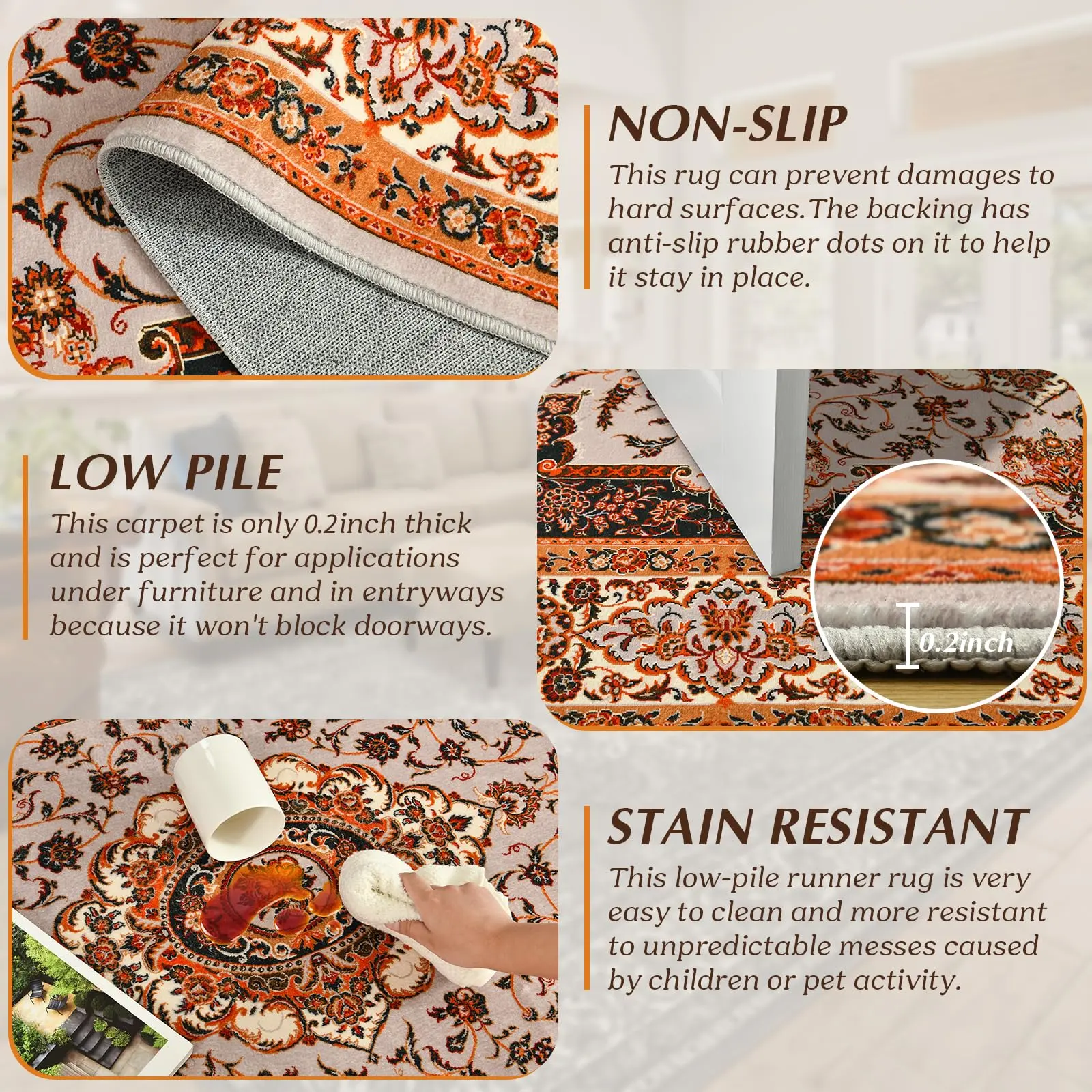 Washable Rugs: The carpets feature stain-resistant and machine-washable designs that make cleaning a breeze, perfect for busy households with kids or pets.