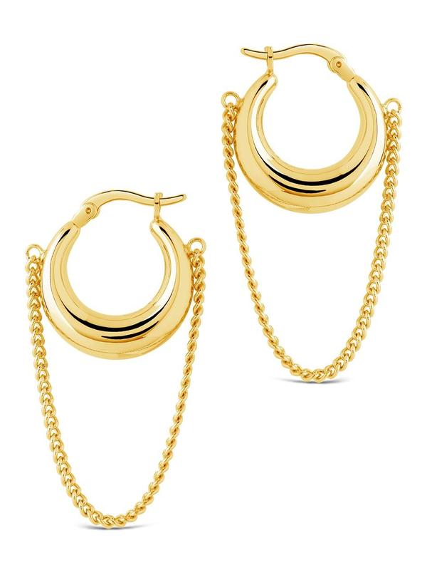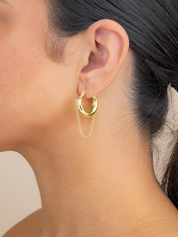 Sculptural hoops with a twist. These bold, high-shine earrings are finished with a draped chain detail that moves with you. Wear them when your outfit needs something a little unexpected.