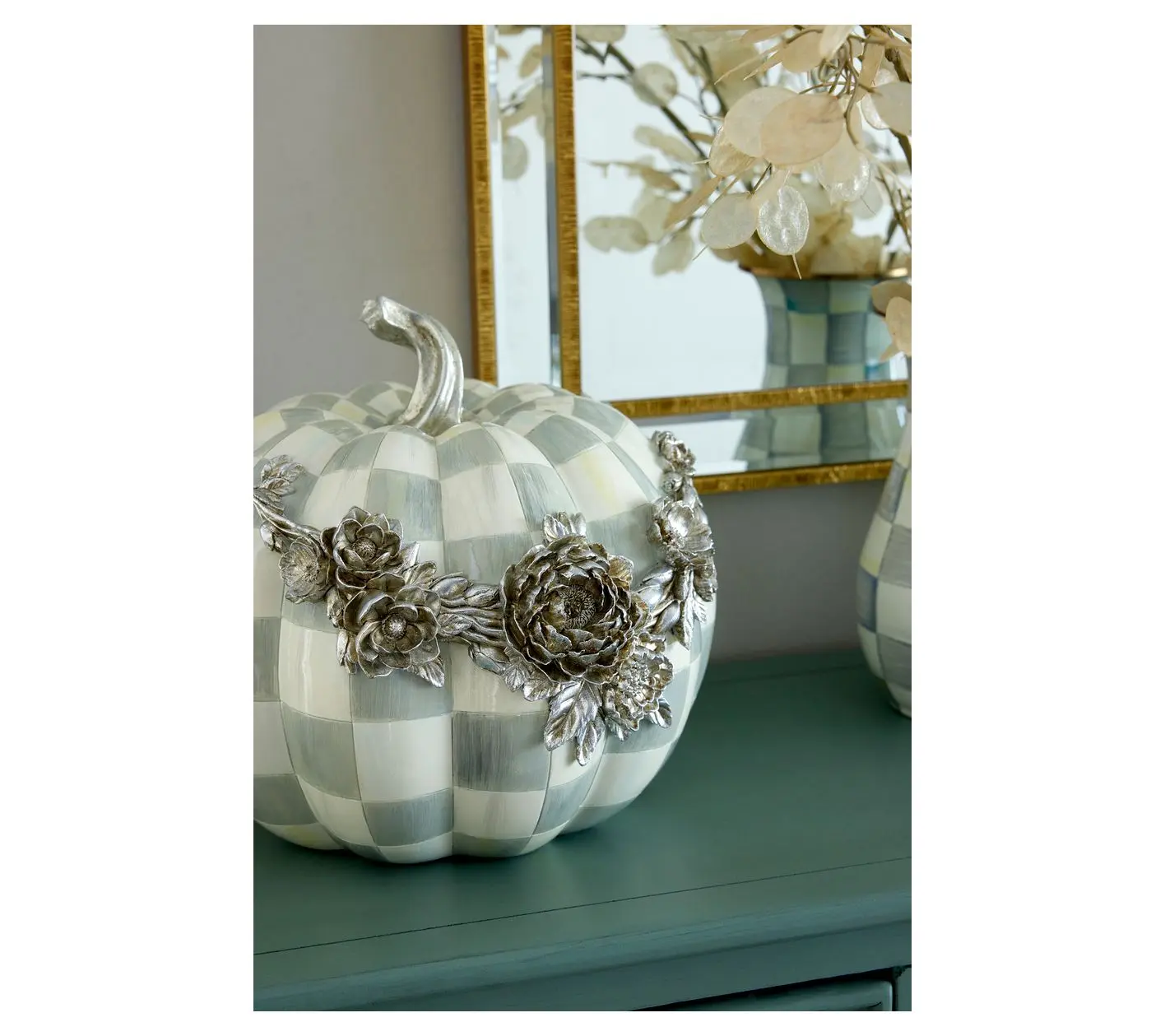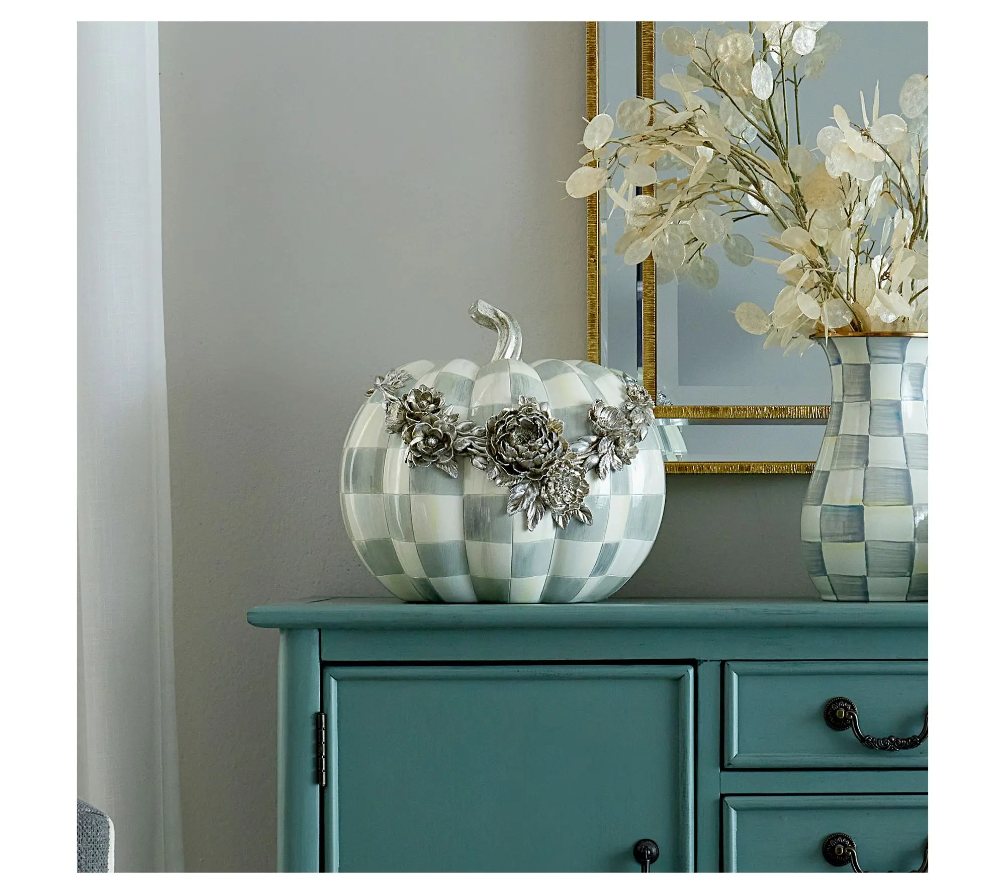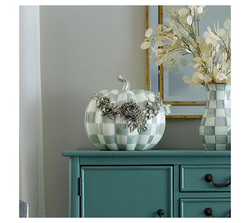Replying to @RoxTalks Give your decor a fresh look with this beautiful hand-painted pumpkin from MacKenzie-Childs. 🎃 The silver check pattern and silvertone flowers make it a sophisticated and unique piece that you can display all year long. #mackenziechilds