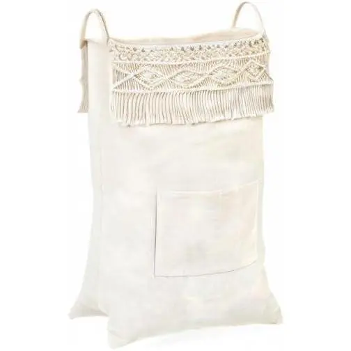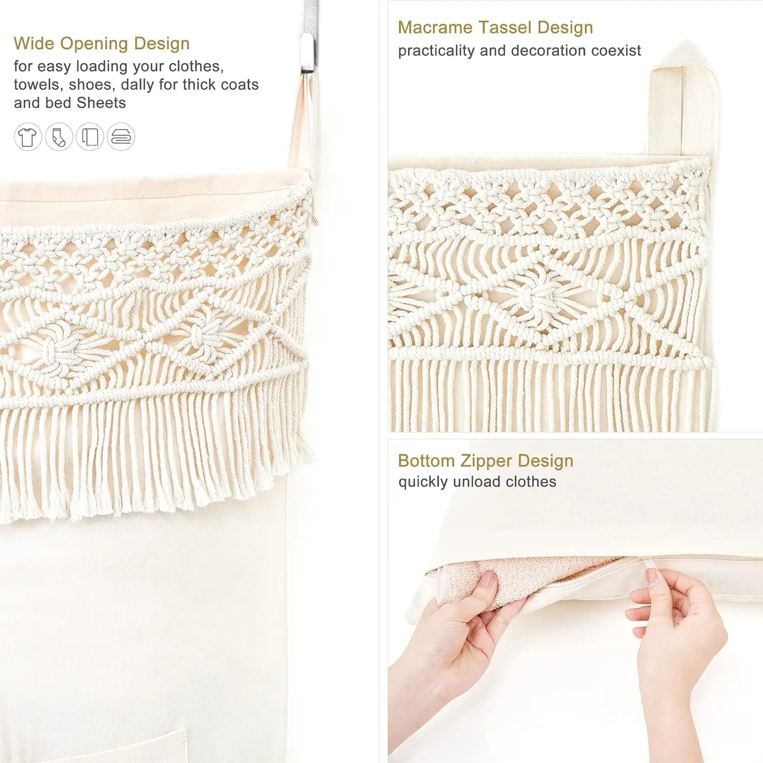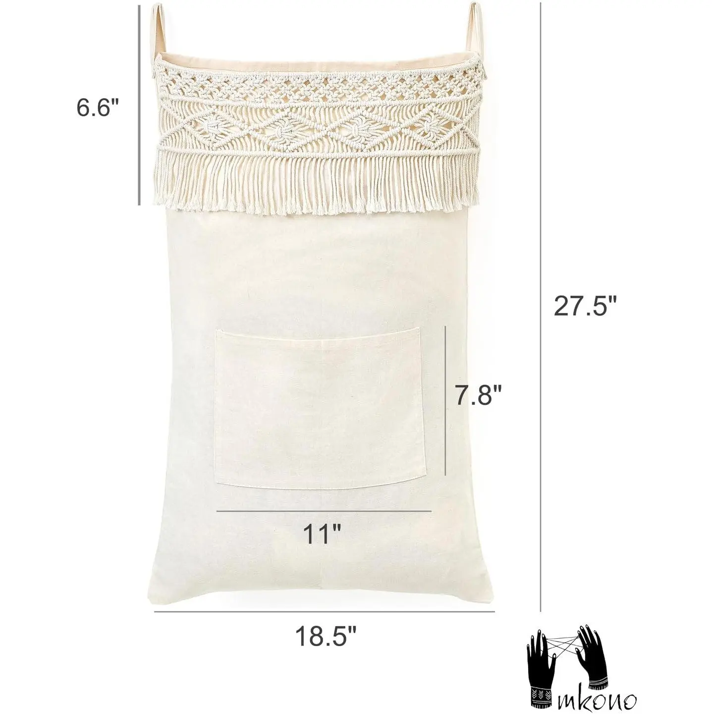 cottonUnique Design.This cotton hanging laundry hamper designed with woven macrame tassel string decorations outside, a cute boho style element to any home decor.Perfect fits in any college dorm,laundry room, bedroom, bathroom, living room, etc.Convenient Openning with Bottom Zipper Design.This hanging clothes hamper is easy to store dirty clothing, hooks make it easy to hold & carry it for laundry, while our laundry bag’s bottom-zipper design allows you to quickly unload clothes into your machine.This laundry hamper can be washed in the washing machine.Extra storage pocket.The total size of our space saving hanging laundry hamper measures is 18.5"(W)x27.5"(L).There is a additional pocket in the hanging clothes hamper, which can be used to put some socks.It is very convenient.Space Saving.The storage capacity of our hanging hamper bag is large enough to hold a lot of dirty clothes, and it’s helpful for storage any kind of clothes, scarves, hats, bedclothes and travelling,really save space.It's highly recommended for small spaces and laundry room, like families and college dorms who need more room.You can hang this laundry basket bag behind the door or anywhere you like. We also provide the stainless steel door hooks, can fit the door thickness at 1.77in. Mkono is a registered trademark and our product is professional manufacturing and sole selling.