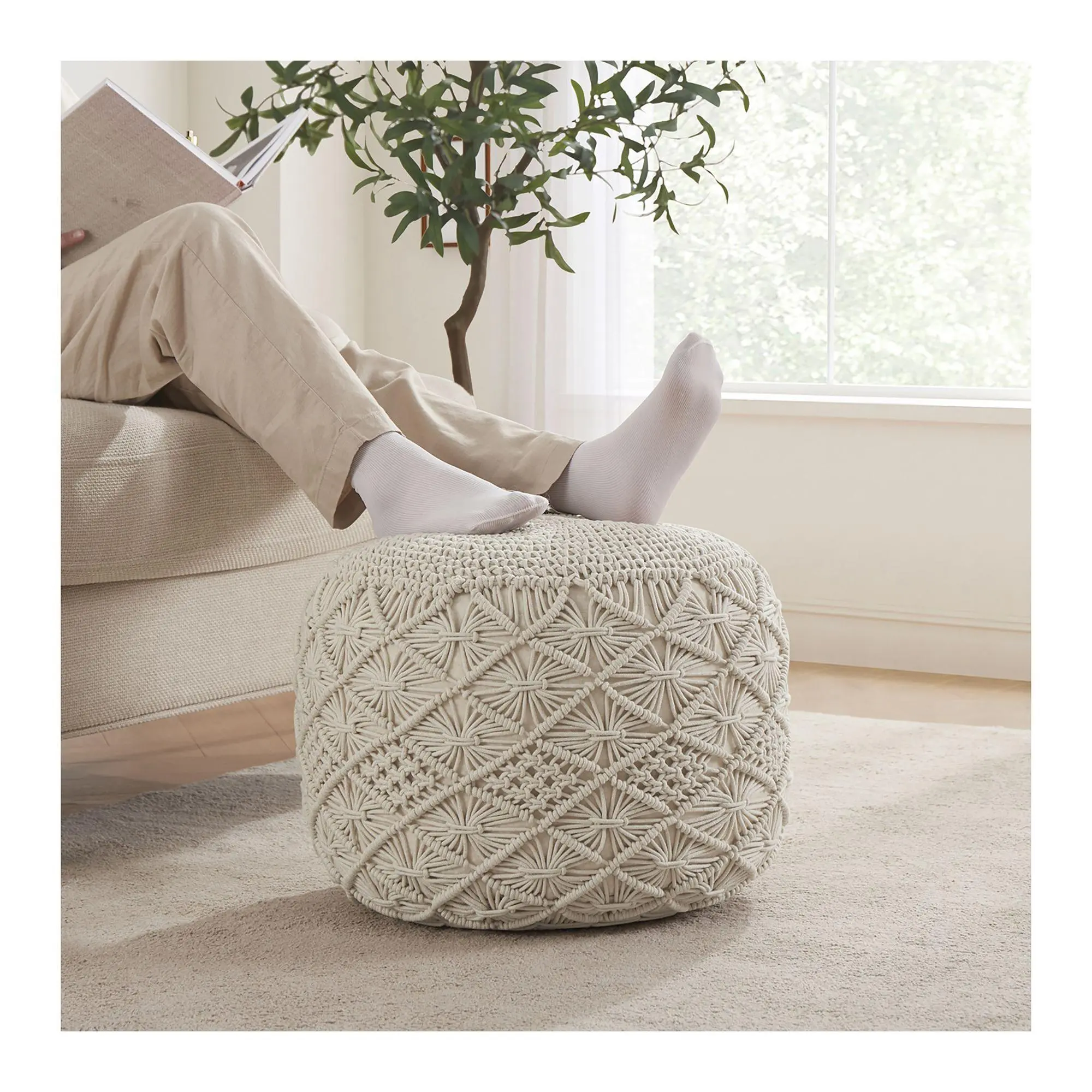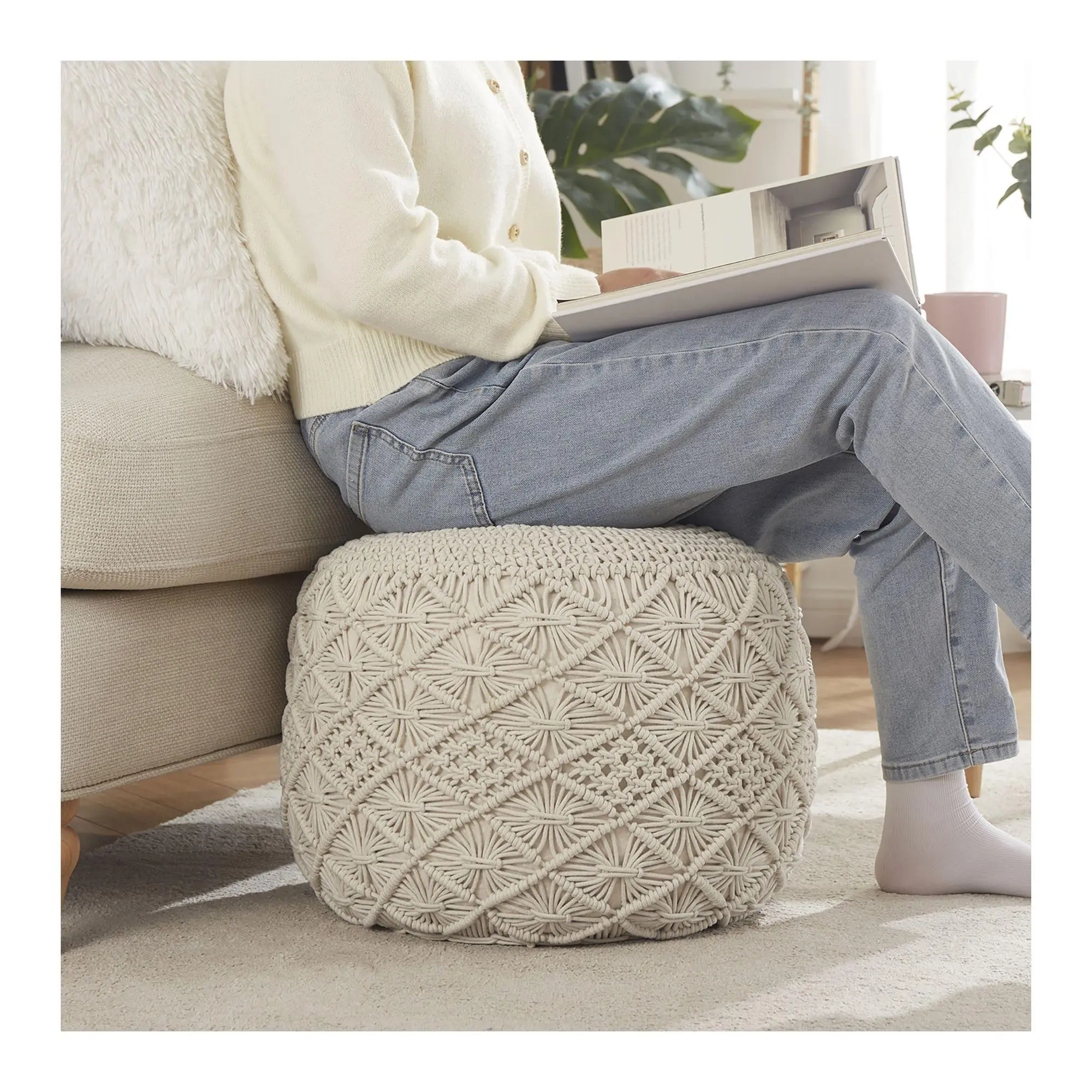 Ornavo Home Macrame Hand Knitted Braid Cord Pouf Ottoman