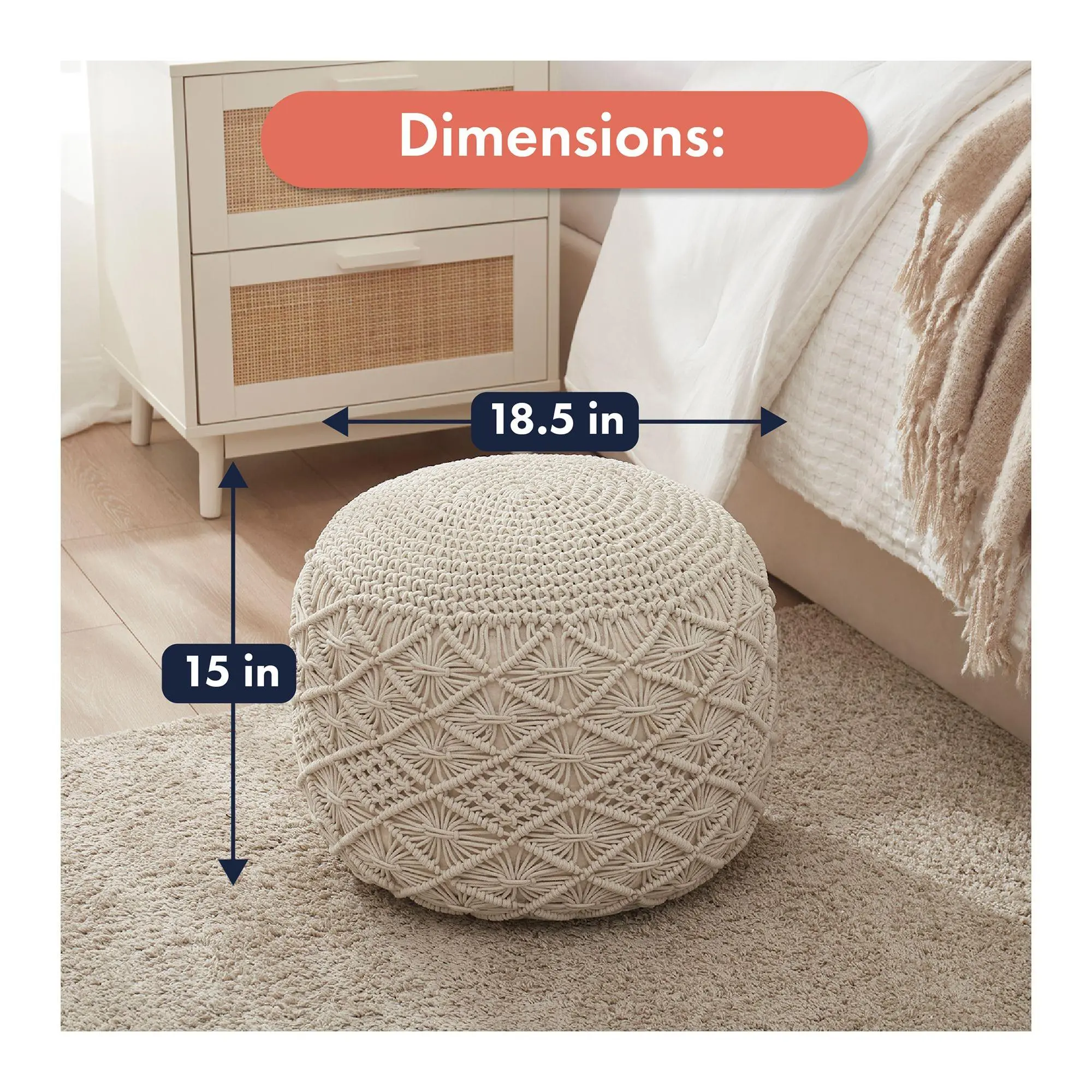 The Macrame Hand-Knitted Ottoman instantly turned this empty corner into the coziest little spot next to my bed #macrameottoman #bohodecorhome #cozycornerdecor #texturedhomevibes #footrest