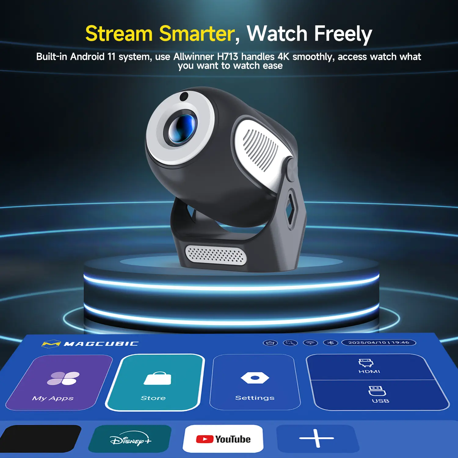 Equipped with the Allwinner H713 processor for smooth performance, WiFi6 for stable streaming, and Bluto*th 5.0 for pairing with your favorite speakers or headphones, this projector is built for versatility. The built-in speaker ensures clear sound without extra equipment.
