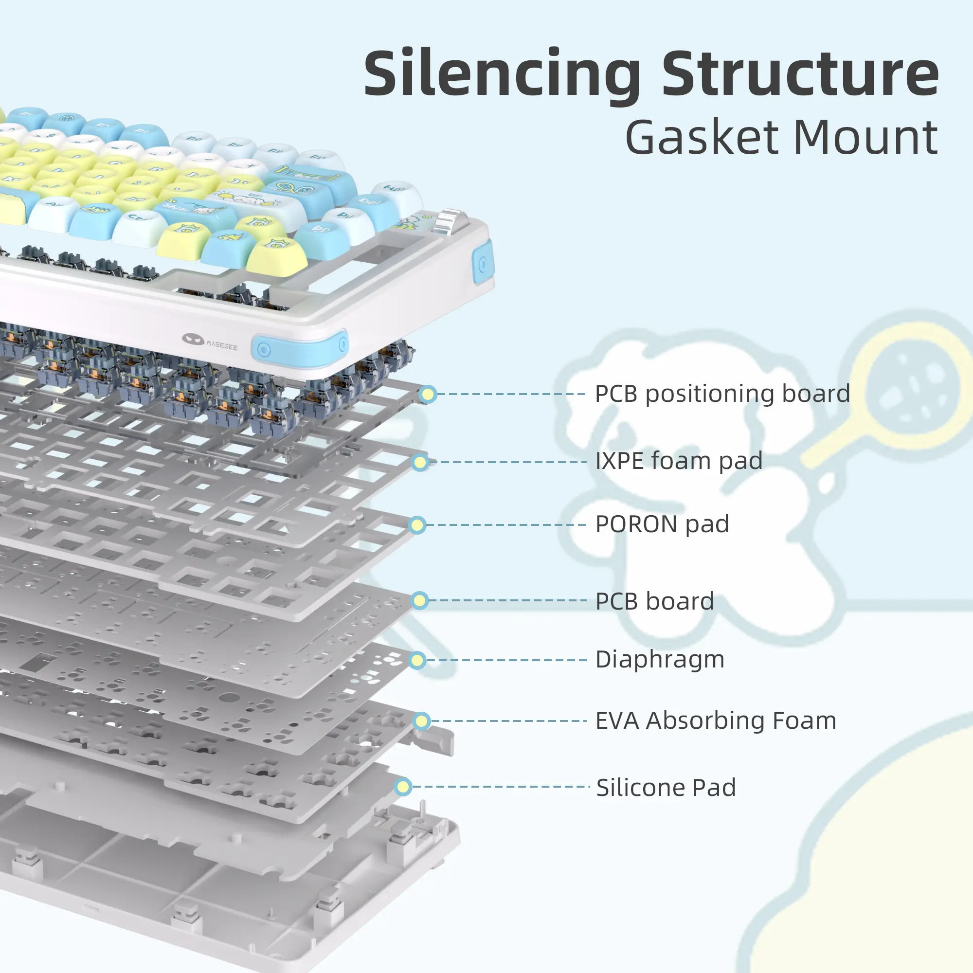 [Creamy Thock Sound Gasket Structure Keyboard]: AIR75 wireless keyboard mounting is different from the traditional screw fixing method, but using gaskets mounted on the top and bottom sides between the panel and the keyboard shell, which acts as a cushioning layer, in addition, the keyboard is designed with five layers sound-absorbing foams filling, can effectively reduces the noise, improves the typing comfort and accuracy, and brings crisp, clean and softer typing feel.
