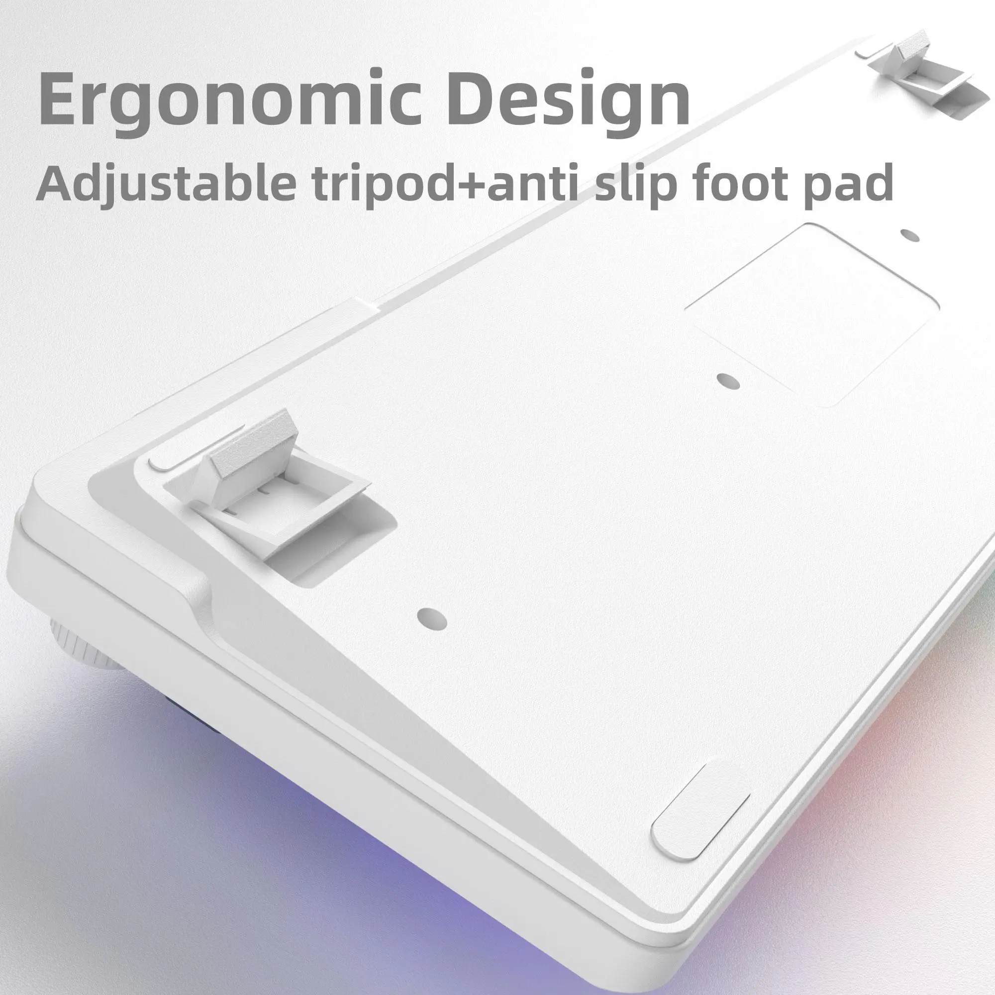 The MageGee GK960 is a multi-functional membrane keyboard with a 96% layout and 98 keys. It features a wired connection and an ergonomic design. The keyboard includes two-step back feet and side-printed keycaps. It offers adjustable RGB lighting and a knob design for volume and lighting control.