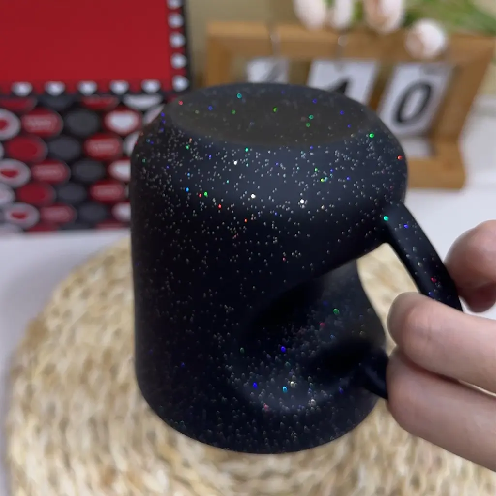 On the smaller side, but not small. Looks exactly like the photo. Very sparkly black untill the hot coffee gets poured in, and then the magic happens!!! 😃