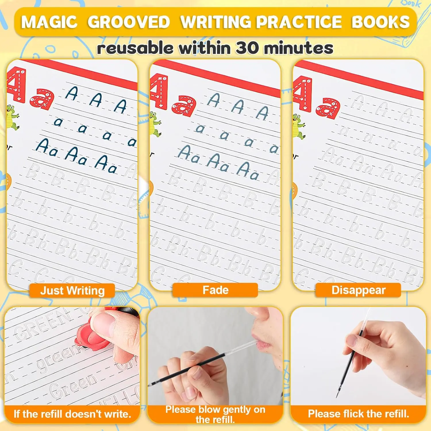 ·Reusable Disappearing Ink: The reusable grooved handwriting book comes with 10 replacement refills. It uses magic disappearing ink that will automatically fade and disappear within 30 minutes after writing, allowing children to practice repeatedly without having to buy a pile of practice books.
